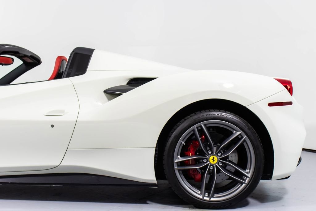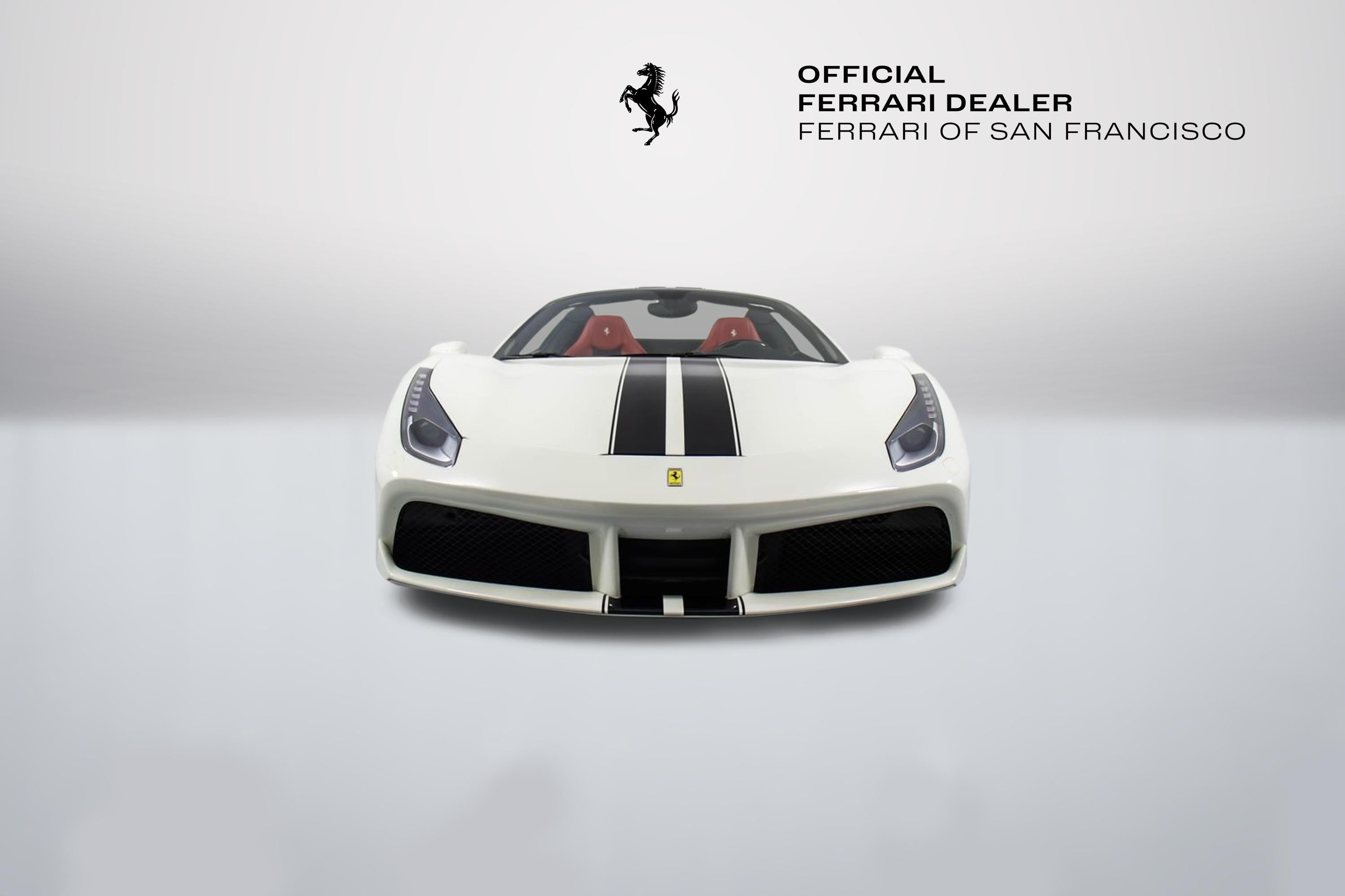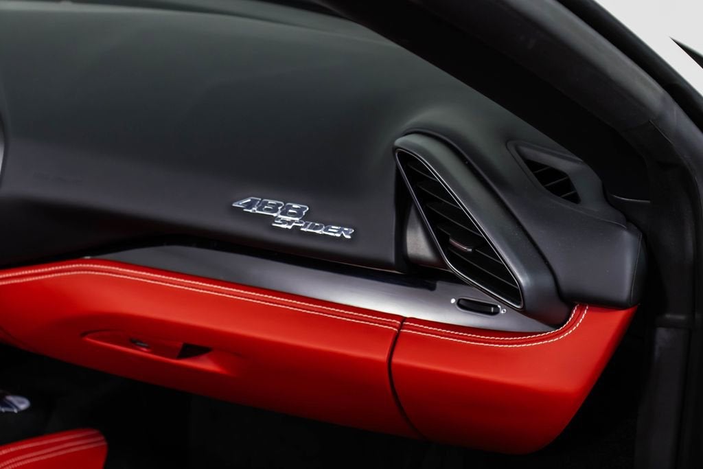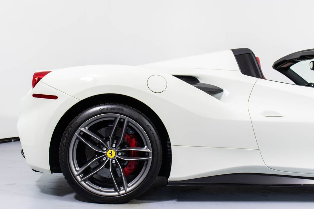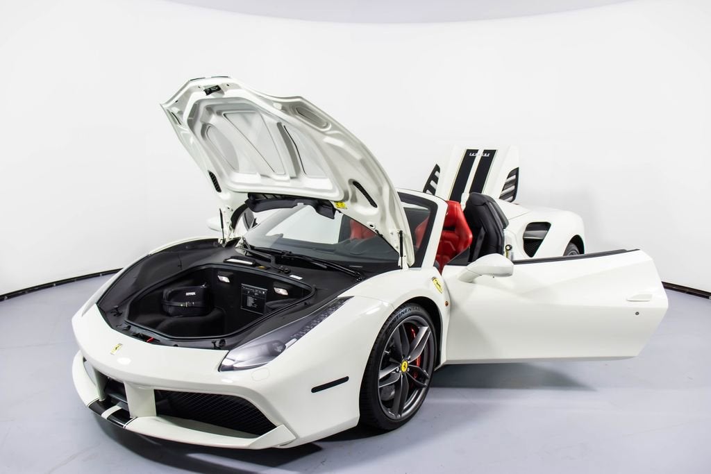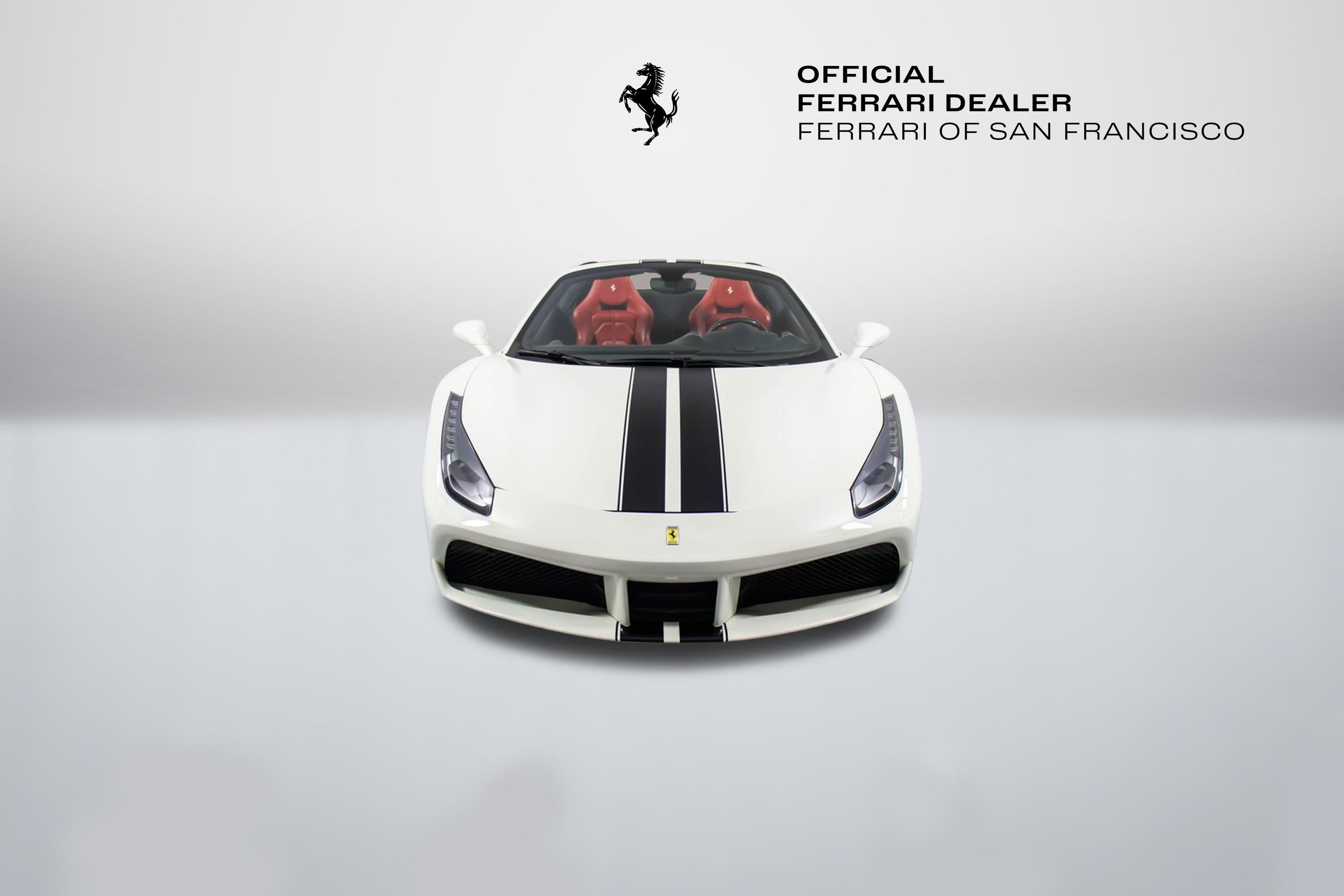 228613 Exterior: Bianco Avus Interior: Rosso Ferrari Mats: Nero 2017 Ferrari 488 Spider Options: Red Brake Calipers Cavallino Stitched on Headrest in Bianco Colored Mats with Logo Carb. Fib. Steering Wheel + LEDS 'Scuderia Ferrari' Shields Inn/Out Electr. Mirror + Home Link 20" Forged Dark Painted Rims White Rev Counter Gold rake Racing Seats Premium Hi-Fi System Colored Special Stitching O.R. in Bianco Finished in stunning Bianco Avus over a striking Rosso Ferrari interior, this 2017 Ferrari 488 Spider delivers an eye-catching combination of elegance and performance. The crisp white exterior is perfectly complemented by red brake calipers, Scuderia Ferrari shields, and 20-inch forged dark painted rims, giving it a bold and sporty presence. Inside, the cabin is a true drivers cockpit, featuring rare Goldrake racing seats, a white rev counter, and a carbon fiber steering wheel with integrated LEDs, all accented by Bianco contrast stitching and a matching Cavallino stitched on the headrests. Equipped with premium touches such as a high-end Hi-Fi system, HomeLink, and electrochromic mirrors, this 488 Spider offers both luxury and everyday usability. Blending open-top exhilaration with iconic Ferrari styling, this beautifully specd example is the perfect balance of performance, craftsmanship, and unmistakable Italian flair.
