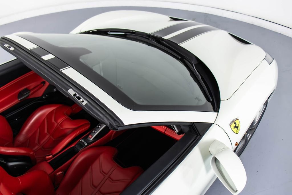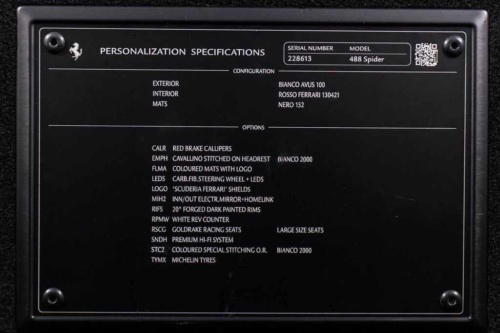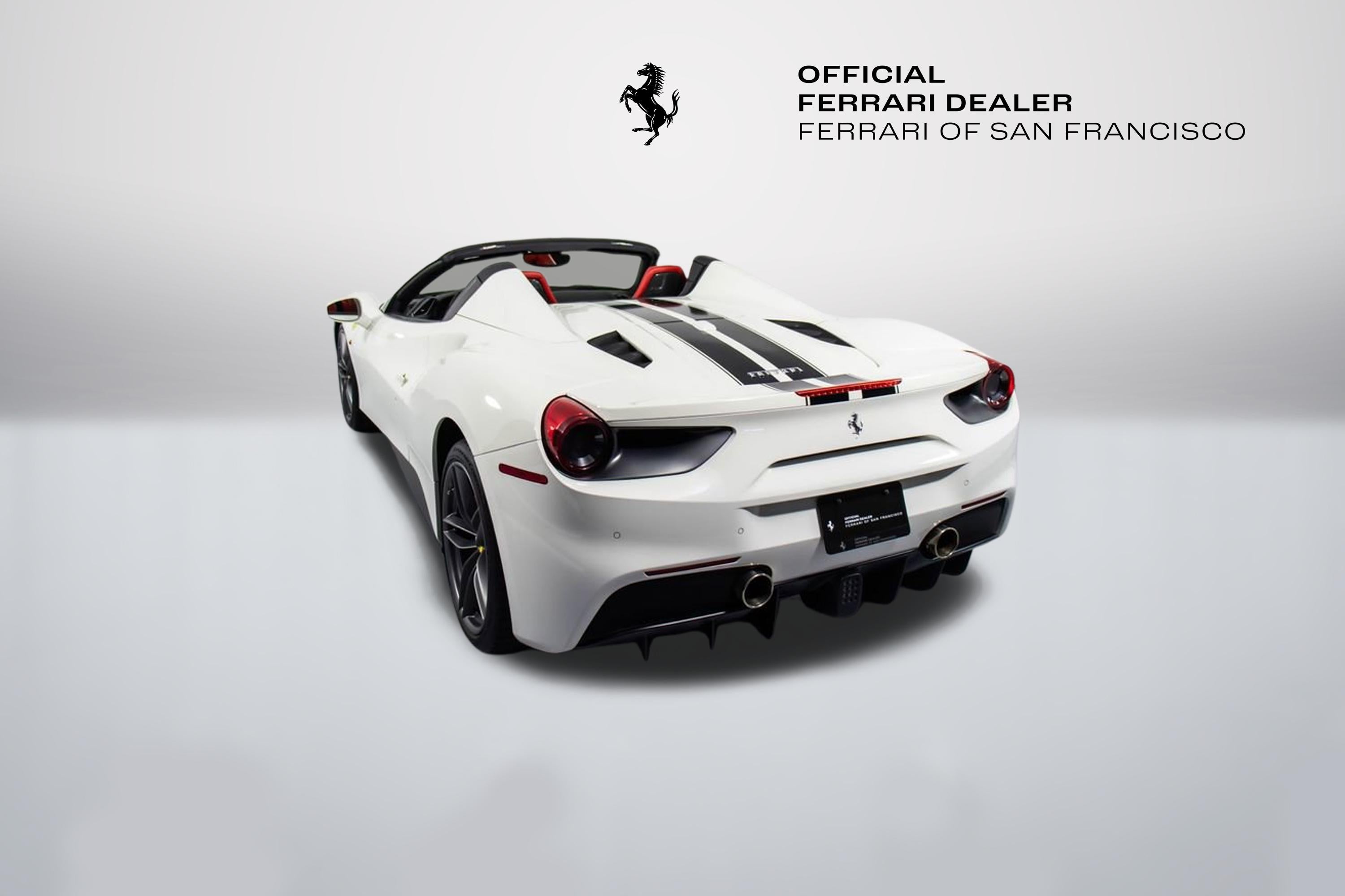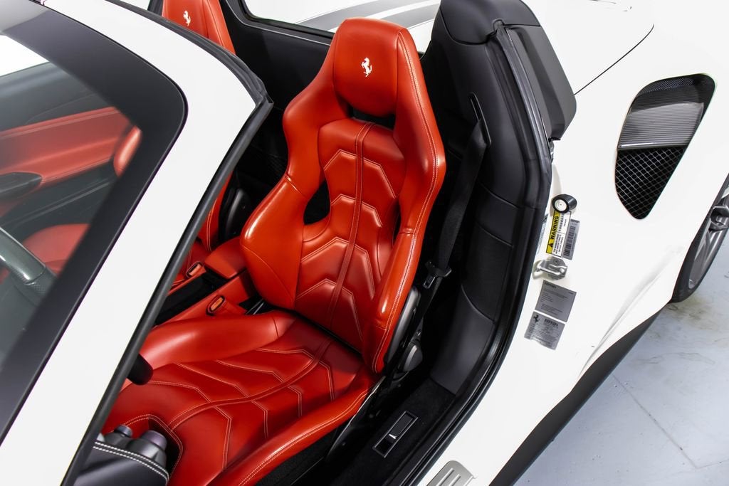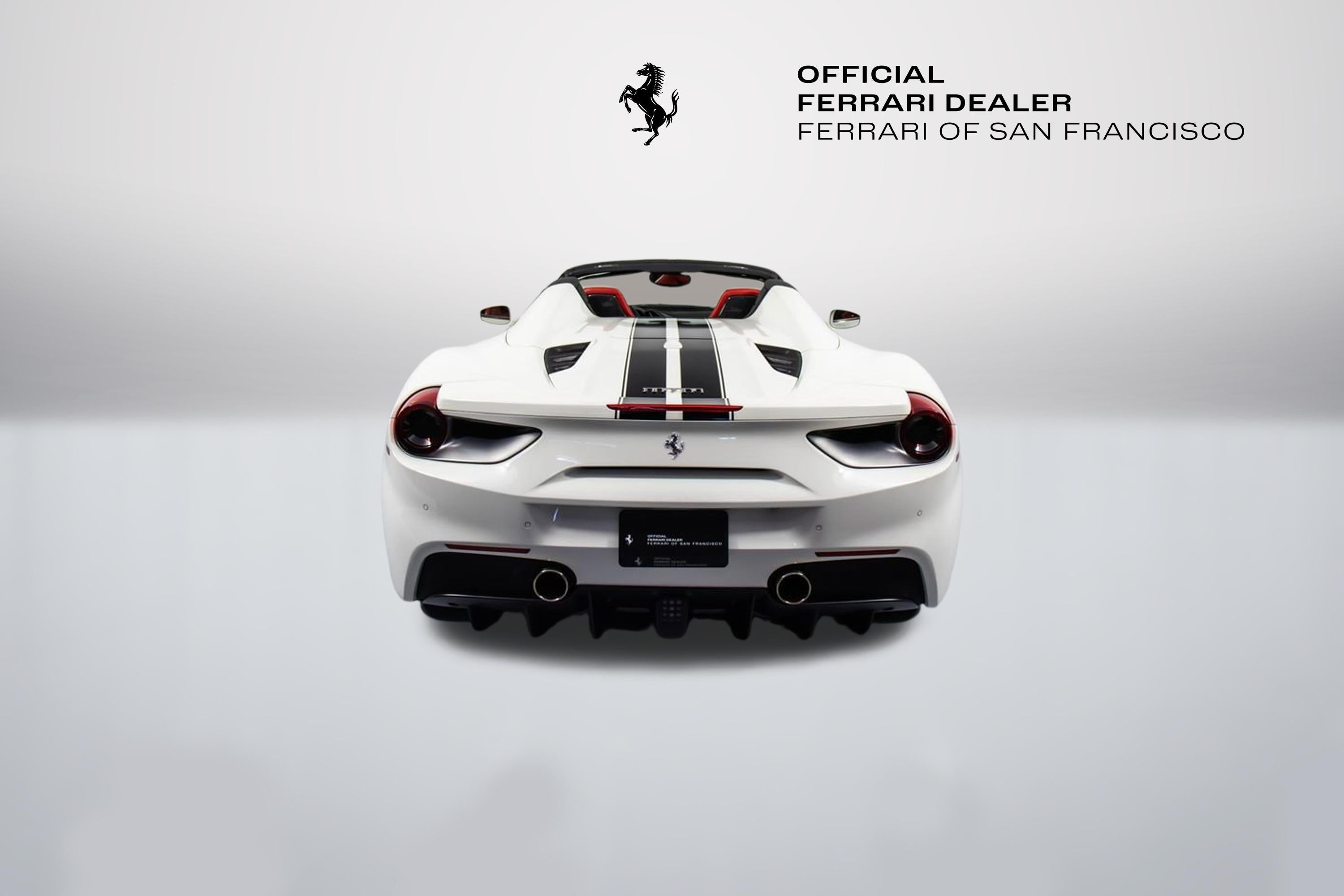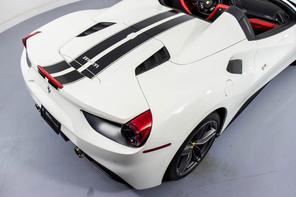 228613 Exterior: Bianco Avus Interior: Rosso Ferrari Mats: Nero 2017 Ferrari 488 Spider Options: Red Brake Calipers Cavallino Stitched on Headrest in Bianco Colored Mats with Logo Carb. Fib. Steering Wheel + LEDS 'Scuderia Ferrari' Shields Inn/Out Electr. Mirror + Home Link 20" Forged Dark Painted Rims White Rev Counter Gold rake Racing Seats Premium Hi-Fi System Colored Special Stitching O.R. in Bianco Finished in stunning Bianco Avus over a striking Rosso Ferrari interior, this 2017 Ferrari 488 Spider delivers an eye-catching combination of elegance and performance. The crisp white exterior is perfectly complemented by red brake calipers, Scuderia Ferrari shields, and 20-inch forged dark painted rims, giving it a bold and sporty presence. Inside, the cabin is a true drivers cockpit, featuring rare Goldrake racing seats, a white rev counter, and a carbon fiber steering wheel with integrated LEDs, all accented by Bianco contrast stitching and a matching Cavallino stitched on the headrests. Equipped with premium touches such as a high-end Hi-Fi system, HomeLink, and electrochromic mirrors, this 488 Spider offers both luxury and everyday usability. Blending open-top exhilaration with iconic Ferrari styling, this beautifully specd example is the perfect balance of performance, craftsmanship, and unmistakable Italian flair.
