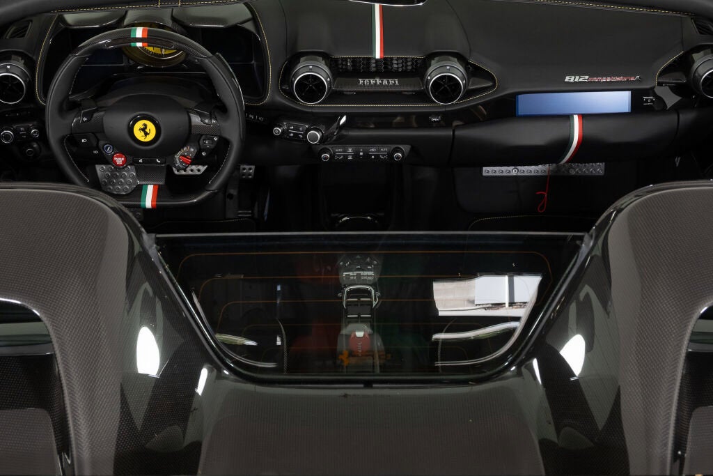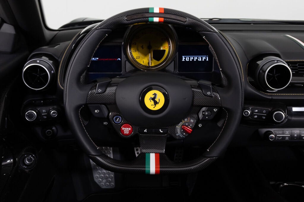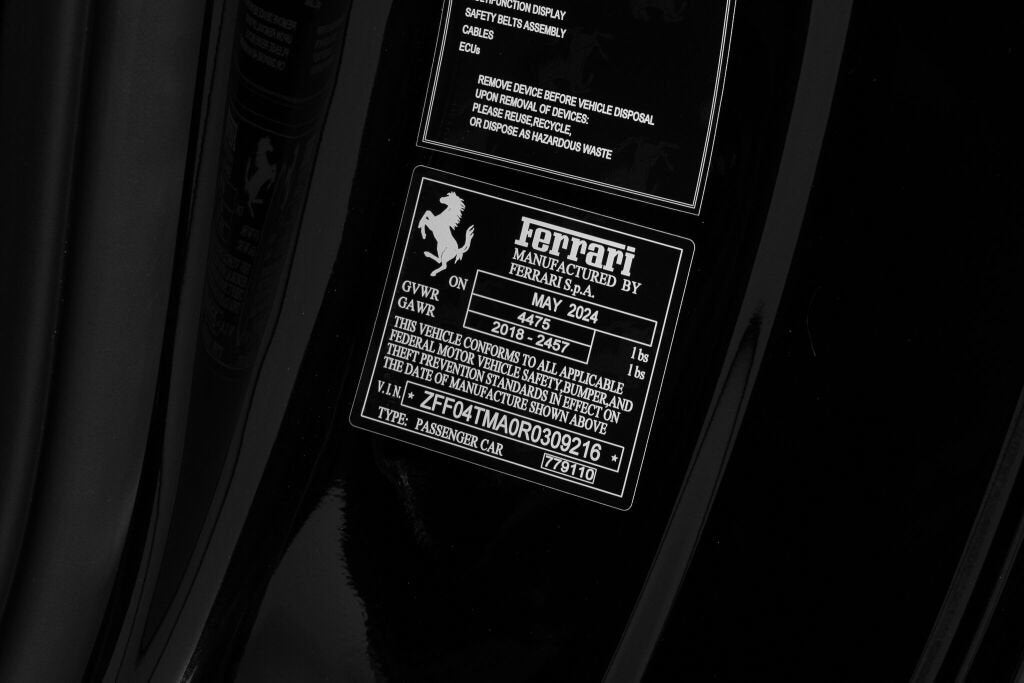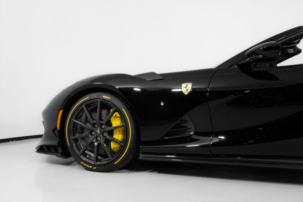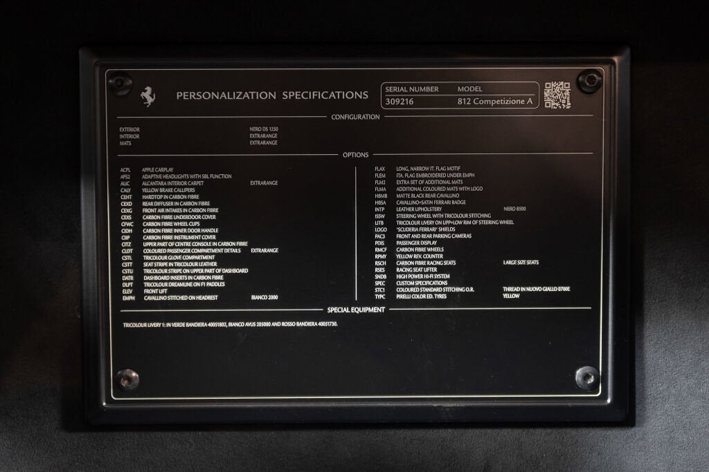 Ferrari Westlake is thrilled to present this 2024 Ferrari 812 Competizione Aperta finished in Nero, proudly featuring a factory painted Tricolore Livery and is highlighted with an abundance of Carbon Fiber and Tricolore details. Offered from single ownership and only 54 miles from new, this 812 variant represents an ultra-exclusive open-top supercar experience with just 599 examples produced worldwide. The 812 Competizione Aperta is the ultimate open-roof expression of Ferrari’s front-engine V12 lineage: a 6.5-liter naturally aspirated V12 delivering 830 cv (819 hp) at stratospheric revs, paired with a 7-speed F1 dual-clutch gearbox and rear-wheel drive. Benchmark performance is staggering, with a ~2.8 seconds 0 60 time and over 211 mph top speed, aided by advanced chassis systems including rear-wheel steering (Virtual Short Wheelbase 2.0) and the latest Side Slip Control. The removable carbon-fiber roof panels complete an experience that is as visceral as it is rare. Tricolore Livery - LIV1 Yellow Brake Calipers - CALY Hardtop in Carbon Fiber - CEHT Rear Diffuser in Carbon Fiber- CEXD Carbon Fiber Rims - RMCF Pirelli Color Edition (Yellow) - TYPC Front Air intakes in Carbon Fiber - CEXG Carbon Fiber Underdoor Cover - CEXS Carbon Fiber Wheel Caps - CFWC Long & Thin Italian Flag - FLAX Matte Black Rear Cavallino - HBMB Cavallino+ Ferrari Badge in Satin - HBSA 'Scuderia Ferrari' Shield - LOGO Adaptive Front Headlight System - AFS2 Suspension Lifter - ELEV Carbon Fiber Racing Seats (L) - RSCH Racing Seat Lifter- RSES Alcantara Carpet - ALIC Leather Upholstery - INTP Yellow Stitching - STC1 Carbon Fiber Inner Door Handle - CIDH Carbon Fiber Instrument Cover - CIIP Upper Part of Center Console in Carbon Fiber - CITZ Colored Passenger Compartment Detail - CLDT Tricolore on Glove Compartment - CSTL Seatstripe in Tricolore Leather - CSTT Tricolore Stripe on Upper Part of Dashboard - CSTU Dashboard Inserts in Carbon - DATR Tricolore Dreamline on F1 Paddles - DLPT Embroidered Cavallino on Headrest in White - EMPH Embroidered Tricolore on Headrest - FLEM Steering Wheel with Tricolore Stitching- ISSW Tricolore Livery on Upper & Lower Steering Wheel Rim - LITB Yellow Rev Counter - RPMY Passenger Display - PDIS Apple CarPlay - ACPL High Power HiFi System - SNDB Colored Floormats with Logo - FLMA Extra Set of Floormats - FLM2 Front & Rear Parking Sensors - PAC3 The Original Ferrari Manufacturer Warranty is active through October 29th, 2027. The 7-Year Genuine Maintenance Program provides complimentary annual servicing through October 29th, 2031. Please contact our Ferrari Westlake sales team with any questions or to schedule a viewing in the showroom.