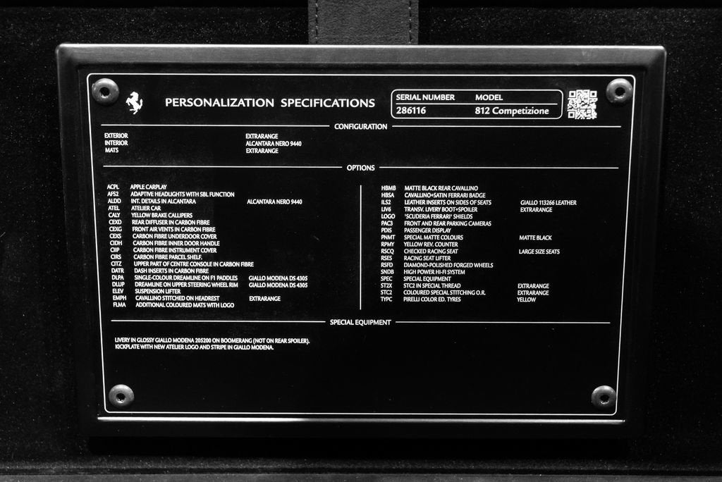 Ferrari of Lake Forest is Proud to Present this Certified Pre Owned 2022 Ferrari 812 Competizione Finished in Extra Range Nero Opaco over Nero Alcantara Interior. This Ferrari 812 Competizione is Optionally Equipped with: Adaptive Front Headlights with SBL function Giallo Brake Calipers Livery in Glossy Giallo Fly on Boomerang not on rear spoiler Rear Diffuser in Carbon Fiber Front Air Vents in Carbon Fiber Carbon Fiber Under Door Cover Suspension Lifter Matte Black Cavallino Cavallino and Satin Ferrari Badge Scuderia Ferrari Shields Forged Wheels Finished in Satin Black Pirelli Colored Tires in Giallo Apple CarPlay Interior Details in Alcantara Nero Carbon Fiber Inner Door Handle Carbon Fiber Instrument Cover Carbon Fiber Parcel Shelf Upper Part of Center Console in Carbon Fiber Dashboard Inserts in Carbon Fiber Single Color Dreamline on F1 Paddles in Giallo Modena Dreamline on Upper Steering Wheel Rim in Giallo Modena Cavallino Stitched on Headrest in Extra Range Scuderia Ferrari Shield Colored Mats with Logo Leather Inserts on Seat Sides in Giallo Leather Passenger Display Giallo Rev Counter Checked Racing Seat in Large Racing Seat Lifter High Power HiFi System Colored Special Stitching in Extra Range Giallo and Nero The Ferrari 812 Competizione is what happens when Ferrari looks at the already bonkers 812 Superfast and says, No. Not mad enough. So they take the V12, remove what little restraint it had left, and wind it all the way up to 9,500 rpm. At full chat it does not make a noise so much as it detonates the surrounding countryside. Birds fall out of trees. Small children suddenly learn Italian. Then Ferrari deletes the rear window and replaces it with a panel covered in vortex generators, because clearly seeing out is far less important than sticking to the road like a caffeinated gecko. This tells you everything. It is lighter, angrier, sharper, and about as subtle as a chainsaw in a library. A front-engined Ferrari that behaves like a track car, screams like an F1 car, and feels like it might try to kill you if you show it even a hint of disrespect. In other words, it is completely, utterly magnificent. The Certified Pre Owned Coverage is Included in our Asking Price. For more information on this Ferrari 812 Competizione call one of our Ferrari Specialists today at 847.295.6560