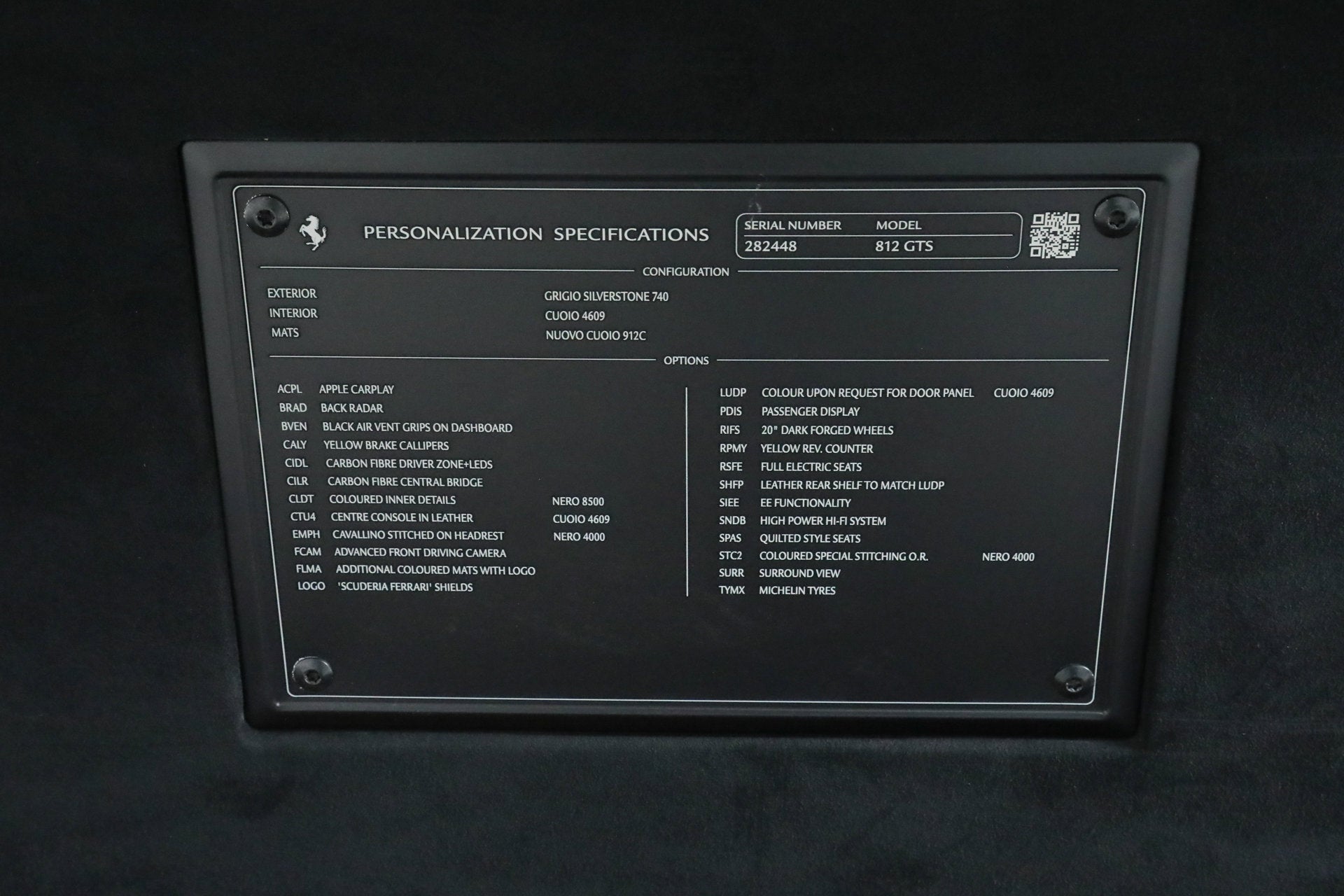 Ferrari 812 GTS - FERRARI CERTIFIED PRE-OWNED - AVAILABLE EXTENDED FERRARI WARRANTY - - Grigio Silverstone over Cuoio - ONE OWNER - Low Miles - Pristine Condition - Many Fine Options - Expertly Maintained by Authorized Ferrari Dealers - Available Extended Ferrari Warranty - Complimentary Ferrari Genuine Maintenance Service to 12/7/29 - Factory Options: - Carbon Fiber Driver Zone with LED Steering Wheel - Carbon Fiber Central Bridge - 20-inch Dark Forged Wheels - Yellow Brake Calipers - Scuderia Ferrari Shields - Full Electric Seats - Quilted Style Seats - Cavallino Stitched to Headrests in Nero - Special Stitching in Nero - Colored Inner Details in Nero - Leather Center Console in Cuoio - Leather Door Panels in Cuoio - Leather Rear Shelf in Cuoio - Carpets in Nuovo Cuoio - Passenger Display - High Power HiFi Sound System - Apple CarPlay - Surround View - Advanced Front Driving Camera - Rear Radar - Black Air Vent Grips on Dashboard - Yellow Rev Counter - Embroidered Mats with Logo If you are in the market for a Ferrari 812 GTS, please call or email us today. This Ferrari has passed a multi-point inspection performed by our factory trained technicians, and has been enrolled in the Ferrari Approved Certified Pre-Owned Program. The Certified program makes available up to two years of additional Ferrari Power Approved Warranty coverage. Please see dealer for more details.