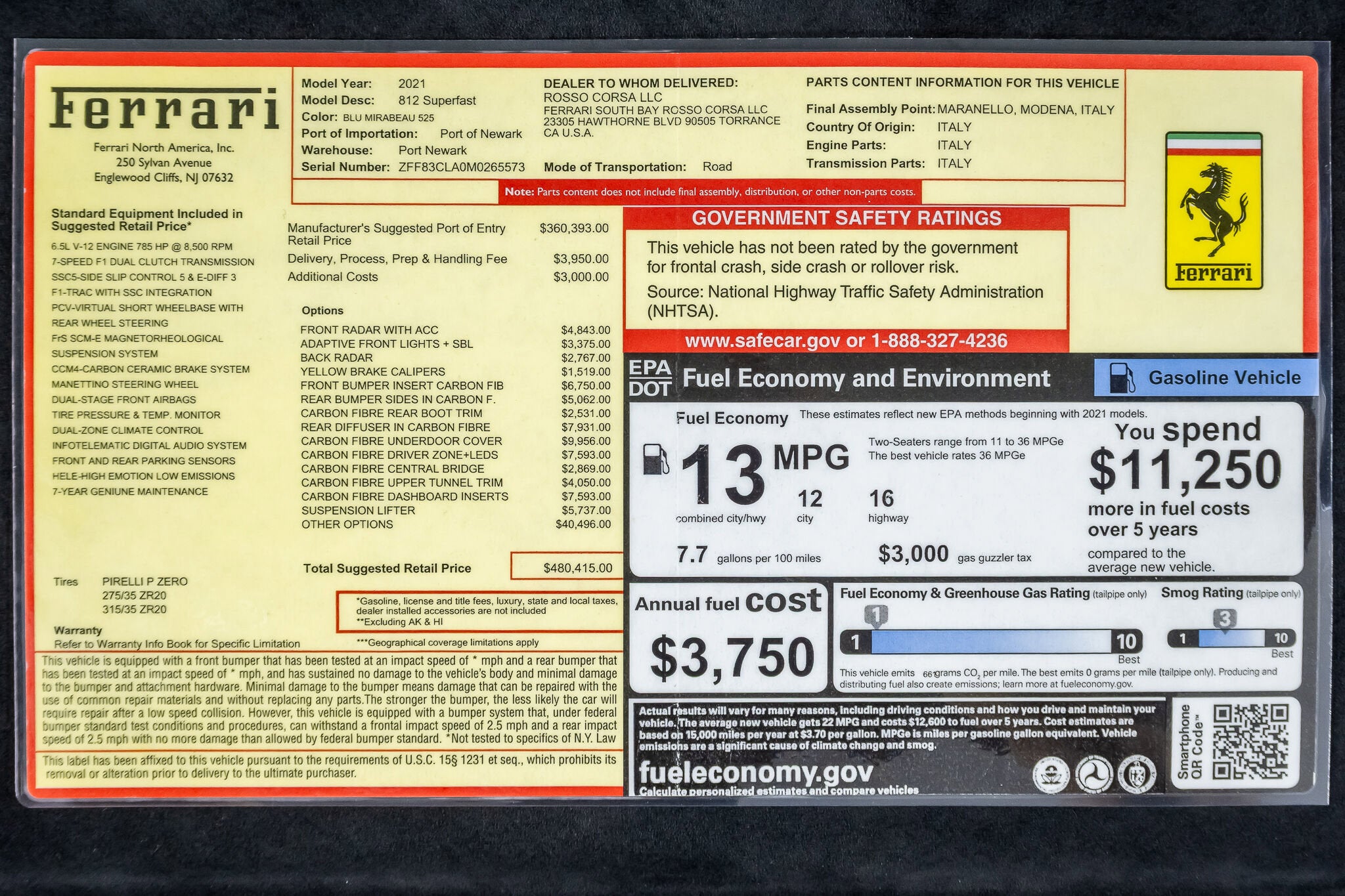 Ferrari South Bay is happy to bring to market present this beautiful Ferrari-Certified 812 Superfast painted in gorgeous Blu Mirabeau with a Nero Leather interior featuring Blue stitching. Equipped with a wide array of Carbon Fiber, this is a knockout 812 Superfast that'll stop traffic on Sunset or at the track! The exterior features very rare Blu Mirabeau paint with Scuderia Ferrari Shields on the front fenders, and 20-inch Forged Glossy Black wheels in front of Carbon Ceramic Brakes with Yellow Brake Calipers. Carbon Fiber finishes the Front Part of the Front Bumper, Front Spoiler, Rear Side Bumpers, Rear Boot Trim, Rear Diffuser, Underdoor Cover. Paint Protection Film covers the entire car, including the headlights and side-view mirrors, so your investment will remain gorgeous for years to come! Ferrari have built their reputation around their engines, and the 812 Superfast is a stunning example, equipped with a 6.5-liter naturally aspirated V12 engine which delivers a staggering 789 horsepower and 530 lb-ft of torque. This powerhouse enables the 812 Superfast to accelerate from 0 to 60 mph in just 2.8 seconds and reach a top speed of over 210 mph, making it one of the fastest production cars in the world. The engine is mated to a seven-speed dual-clutch automatic transmission, providing lightning-fast gear changes for a truly sensational driving experience, all accompanied by the signature wail of a it's high-revving V12. Inside you'll find traditional Nero Leather throughout the cabin, accented with Blue Stitching (including the Cavallinos embroidered on the headrests of the Diamond-Stitched Seats). Tasteful customizations include the Carbon Fiber Driving Zone, which provides Carbon Fiber for the instrument binnacle, F1 Shift Paddles and Steering Wheel (which is equipped with Ferrari's Signature LED Shift Lights) and Carbon Fiber Dash Inserts and Upper Central Console and Console Bridge. When traffic won't allow you to exploit its mighty V12, there is a JBL Premium High Power Audio System with Satellite Radio to provide an alternate soundtrack, while the Passenger Display keeps your copilot involved in the fun. The Adaptive Front Lighting System and Surround View Camera assist the driver in tight maneuvers, while the Suspension Lifter will help with steep driveways and other road irregularities. This 812 Superfast is offered complete with all original books, tools, tire inflation device, battery tender and original indoor cover. The car is currently covered by Ferrari's Genuine Warranty through July 20, 2026, and Ferrari's 7-Year Genuine Maintenance Program extends until July 20, 2028. If you'd like to know more about this fantastic 812 Superfast, please reach out to our knowledgeable sales staff. Ferrari South Bay is proudly part of Holand Automotive Group, one of North America’s leading luxury automotive retailers. We offer nationwide shipping, trade-in opportunities, financing, client consignments, and world-class delivery service. Contact us today to explore ownership of this remarkable. Please visit us at 23305 Hawthorne Blvd, Torrance, CA 90505, or call us at (888) 578-8767.