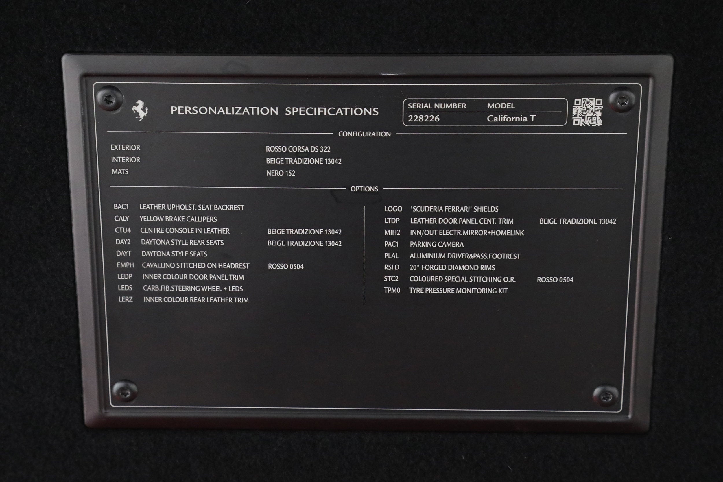 Ferrari California T - FERRARI CERTIFIED PRE-OWNED - AVAILABLE EXTENDED FERRARI WARRANTY - - Rosso Corsa over Beige - Excellent Condition - Many Fine Options - Expertly Maintained by Authorized Ferrari Dealers - Available Extended Warranty and Maintenance Plans - Factory Options: - Carbon Fiber LED Steering Wheel - 20-inch Forged Diamond Wheels - Yellow Brake Calipers - Scuderia Ferrari Shields - Daytona Style Seats - Daytona Style Rear Seats - Cavallino Stitched to Headrests in Rosso - Special Stitching in Rosso - Leather Center Console in Beige - Leather Door Panel Trim in Beige - Leather Door Panel Center Trim in Beige - Leather Upholstered Seat Backrests - Leather Rear Trim in Beige - Inner and Outer Electrochromic Mirrors with HomeLink - Parking Camera - Aluminum Driver and Passenger Footrests - Tire Pressure Management System If you are in the market for a Ferrari California T, please call or email us today. This Ferrari has passed a multi-point inspection performed by our factory trained technicians, and has been enrolled in the Ferrari Approved Certified Pre-Owned Program. The Certified program makes available up to two years of additional Ferrari Power Approved Warranty coverage. Please see dealer for more details.