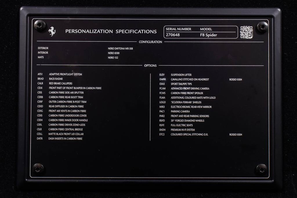 270648 Exterior: Nero Daytona Interior: Nero Mats: Nero 2022 Ferrari F8 Spider Options: Adaptive Front Light System Back Radar Red Brake Calipers Front Part of Front Bumper in Carbon Fiber Carbon Fiber Side Air Splitter Carbon Fiber Rear Boot Trim Outer Carbon-Fiber B-Post Trim Rear Diffuser in Carbon Fiber Front Air Vents in Carbon Fiber Carbon Fiber Under Door Cover Carbon Fiber Inner Door Handle Carbon Fiber Driver Zone + LEDS Carbon Fiber Central Bridge Matte Black Front Lid Collar Dash Inserts in Carbon Fiber Suspension Lifter Cavallino Stitched on Headrest in Rosso Sport Tailpipe Tips Advanced Front Driving Camera Carbon Fiber Front Spoiler Additional Colored Mats with Logo 'Scuderia Ferrari' Shields Electrochromic Rear-View Mirror Parking Camera Front and rear Parking Sensors 20' Forged Diamond Wheels Full Electric Seats Premium Hi-Fi System Colored Special Stitching O.R. in Rosso This 2022 Ferrari F8 Spider is a striking open-top supercar finished in deep Nero Daytona over a matching Nero interior, delivering an aggressive yet sophisticated presence. Accentuated by red brake calipers and Rosso contrast stitching with a Cavallino embroidered on the headrests, the cabin perfectly balances stealth and sport. Extensive carbon fiber detailingincluding the front bumper, side air splitters, rear diffuser, B-post trim, driver zone with LED steering wheel, central bridge, door handles, and dashboard insertshighlights its track-inspired engineering and lightweight focus. Riding on 20-inch forged diamond wheels and equipped with a suspension lifter, adaptive front lighting system, advanced front driving camera, and front and rear parking sensors, this F8 Spider offers both thrilling performance and everyday usability. Finished with Scuderia Ferrari shields, sport tailpipe tips, premium Hi-Fi system, and full electric seats, this beautifully optioned F8 Spider represents the pinnacle of Ferraris twin-turbo V8 performance in an exhilarating open-air configuration.