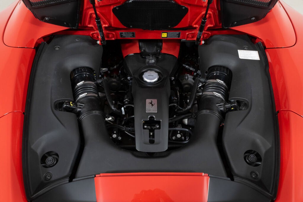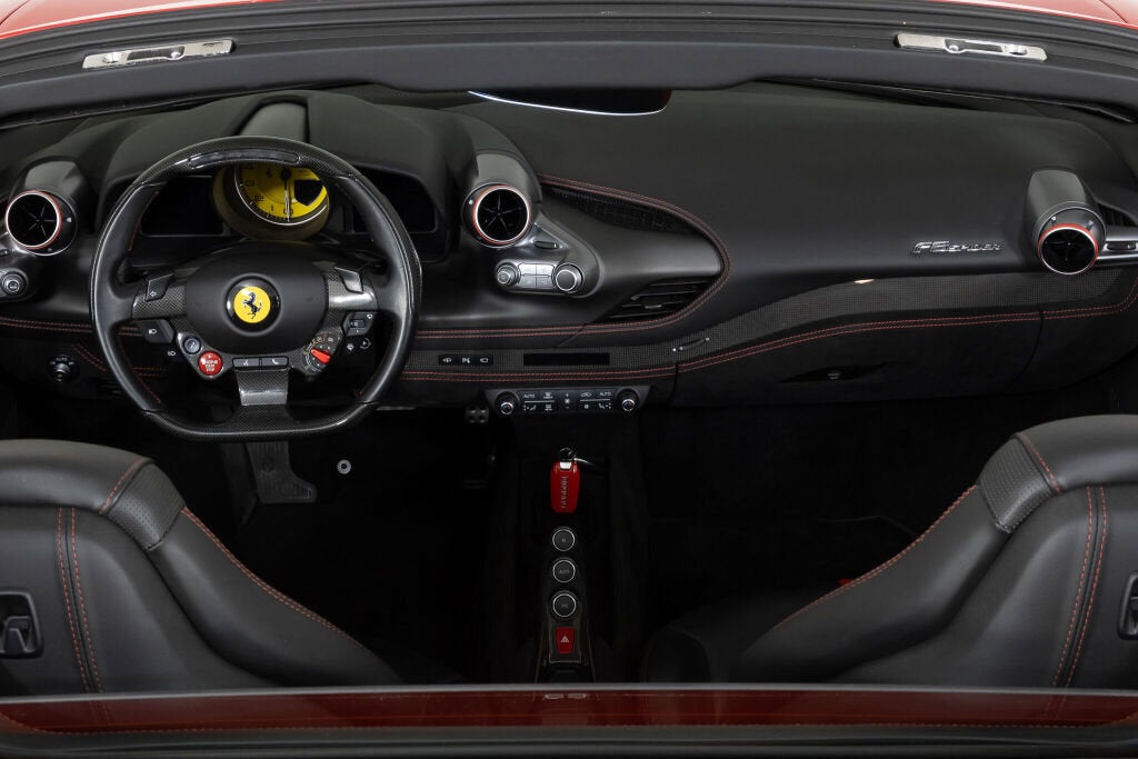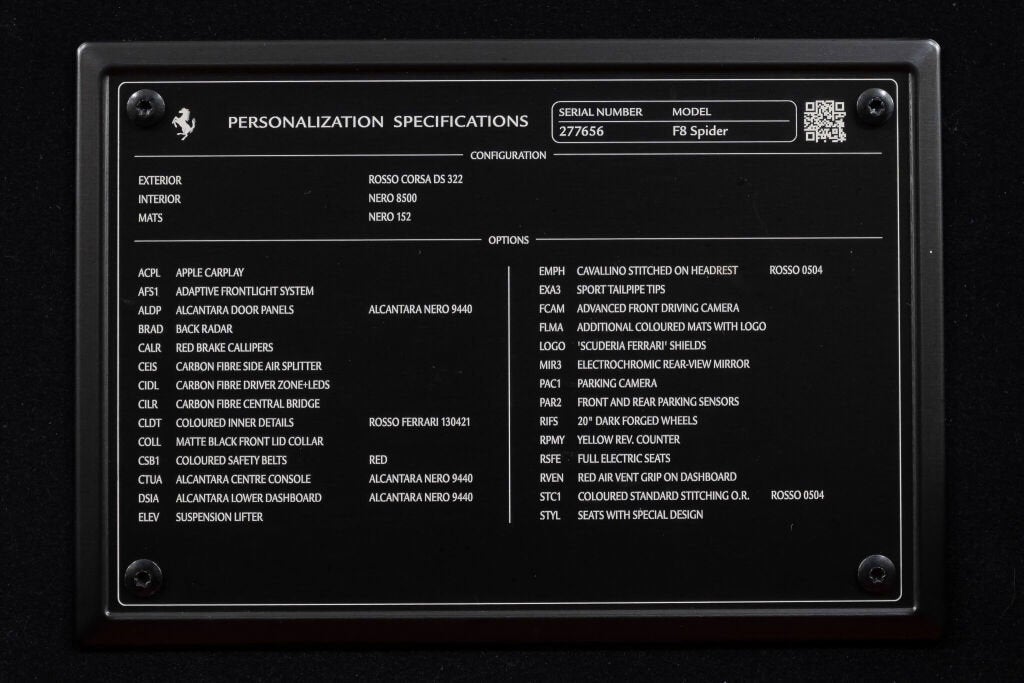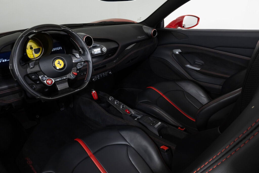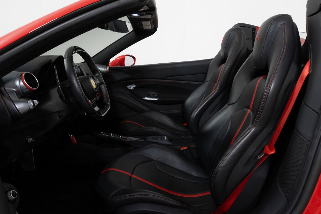 Ferrari Beverly Hills is proud to present this 2022 Ferrari F8 Spider, finished in Rosso Corsa over a black interior. Showing 5,663 miles, this locally owned Southern California example presents in excellent condition and is ready to find its next home. The Ferrari F8 Spider combines race-derived performance with open-air exhilaration, powered by a 710-horsepower twin-turbocharged 3.9-liter V8 winner of the International Engine of the Year award four years in a row. With a retractable hard top and a 0 to 60 mph time of 2.9 seconds, the F8 Spider offers thrilling acceleration and agility in a sleek, driver-focused package. As the last non-hybrid V8 Spider in Ferrari's lineage, it carries forward the spirit of models like the 488 and 458 with evolved aerodynamics and refined dynamics. In this particular F8 Spider, the Suspension Lifter improves ground clearance when needed, while carbon fiber in the driver zone and center bridge adds a motorsport-derived feel to the cabin. Apple CarPlay is included, along with front and rear parking sensors, a parking camera, and back radar, providing confidence when maneuvering in tighter environments. Dark forged wheels, red brake calipers, and Scuderia Ferrari shields complete a classic Rosso Corsa presentation. This F8 Spider is currently equipped with a Novitec exhaust system. The original exhaust system is included with the sale and can be fitted on the vehicle upon request. The 7-Year Genuine Maintenance Program provides complimentary annual servicing through June 13th, 2029. Please contact our sales team for more information about the availability of warranties and service contracts. Exterior Options Include: