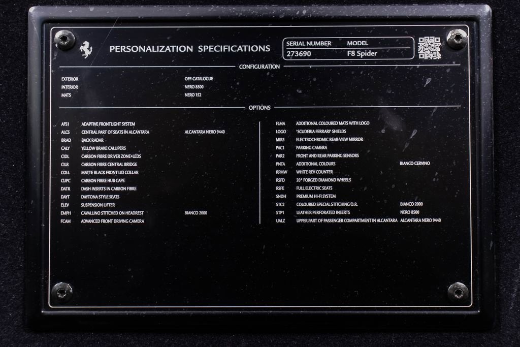 273690 Exterior: Bianco Cervino Interior: Nero Mats: Nero 2022 Ferrari F8 Spider Options: Adaptive Front Light System Central Part of Seats in Alcantara Back Radar Yellow Brake Calipers Carbon Fiber Driver Zone + LEDS Carbon Fiber Central Bridge Matte Black Front Lid Collar Carbon Fiber Hub Caps Dash Inserts in Carbon Fiber Daytona Style Seats Suspension Lifter Cavallino Stitched on Headrest in Bianco Advanced Front Driving Camera Additional Colored Mats with Logo 'Scuderia Ferrari' Shields Electrochromic Rear-View Mirror Parking Camera Front and Rear Parking Sensors Additional Colors in Bianco Cervino White Rev Counter 20" Forged Diamond Wheels Full Electric Seats Premium Hi-Fi System Colored Special Stitching O.R. in Bianco Leather Perforated Inserts in Nero Upper Part of Passenger Compartment in Alcantara Nero Finished in elegant Bianco Cervino over a Nero interior, this 2022 Ferrari F8 Spider blends open-top exhilaration with refined Italian craftsmanship. Its crisp white exterior is complemented by yellow brake calipers, Scuderia Ferrari shields, and 20-inch forged diamond wheels, while carbon fiber accentsincluding the driver zone with LED steering wheel, central bridge, hub caps, and dashboard insertshighlight its performance-focused design. Inside, Daytona-style seats with Alcantara center inserts, Bianco contrast stitching, and a white rev counter create a striking and cohesive cabin, further enhanced by Nero perforated leather and Alcantara throughout the upper passenger compartment. Equipped with a suspension lifter, adaptive front lighting system, advanced front driving camera, parking camera, and front and rear parking sensors, this F8 Spider offers both everyday usability and thrilling capability. Finished with a premium Hi-Fi system and full electric seats, this beautifully specified example delivers an unforgettable combination of power, luxury, and open-air Ferrari driving.