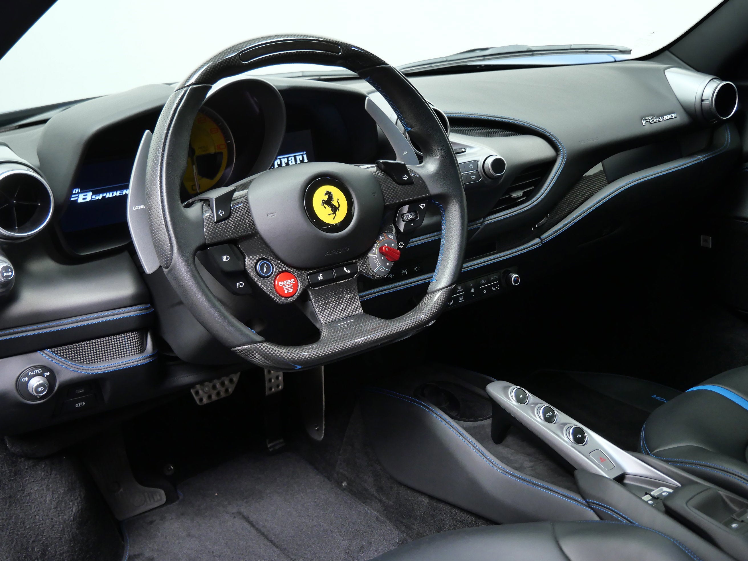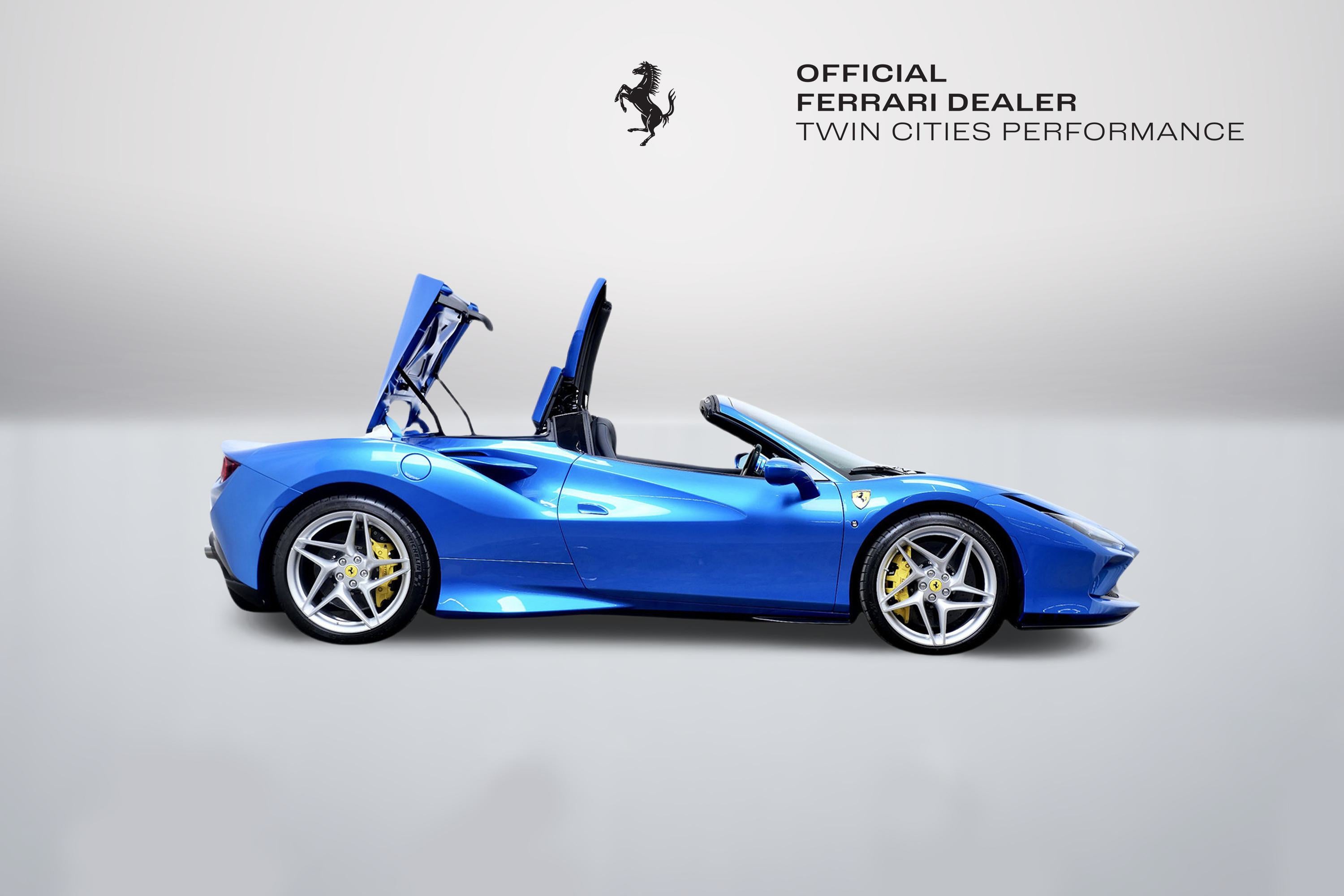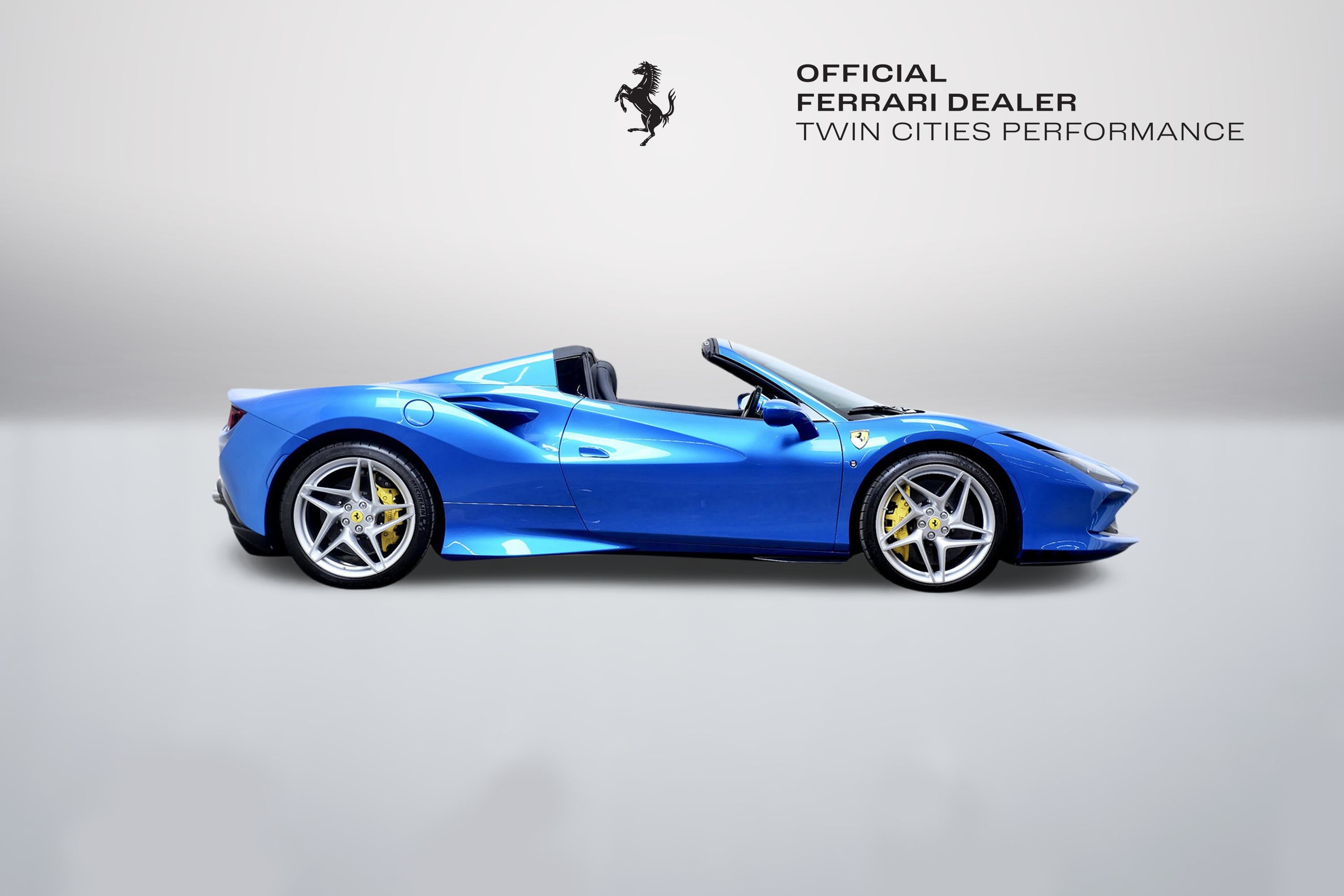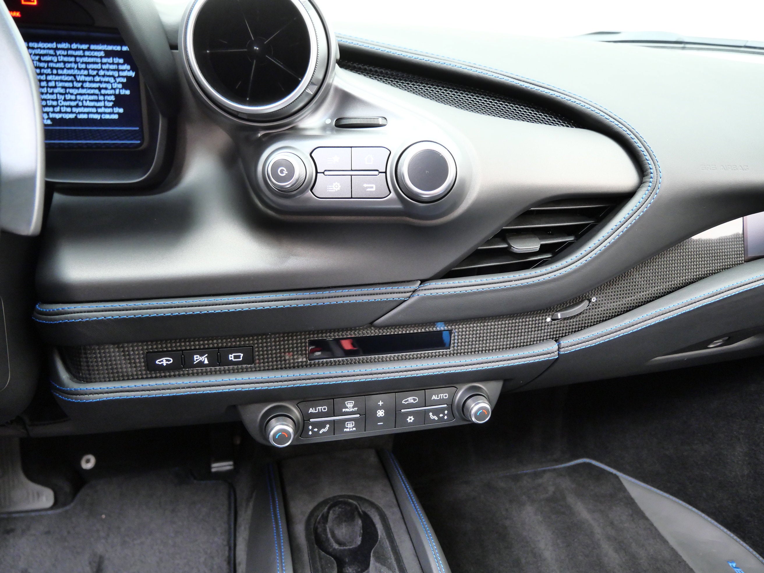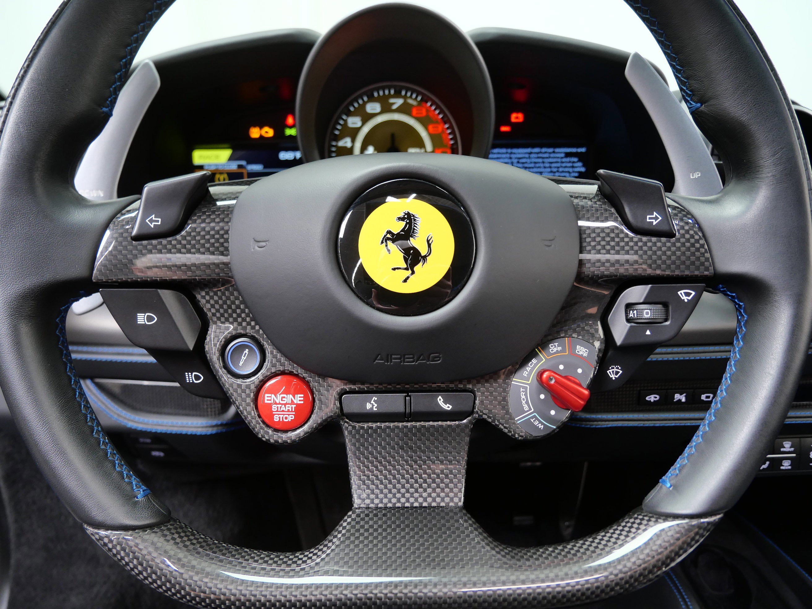 Ferrari Approved Certified Pre-Owned CPO Options: Blu Corso over Nero, Giallo Modena Brake Calipers, Carbon LED Steering Wheel, Scuderia Ferrari Shields, Passenger Display, Forged Wheels Brilliant Silver, Full Electric Seats, Leather Insert in Baby Blue, Mats with Logo, Embroidered Horse in Azzurro, Yellow Tachometer, Contrast Stitch in Azzurro, Style Seats, Apple CarPlay, Adaptive Frontlight System, Blind Spot Monitor System, Front Suspension Lift, Lane Departure Warning, Homelink Garage Door Opener, Electrochromic Mirrors, Rear Parking Camera, Front Parking Sensors, Premium Hifi Audio System. Blu Corsa 2023 Ferrari F8 Spider RWD 7-Speed Automatic 3.9L V8 Ferrari Approved Details: