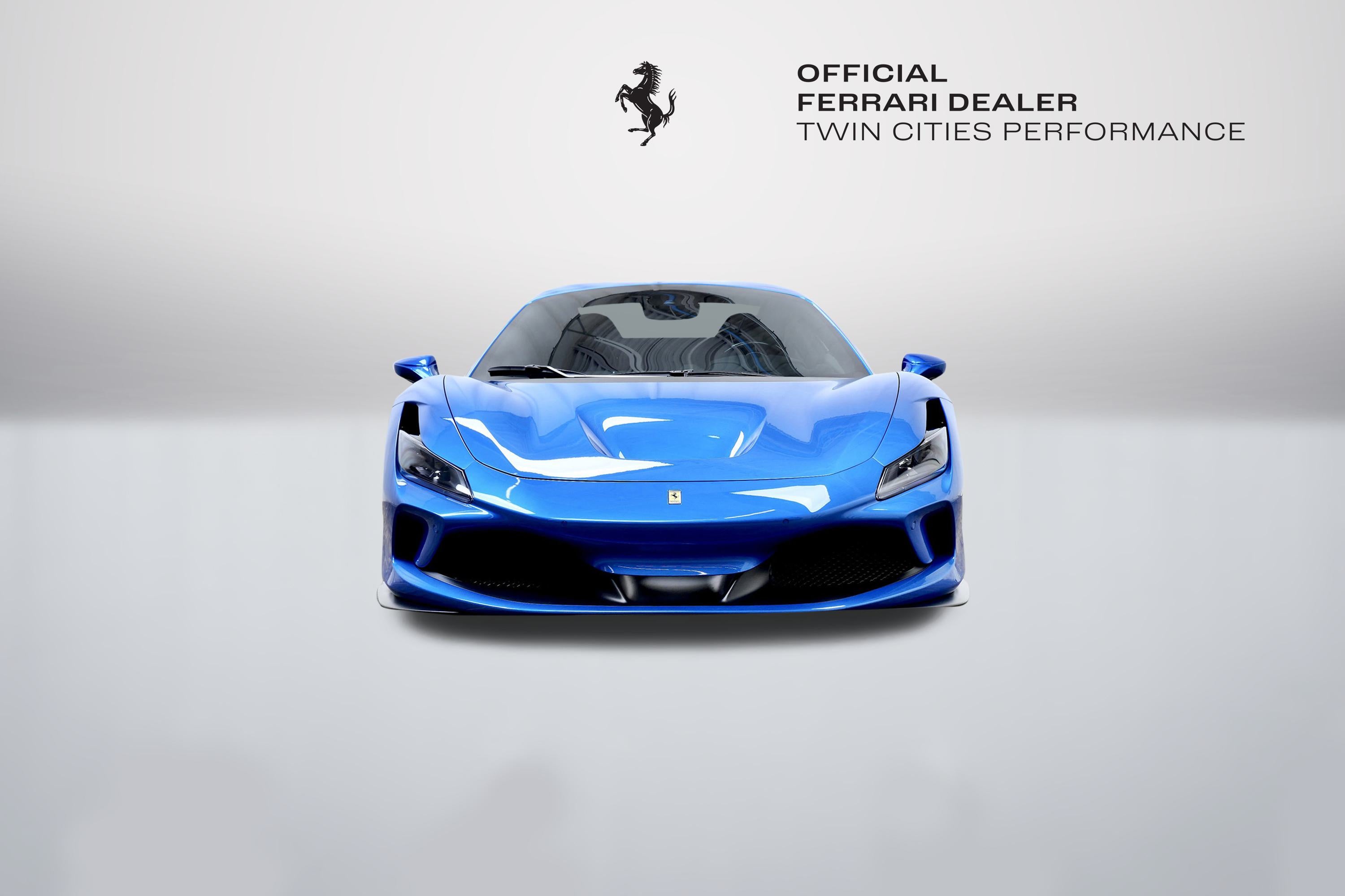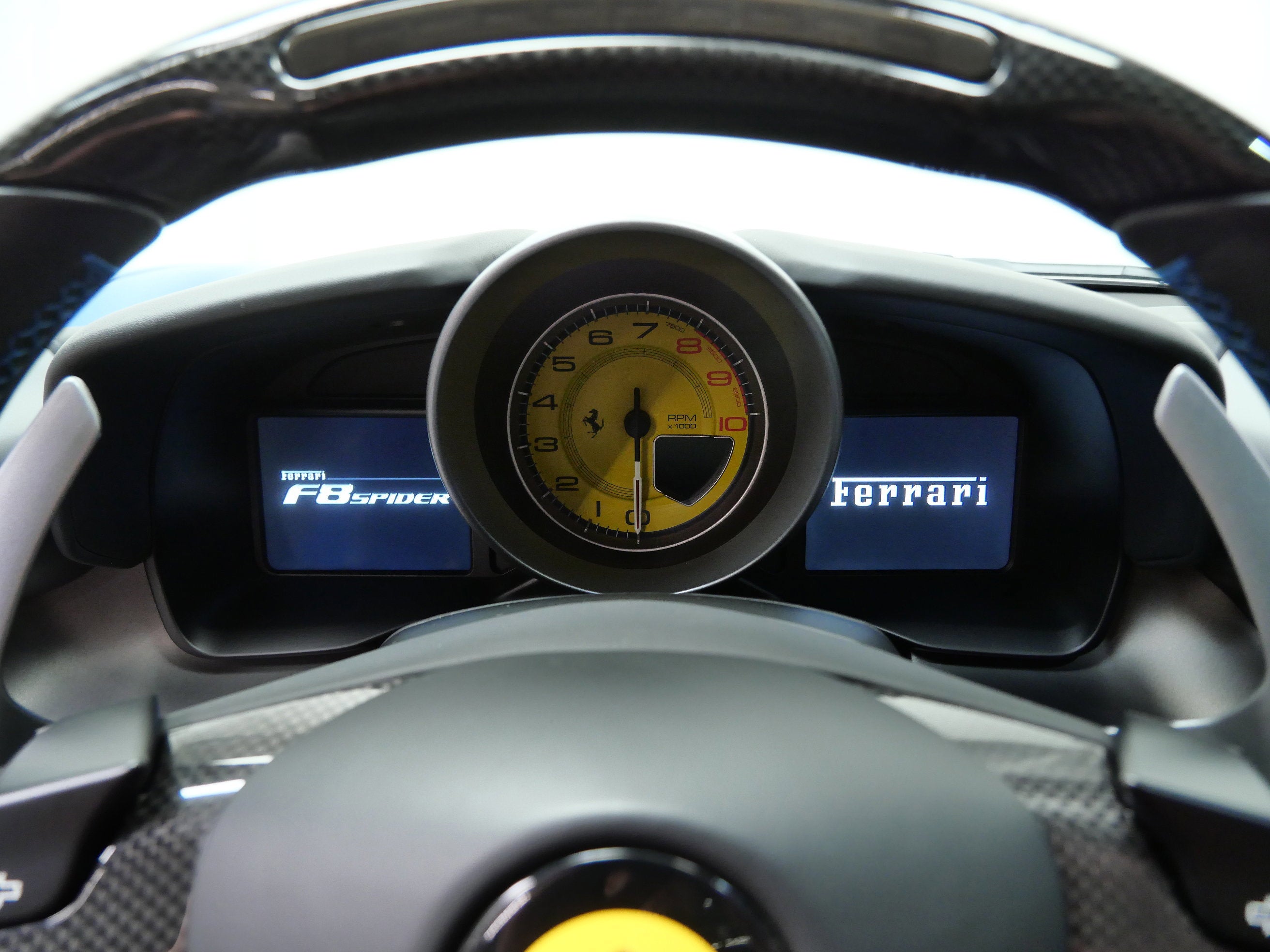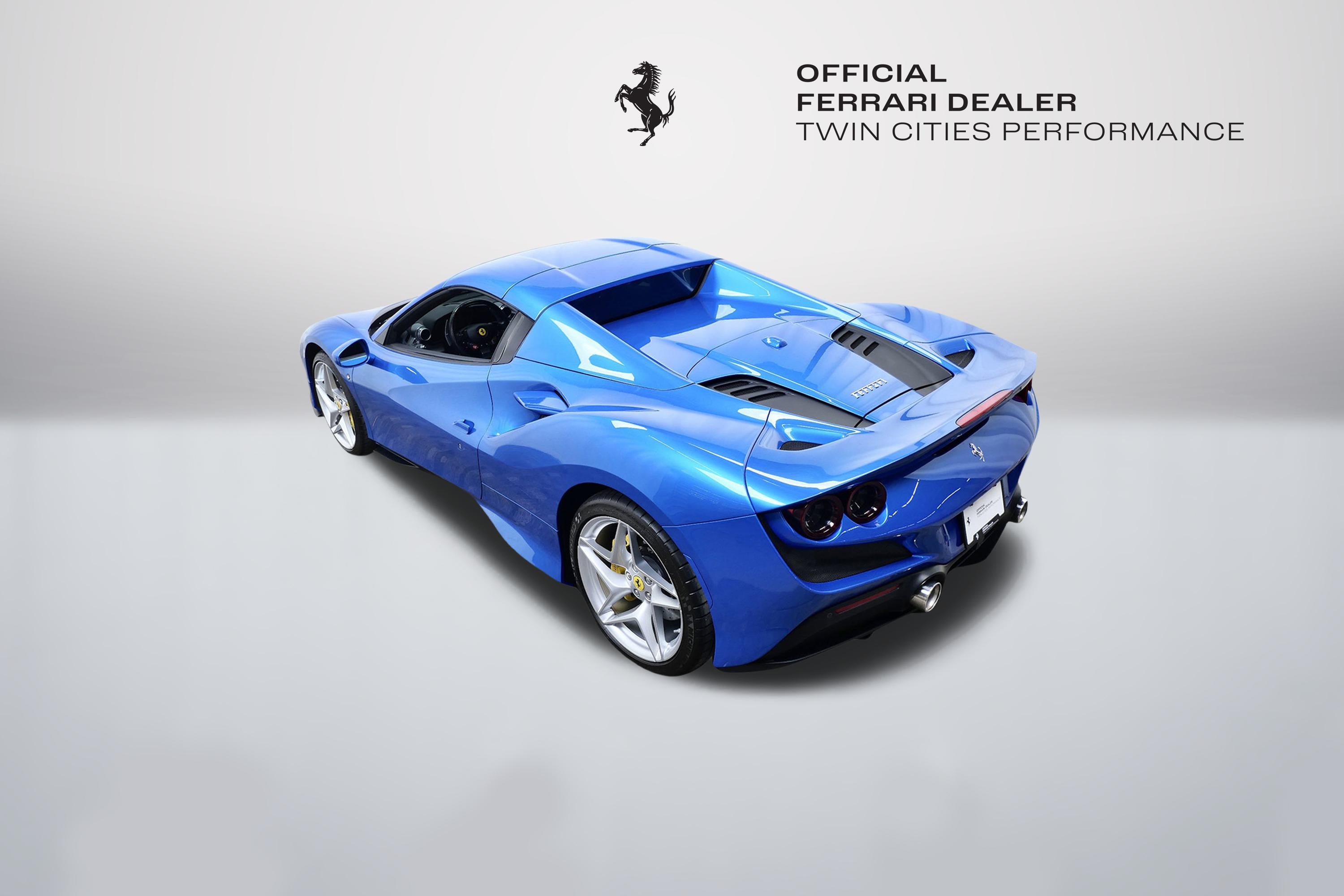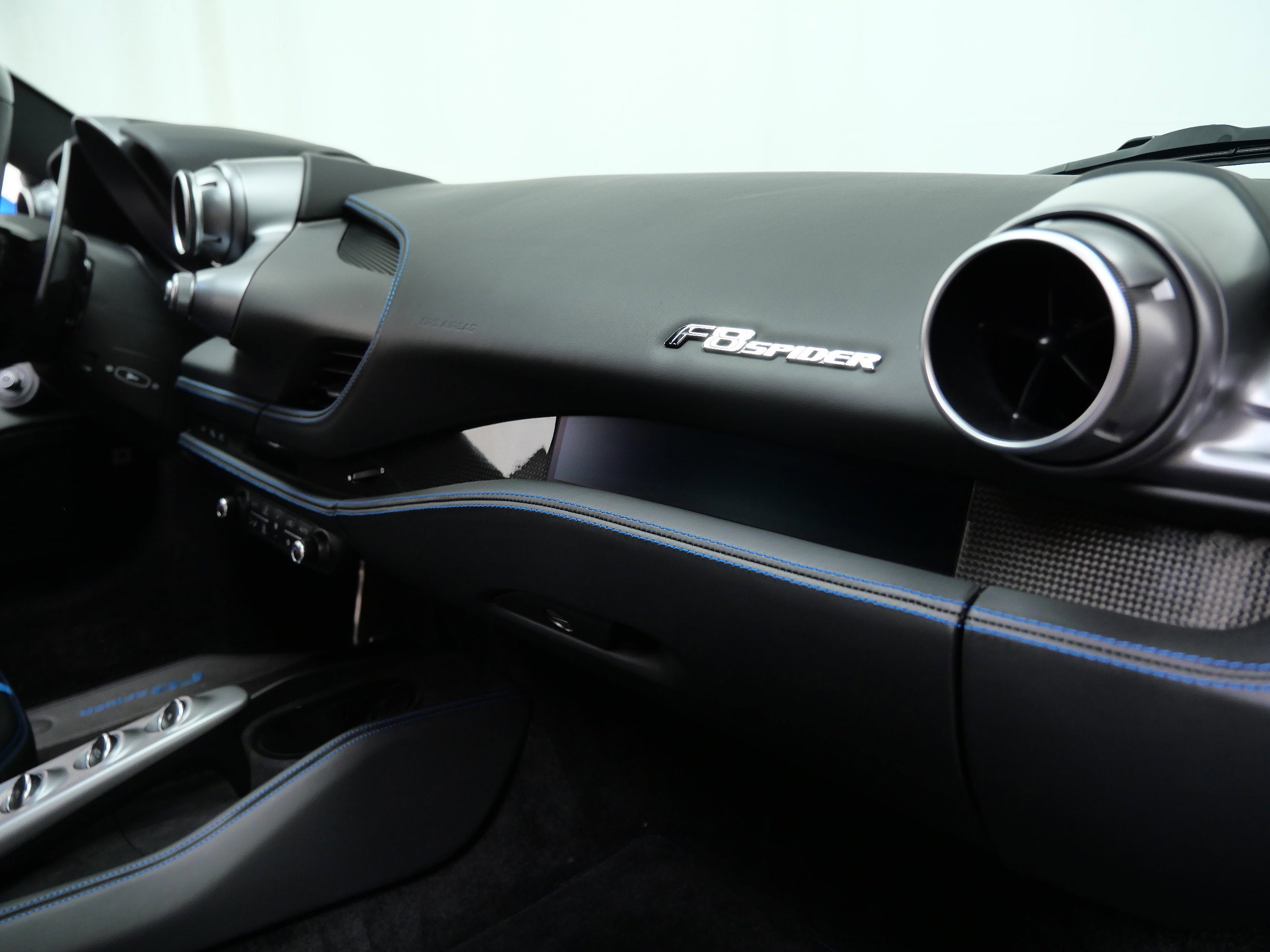 Ferrari Approved Certified Pre-Owned CPO Options: Blu Corso over Nero, Giallo Modena Brake Calipers, Carbon LED Steering Wheel, Scuderia Ferrari Shields, Passenger Display, Forged Wheels Brilliant Silver, Full Electric Seats, Leather Insert in Baby Blue, Mats with Logo, Embroidered Horse in Azzurro, Yellow Tachometer, Contrast Stitch in Azzurro, Style Seats, Apple CarPlay, Adaptive Frontlight System, Blind Spot Monitor System, Front Suspension Lift, Lane Departure Warning, Homelink Garage Door Opener, Electrochromic Mirrors, Rear Parking Camera, Front Parking Sensors, Premium Hifi Audio System. Blu Corsa 2023 Ferrari F8 Spider RWD 7-Speed Automatic 3.9L V8 Ferrari Approved Details: