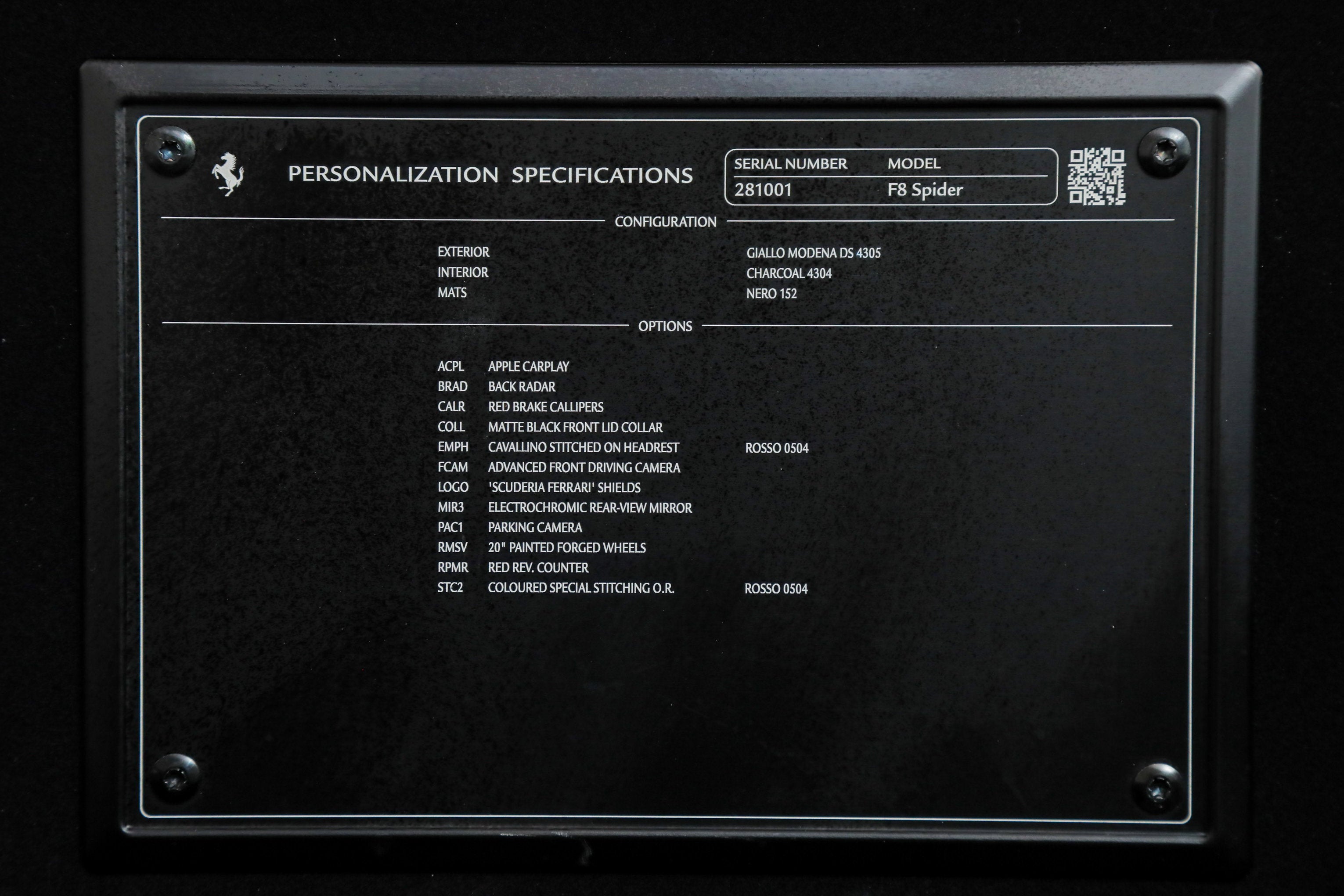 Ferrari F8 Spider - FERRARI CERTIFIED PRE-OWNED - EXTENDED FERRARI WARRANTY TO 8/19/27 - - Giallo Modena over Charcoal - ONE OWNER - Low Miles - Pristine Condition - Many Fine Options - Sold as New by Our Dealership - Expertly Maintained by Our Factory Trained Technicians - Extended Ferrari Warranty to 8/19/27 - Complimentary Ferrari Genuine Maintenance Service to 8/19/29 - Factory Options: - 20-inch Painted Forged Wheels - Red Brake Calipers - Scuderia Ferrari Shields - Cavallino Stitched to Headrests in Rosso - Special Stitching in Rosso - Apple CarPlay - Advanced Front Driving Camera - Parking Camera - Rear Radar - Electrochromic Rearview Mirror - Red Rev Counter - Matte Black Front Lid Collar If you are in the market for a Ferrari F8 Spider, please call or email us today. This Ferrari has passed a multi-point inspection performed by our factory trained technicians, and has been enrolled in the Ferrari Approved Certified Pre-Owned Program. The Certified program makes available up to two years of additional Ferrari Power Approved Warranty coverage. Please see dealer for more details.