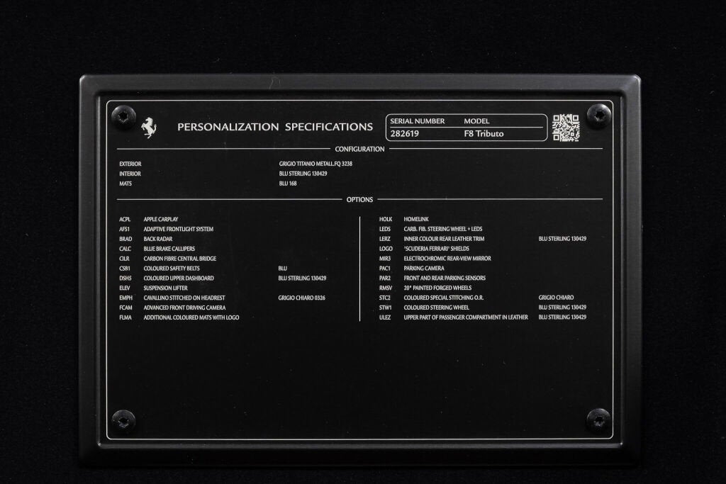 Ferrari Beverly Hills is proud to present this exceptional low-mileage 2022 Ferrari F8 Tributo, finished in Grigio Titanio Metallic over a Blu Sterling leather interior. Showing just 484 miles from new, this is a single-owner example that has remained in outstanding condition, reflecting careful ownership and limited use. The Ferrari F8 Tributo is a celebration of Ferrari’s iconic mid-engine V8 lineage, paying homage to decades of performance benchmarks set by models like the 308, F355, 458, and 488. Powered by a 710-horsepower 3.9-liter twin-turbocharged V8 voted International Engine of the Year four consecutive times the F8 delivers explosive performance with a 0 60 mph time of just 2.9 seconds. As the final non-hybrid mid-engine V8 Berlinetta, the F8 Tributo marks the end of an era, blending cutting-edge aerodynamics with purist driving feel in a form that honors its legendary predecessors. The Grigio Titanio paintwork gives the F8 a refined, elegant presence, complemented by Blue brake calipers and Scuderia Ferrari fender shields. The car sits on 20-inch forged wheels, while key usability features including the Suspension Lifter, front and rear parking sensors, parking camera, and Back Radar make it exceptionally well suited for real-world driving. Inside, the Blu Sterling leather cabin creates a distinctive and complimentary atmosphere, carried across the seats, dashboard, steering wheel, and upper passenger compartment. Apple CarPlay and Adaptive Headlights round out a well-balanced and highly desirable configuration. Ferrari's 2-Year Extended Warranty is active through November 10th, 2027. The 7-Year Genuine Maintenance Program provides complimentary annual servicing through November 10th, 2029. The Ferrari Approved 101-point Inspection has been completed, and the vehicle is eligible for a further warranty extension. Exterior Options Include: