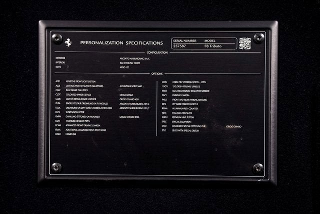 Ferrari of Long Island is proud to present this exceptional Ferrari F8 Tributo, finished in elegant Argento Nurburgring over a Blu Sterling interior with Grigio Chiaro contrasting stitching. This stunning specification perfectly complements the F8s sculpted, aerodynamic design and unmistakable Ferrari presence. Powered by a twin-turbocharged 3.9L V8 derived from Ferraris championship-winning racing program, the F8 Tributo delivers breathtaking performance with razor-sharp responsiveness and an unforgettable exhaust note. This example is further enhanced with blue brake calipers and 20-inch forged wheels in a matte Grigio Corsa finish, creating a refined yet aggressive stance. Titanium tailpipe tips add a purposeful finishing touch to the rear profile. Signature Scuderia Ferrari fender shields highlight the brands racing heritage, while the aluminum tachometer dial face adds a bespoke motorsport-inspired detail to the driver-focused cockpit. Inside, full electric seats ensure optimal comfort and adjustability, and embroidered Cavallino headrests in Grigio Chiaro elevate the cabins craftsmanship. Technology and convenience features include the Adaptive Front Lighting System, front and rear suspension lift for added practicality, a rear parking camera, and front parking sensors. The Premium Hi-Fi System provides exceptional sound quality to complement the thrilling performance experience. This Ferrari has passed a comprehensive multi-point inspection performed by our factory-trained technicians and has been enrolled in the Ferrari Approved Certified Pre-Owned Program. The Certified program makes available up to two years of additional Ferrari Power Approved Warranty coverage. Please contact us for more details or to schedule a private viewing.