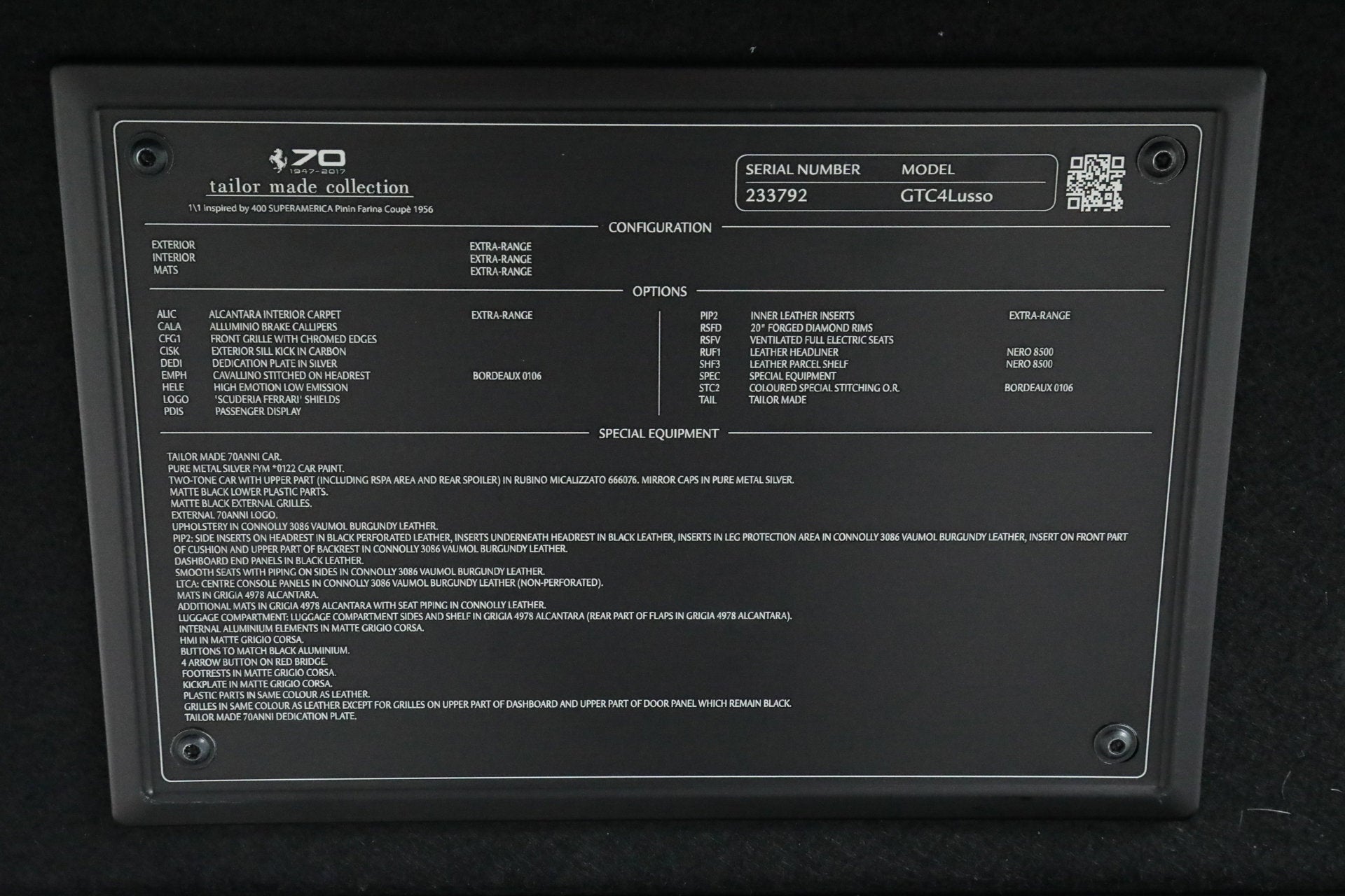 Ferrari GTC4Lusso V12 AWD - FERRARI 70 ANNI - TAILOR MADE - ONE OF ONE - - INSPIRED BY 1956 FERRARI 400 SUPERAMERICA PININ FARINA COUPE - - FERRARI CERTIFIED PRE-OWNED - FERRARI POWER WARRANTY TO 7/10/27 - - Pure Metal Silver and Rubino Micalizzato over Burgundy - Low Miles - Excellent Condition - Many Fine Options - Expertly Maintained by Authorized Ferrari Dealers - Ferrari Power Warranty to 7/10/27 - Special Equipment: - Pure Metal Silver Car Paint - Two-Tone Paint in Rubino Micalizzato - Mirror Caps in Pure Metal Silver - Matte Black Exterior Trims - Exterior 70 Anni Logo - Leather Upholstery in Connolly 3086 Vaumol Burgundy - Side Inserts on Headrests, Seat Inserts, Dashboard End Panels in Nero Leather - Seat Piping in Burgundy Leather - Center Console Panels in Burgundy Leather - Alcantara Carpets in Grigio - Additional Mats in Grigio Alcantara with Burgundy Piping - Luggage Compartment Sides and Shelf in Grigio Alcantara - Internal Aluminum Elements in Matte Grigio Corsa - Buttons to Match Black Aluminum - 4 Arrow Buttons on Red Bridge - Footrests in Matte Grigio Corsa - Kickplate in Matte Grigio Corsa - Interior Trims in Burgundy - Tailor Made 70 Anni Dedication Plate Factory Options: - 20-inch Forged Diamond Wheels - Aluminum Brake Calipers - Scuderia Ferrari Shields - Front Grill with Chromed Edges - Ventilated Full Electric Seats - Cavallino Stitched to Headrests in Bordeaux - Special Stitching in Bordeaux - Passenger Display - Leather Headliner in Nero - Leather Parcel Shelf in Nero If you are in the market for a Ferrari GTC4Lusso, please call or email us today. This Ferrari has passed a multi-point inspection performed by our factory trained technicians, and has been enrolled in the Ferrari Approved Certified Pre-Owned Program. The Certified program makes available up to two years of additional Ferrari Power Approved Warranty coverage. Please see dealer for more details.