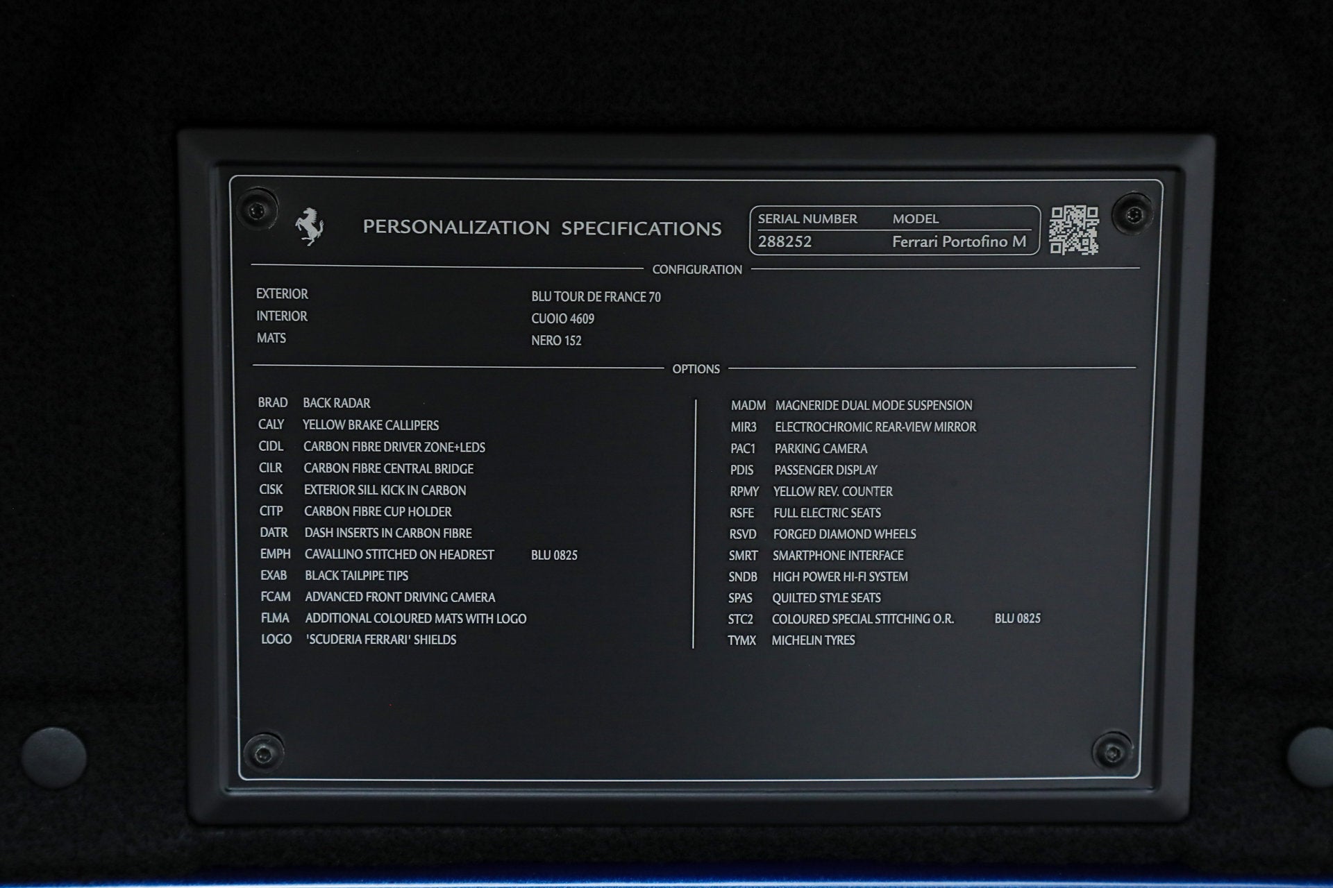 Ferrari Portofino M - FERRARI CERTIFIED PRE-OWNED - AVAILABLE EXTENDED FERRARI WARRANTY - - Blu Tour de France over Cuoio - Two Owners - Low Miles - Pristine Condition - Many Fine Options - Expertly Maintained by Authorized Ferrari Dealers - Ferrari Factory Warranty to 2/13/26 - Complimentary Ferrari Genuine Maintenance Service to 2/13/30 - Factory Options: - Magneride Dual Mode Suspension - Carbon Fiber Driver Zone with LED Steering Wheel - Carbon Fiber Dashboard Inserts - Carbon Fiber Central Bridge - Carbon Fiber Cup Holder - Carbon Fiber Exterior Sill Kicks - Forged Diamond Wheels - Yellow Brake Calipers - Scuderia Ferrari Shields - Full Electric Seats - Quilted Style Seats - Cavallino Stitched to Headrests in Blu - Special Stitching in Blu - Passenger Display - High Power HiFi Sound System - Smartphone Interface - Advanced Front Driving Camera - Rear Radar - Electrochromic Rearview Mirror - Parking Camera - Yellow Rev Counter - Embroidered Mats with Logo - Black Tailpipe Tips If you are in the market for a Ferrari Portofino M, please call or email us today. This Ferrari has passed a multi-point inspection performed by our factory trained technicians, and has been enrolled in the Ferrari Approved Certified Pre-Owned Program. The Certified program makes available up to two years of additional Ferrari Power Approved Warranty coverage. Please see dealer for more details.