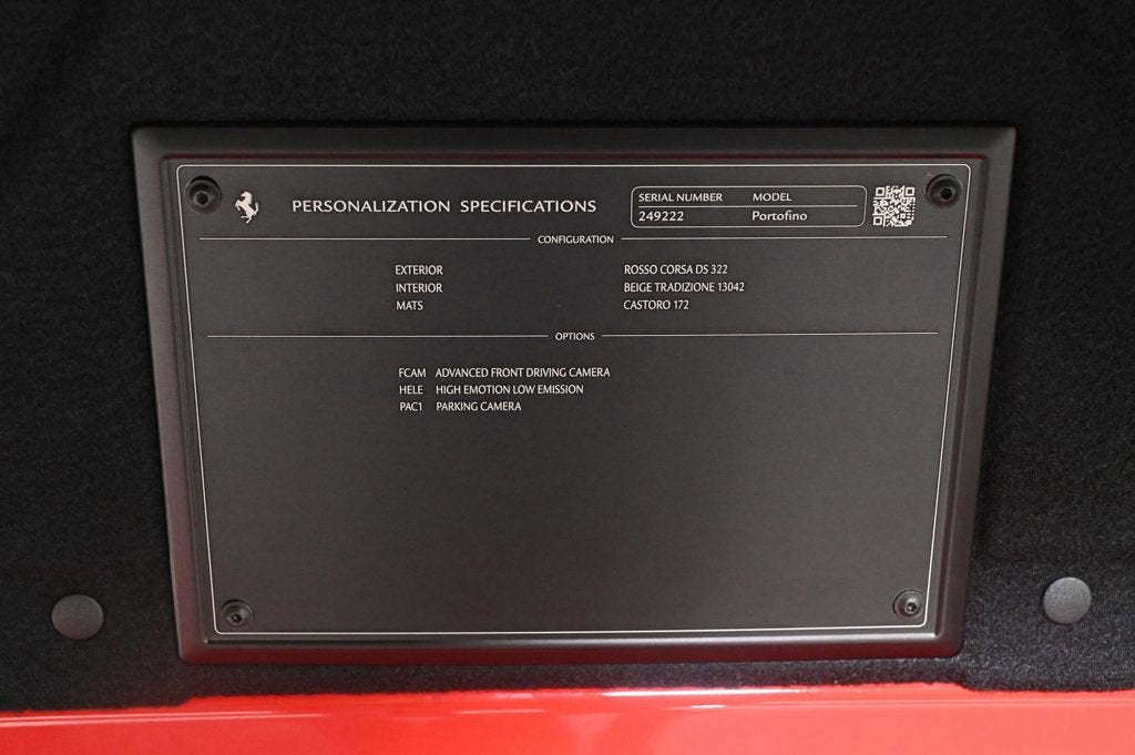 KEY FEATURES AND OPTIONS Comes equipped with: Air Conditioning, Navigation System. This Ferrari Portofino also includes Power Passenger Seat, Tachometer, Digital Info Center, Tilt Steering Wheel, Power Steering, Power Windows, Steering Radio Controls, ABS Brakes, Fog Lights, Traction Control, Intermittent Wipers, Dynamic Stability, Keyless Entry, Rear Defogger, Security System, AM/FM, Rear Spoiler, Overhead Console. Air Conditioning, Power Steering, Power Windows, Power Passenger Seat, Tachometer, Digital Info Center, Tilt Steering Wheel, Steering Wheel Radio Controls, Keyless Entry, Security System, ABS Brakes, Traction Control, Dynamic Stability, Rear Defogger, Fog Lights, Intermittent Wipers, AM/FM, Alloy Wheels, Leather Interior Surface, 20 Wheels, Leather Seat Trim, 4-Wheel Disc Brakes, Ceramic disc brakes: front and rear, Apple CarPlay, 7 Speakers, Front beverage holders, Telescoping steering wheel, Rear seat center armrest, Rear anti-roll bar, Rain sensing wipers, Radio data system, Power driver seat, Power door mirrors, Power convertible roof, Passenger vanity mirror, Passenger door bin, Overhead console, Outside temperature display, Low tire pressure warning, Integrated roll-over protection, Illuminated entry, Heated door mirrors, Glass rear window, Fully automatic headlights, Front reading lights, Front anti-roll bar, Four wheel independent suspension, Dual front side impact airbags, Dual front impact airbags, Driver door bin, Delay-off headlights, Convertible roof lining, Bumpers: body-color, Automatic temperature control, Spoiler, Navigation System, Front Center Armrest, Sport Plus Seats, Convertible HardTop Navigation System, Overhead Console, Rear Spoiler, Rear Spoiler - Contact Alvaro Uribe at 786-628-7606 or auribe@ferrariofmiami.com for more information. -