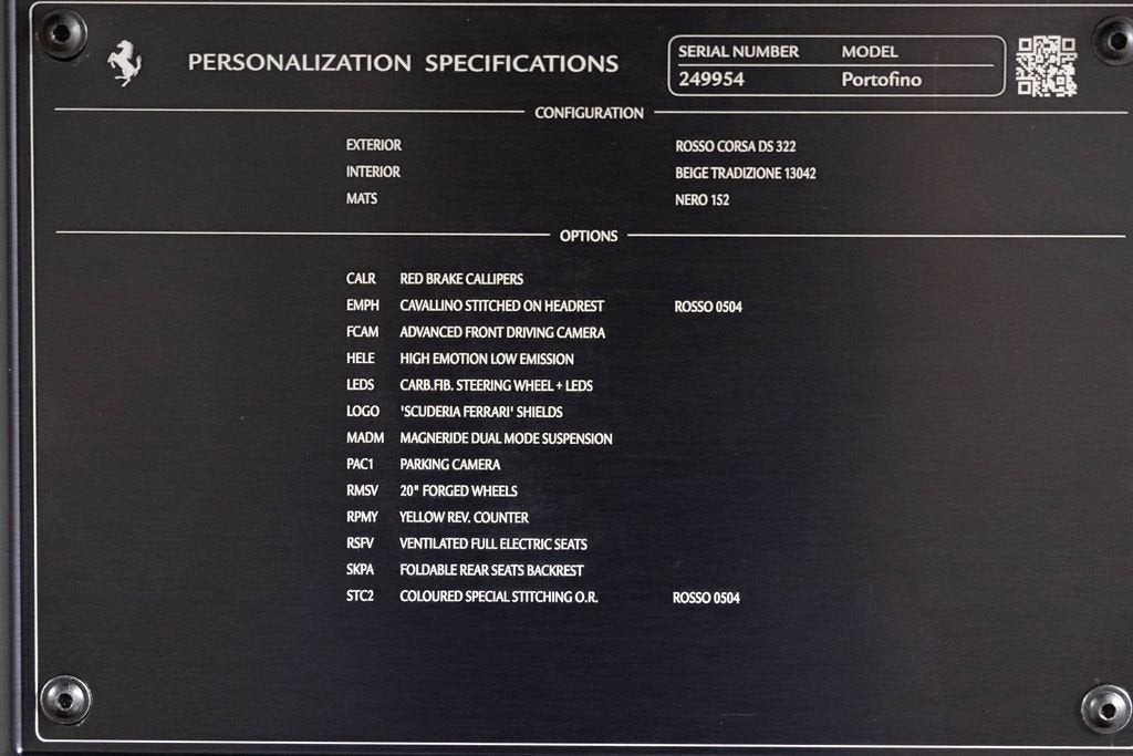 This 2020 Ferrari Portofino has less than 9,000 miles and more importantly, it has over $32,000 in additional options and customization. The exterior is finished in Ferrari's most iconic colors, Rosso Corsa. Other optional highlights include full ventilated seats, special stitching, and red brake calipers. This Portofino has been well maintained by its one local owner. The car is available for CPO, a benefit you can only pick up from an authorized Ferrari dealer. RED BRAKE CALIPERS HORSE STITCHED ON HEADREST ADVANCED FRONT DRIVING CAMERA CARB.FIB.STEERING WHEEL + LEDS 'SCUDERIA FERRARI' SHIELDS MAGNERIDE DUAL MODE SUSPENSION PARKING CAMERA 20" FORGED PAINTED RIMS YELLOW REV. COUNTER VENTILATED FULL ELECTRIC SEATS FOLDABLE REAR SEATS BACKREST COLOURED SPECIAL STITCHING VEHICLE PERSONALIZATION PLATE As one of the top-selling pre-owned Ferrari dealers in the nation, Ferrari Dallas takes tremendous pride in offering only the best late-model, low-mileage Ferraris available anywhere in North America. For specific details on the vehicle listed above, please contact any of our qualified sales consultants by calling 888-701-5761. We look forward to assisting you.