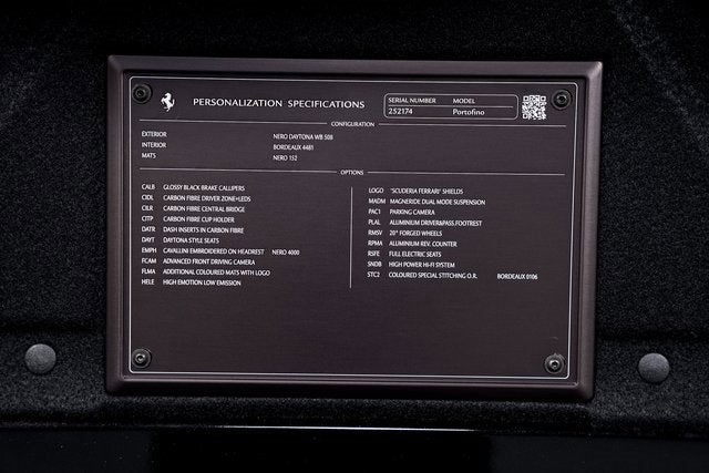 Ferrari of Long Island is proud to present this beautifully specified Ferrari Portofino, finished in Nero Daytona over a rich Bordeaux interior with matching Bordeaux stitching. This timeless and elegant configuration perfectly complements the Portofinos sleek grand touring silhouette. Powered by a twin-turbocharged V8 engine, the Portofino delivers exhilarating performance with seamless acceleration and a captivating exhaust note. Dual Mode MagneRide Suspension ensures exceptional ride comfort and dynamic handling, adapting effortlessly between spirited driving and relaxed cruising. This example is enhanced with Gloss Black brake calipers set behind 20-inch forged wheels in Liquid Silver finish, creating a refined yet sporty stance. Signature Scuderia Ferrari fender shields proudly showcase the marques racing heritage. The interior is extensively appointed with carbon fiber accents, including a carbon fiber center console, carbon fiber steering wheel with integrated LEDs, carbon fiber dashboard accents, and a carbon fiber cup holder bezel. An embroidered Cavallino on the headrests in Nero and an aluminum tachometer add distinctive, driver-focused details. Full electric Daytona seats with memory function provide exceptional comfort and adjustability. Technology and convenience features include an advanced front driving camera, rear parking camera, and a Premium Hi-Fi system for an immersive audio experience. This Ferrari has passed a comprehensive multi-point inspection performed by our factory-trained technicians and has been enrolled in the Ferrari Approved Certified Pre-Owned Program. The Certified program makes available up to two years of additional Ferrari Power Approved Warranty coverage. Please contact us for more details or to schedule a private viewing.