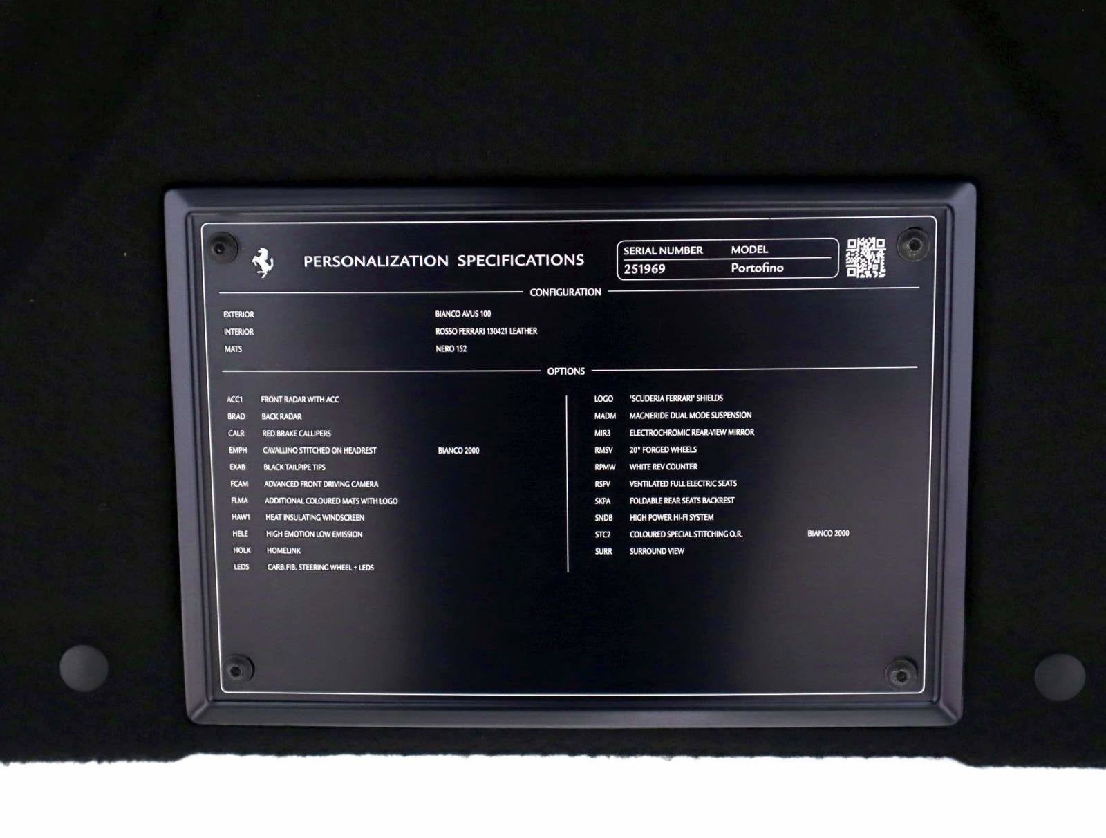 Ferrari of Atlanta is pleased to offer this highly desirable 2020 Ferrari Portofino finished in Bianco Avus over Rosso Ferrari leather- an iconic Ferrari color combination that delivers striking contrast and timeless appeal. This is a two-southern-owner example showing less than 5,800 miles, and it has been consistently serviced by Ferrari of Atlanta, reflecting attentive ownership and proper care.The Bianco Avus exterior is complemented by Rosso Corsa brake calipers, black ceramic-coated tailpipes, and 20-inch forged wheels in Liquid Silver, giving the car a clean yet performance-focused presence. Inside, the Rosso Ferrari leather cabin is enhanced by a carbon fiber steering wheel with LED shift lights, blending luxury with unmistakable Ferrari character.Well equipped from the factory, this Portofino features Adaptive Cruise Control with front radar, Blind Spot Detection with rear radar, Advanced Front Driving Camera, and Surround View. Dual-mode MagneRide suspension provides an adaptable driving experience, while the Premium Hi-Fi sound system, electrochromic exterior mirrors, Homelink system, and folding rear seat backrests with ski passage add comfort and everyday usability.For buyers searching for a low-mileage Ferrari Portofino for sale in a classic white-over-red specification, this well-maintained and highly optioned example represents an outstanding opportunity.
