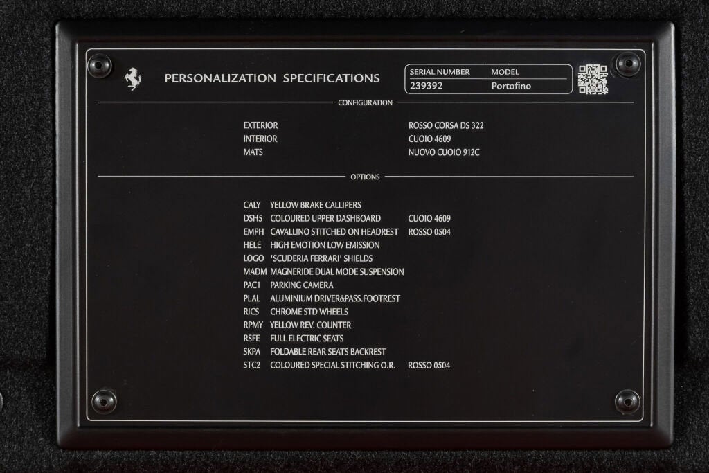 Ferrari Los Angeles is proud to present this beautiful 2019 Ferrari Portofino finished in Rosso Corsa, complimented by an exquisite Cuoio leather interior. Equipped with Magneride Dual Mode Suspension along with timeless, subtle appointments, the Ferrari Portofino debuted as a more powerful and refined successor to the California T, powered by a 3.9-liter twin-turbo V8 producing 591 horsepower. Capable of reaching 0 to 60 mph in 3.5 seconds, the Portofino pairs elegant design with daily usability and retractable hard-top versatility. It reflects Ferrari’s continuing evolution of the front-engine V8 GT, balancing comfort, connectivity, and unmistakable performance. The Ferrari Portofino offers astonishing levels of performance and versatility thanks to its 7-speed dual-clutch transaxle mated to the 3.9-liter V-8 with 591 hp and the optional Magneride Dual Mode Suspension, which guarantee a very satisfying driving experience either with the retractable hardtop open or closed. Factory Exterior Options - Rosso Corsa Paintwork (EXTC) Giallo Modena Brake Calipers (CALY) 20 Wheels, Gloss Liquid Silver (RICS) Scuderia Ferrari Shields (LOGO) Parking Camera (PAC1) Magneride Dual Mode Suspension (MADM) Factory Interior Options - Cuoio Leather Interior (INTC) Full Electric Seats W/Memory (RSFE) Yellow Tachometer Dial (RPMY) Aluminium Footrest (PLAL) Upper Dashboard in Cuoio (DSH5) Carpets in Cuoio (CRPT) Special Stitching in Rosso (STC2) Embroidered Cavallino on Headrest in Rosso (EMPH) HELE System (HELE) Folding Rear Seat Backrests (SKPA) This Portofino has gone through our extensive CPO inspection process and is therefore eligible to be sold as a CPO by adding two years of warranty at the time of purchase. Please contact our Ferrari Los Angeles sales team with any questions or to schedule a viewing in the showroom.