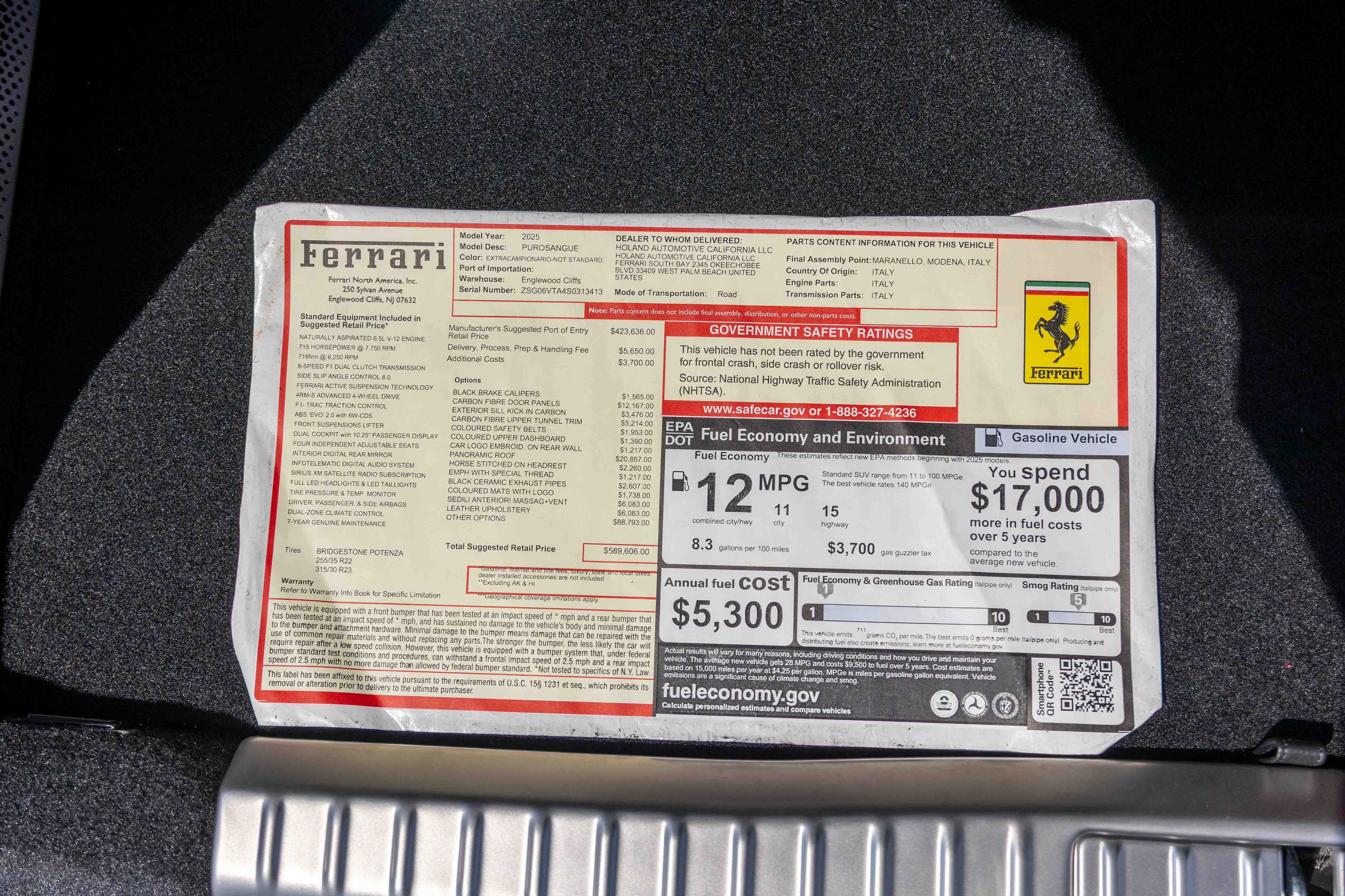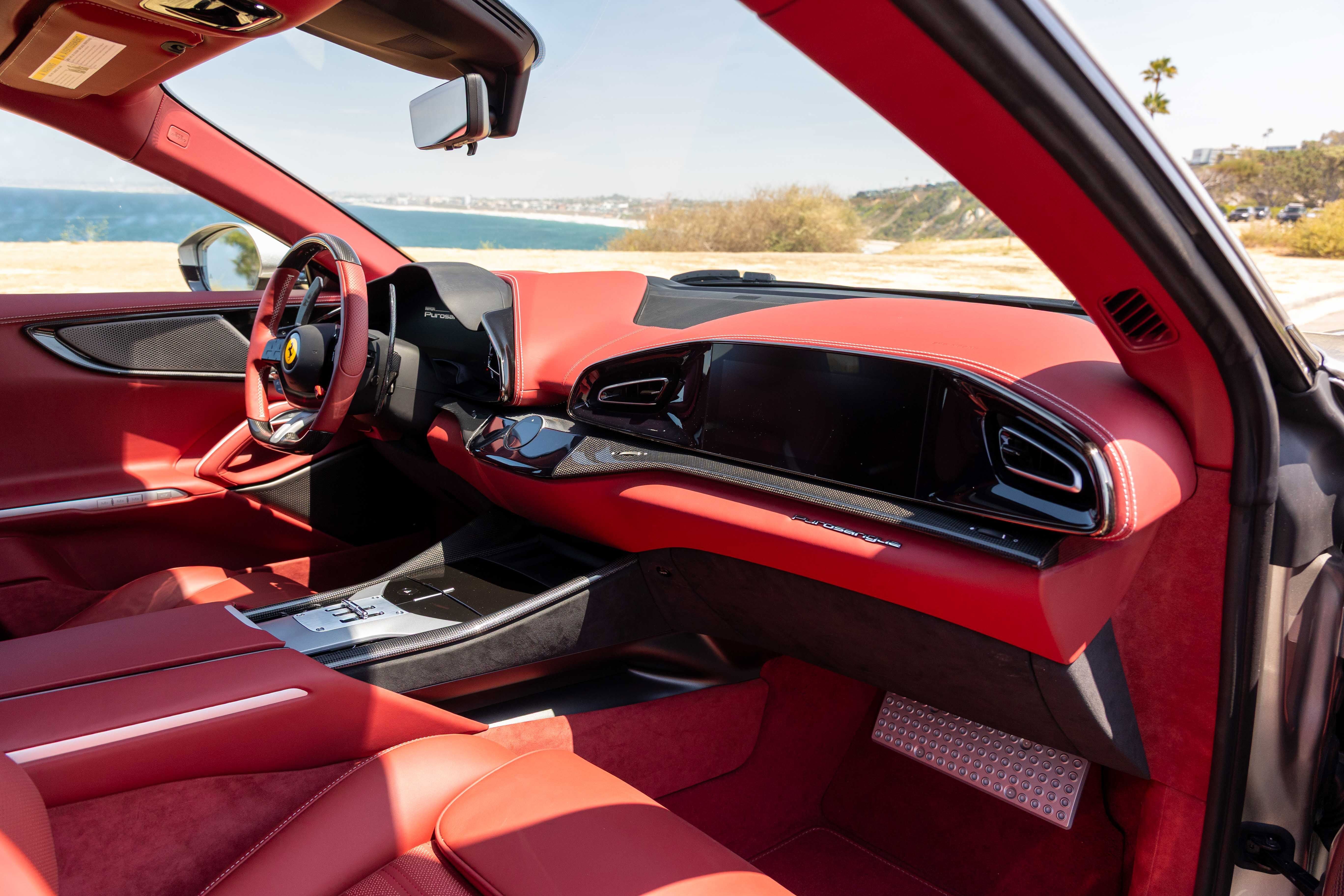 Ferrari South Bay is pleased to bring to market this one-owner Purosangue, finished in shimmering Aluminio Lucido, with Bordeaux Leather Interior, and loaded with a raft of desirable options and carbon fiber. Ferrari's new FUV is an amazing balance between cosseting, quiet luxury for four, and levels of incredible performance that astound in a vehicle of this type. Indeed, from the moment you fire up that V12, you'll understand why Ferrari do not consider the Purosangue to be an SUV (and neither will you): make no mistake, this FUV, propelled by 715hp worth of hand-built 6.5 Liter V12, will immediately reveal its sporting heritage in a major way the instant you ask for it. The exterior of this Purosangue is finished in shimmering Aluminio Lucido, a velvety silver with a very fine metal flake. Matte Black Glossy Forged Diamond Polished wheels are affixed with Titanium Wheel Studs to enormous Carbon Ceramic Brakes sporting Glossy Black Calipers. The exterior lower body trim is painted Glossy Black, Scuderia Ferrari Shields adorn the front fenders, and Black Tailpipe tips allow that glorious V12 to sing the song of its people. Inside, you'll find a cabin trimmed in luxurious Bordeaux, which extends to the Upper Passenger Compartment and Upper Dashboard. Silver Stitching is found throughout the cabin, including the Cavallinos embroidered on the headrests of the Fully Electric Seats which also feature Massage and Ventilation (Rear Seats, too!). Carbon Fiber finishes the Door Panels, Exterior Kick Panels, and Upper Center Console. The Steering Wheel is finished in Carbon Fiber and Bordeaux Leather, and features Ferrari's signature LED Shift Lights. An electrochromic Panoramic Roof adjusts cabin brightness during the daytime, allowing you to emphasize the natural open airy feel, or select to have a more private place to travel. The ripping-silk wail of its V12 may be addictive, but when traffic won't allow you to stretch its legs, there's Burmeister providing concert-quality audio via 21 speakers and 1,420 watts of power. While many driver's assistance features are standard on the Purosangue, this example is also fitted with Surround View cameras, Video Rearview Mirror, and Vehicle Lifter. This Purosangue is offered complete with both original keys, car cover, books, tools and battery tender. Ferrari's Original Factory Warranty is in place through December 30, 2027, while Ferrari's Genuine Maintenance Program handles annual services through December 30, 2031. Having passed Ferrari's rigorous 101-point CPO Checklist, this Purosangue is eligible for a 2-year Warranty Extension at time of purchase. If you'd like to find out more about this FUV's character, or visit our showroom to experience it for yourself, please reach out to our knowledgeable sales staff. Ferrari South Bay is proudly part of Holand Automotive Group, one of North America’s leading luxury automotive retailers. We offer nationwide shipping, trade-in opportunities, financing, client consignments, and world-class delivery service. Contact us today to explore ownership of this remarkable Ferrari. Please visit us at 23305 Hawthorne Blvd, Torrance, CA 90505, or call us at (888) 578-8767.