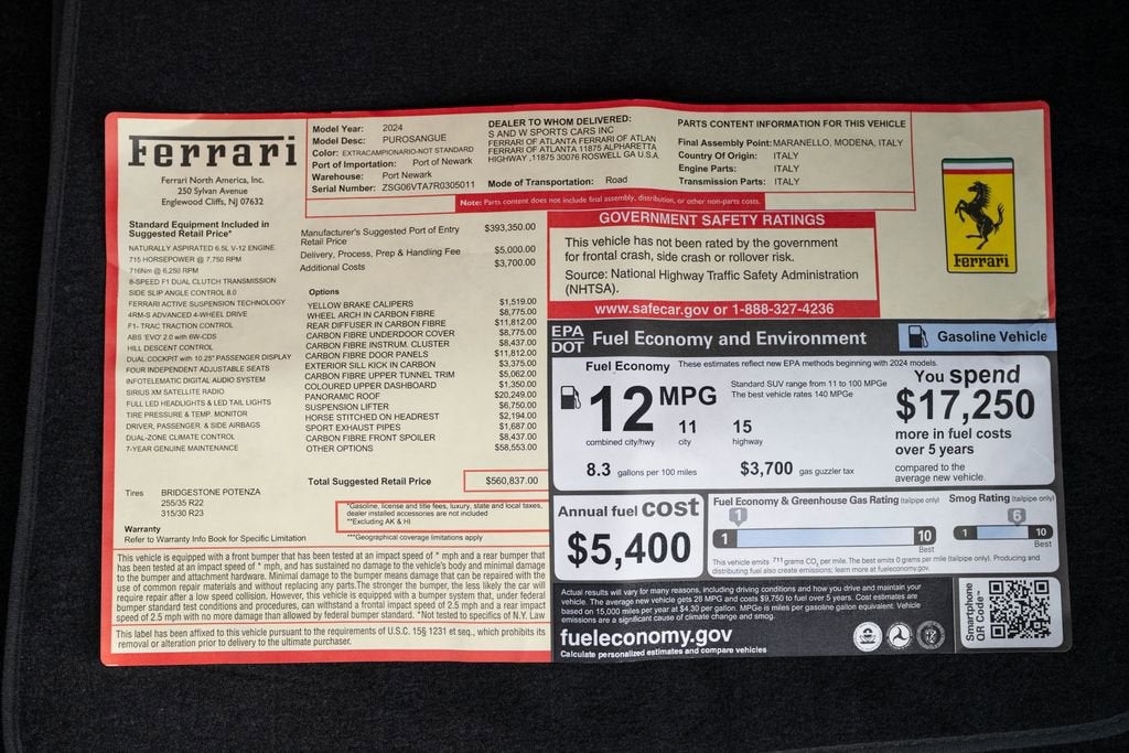 Discover the ultimate expression of power, performance, and luxury in the 2024 Ferrari Purosangue Base. This exceptional SUV is a true masterpiece, blending the iconic Ferrari DNA with the versatility and capability you demand. Prepare to be captivated by its breathtaking design, exhilarating performance, and unparalleled attention to detail. Elevate your driving experience with an impressive array of premium features, including: Navigation System 21 Speakers Burmester High-End Audio System Adaptive Suspension Ceramic Disc Brakes Lane Departure Warning System Exterior Parking Camera Rear Auto High-Beam Headlights Apple CarPlay & Android Auto Heated Front and Rear Seats 22" Front and 23" Rear Alloy Wheels The Purosangue's powerful 6.5L DOHC engine, paired with an 8-speed Dual Clutch transmission and all-wheel-drive, delivers an uncompromising driving experience. With 11 city and 15 highway MPG, this Ferrari is as efficient as it is exhilarating. Crafted with the utmost attention to detail, the Purosangue's interior is a harmonious blend of luxury and technology. Indulge in the comfort of semi-aniline leather seating, a heads-up display, and a Burmester high-end audio system that will captivate your senses. Experience the pinnacle of Italian automotive engineering and design. The 2024 Ferrari Purosangue Base is more than just a vehicle it's a statement of your passion, your individuality, and your unwavering commitment to excellence. Schedule a test drive today and discover the true meaning of driving perfection.