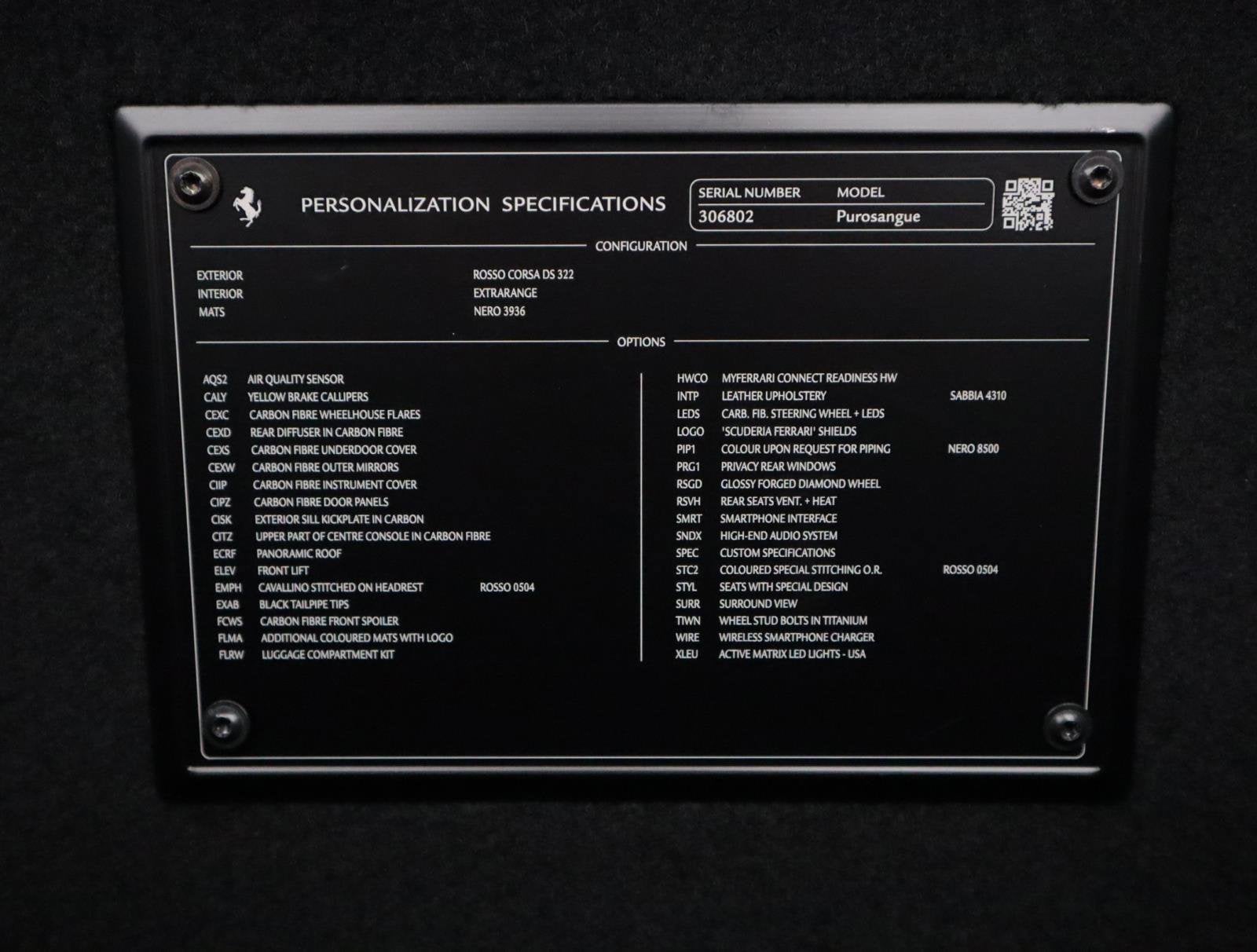 Full car PPF, Front and Rear Radar/ Laser display in Mirror, New Tires Options:Giallo Modena Brake Callipers Wheel Arch In Carbon FibreCarbon DiffuserCarbon Side SkirtsCarbon Fibre Outer MirrorsPanoramic Roof Black Ceramic Coated TailpipesCarbon Front Spoiler Scuderia Ferrari Fender ShieldsPrivacy Window Titanium Wheel BoltsDashboard carbon stripes insertsPannelli Porta In CarbonioCarbon Outer Sill KickFinitura fibra di carbonio tunnel superioreTappeti Horse Stitched On HeadrestMats With LogoCarbon Steering Wheel With LedsColour Upon Request For PipingVentilated Massaging Rear SeatsStitching -FILO SPECIALE ROSSO 0504 Specific Design SeatsUpper Area in Leather Upon Request-NERO 8500 (BLACK) Air quality sensor Suspension LifterTrunk KitSmartphone InterfaceHigh-End Audio SystemADAS Surround View Smartphone Wireless ChargerAdaptive Front Headlights2024 Ferrari Purosangue Rosso CorsaExperience the new pinnacle of Ferrari performance and luxury with this stunning 2024 Purosangue, meticulously cared for and presented in the iconic Rossa Corsa exterior. This is more than a car-it's a statement, a lifestyle, and a purebred stallion ready for its next journey.The brilliant red exterior is flawlessly protected by a full car PPF (Paint Protection Film) and is further enhanced by an extensive list of carbon fiber options, including the wheel arches, front spoiler, side skirts, and diffuser. The aggressive look is completed with carbon outer mirrors and a set of black ceramic coated tailpipes. Underneath, Giallo Modena brake calipers pop against the classic red, while titanium wheel bolts ensure every detail is pure performance.Step inside and be welcomed by the stunning Sabbia leather interior, a perfect complement to the vibrant exterior. The cabin is an elegant blend of luxury and sport, featuring a panoramic roof that floods the space with light. The interior is laced with carbon fiber, from the dashboard stripes to the door panels, outer sill kicks, and upper tunnel. The carbon steering wheel with LEDs puts the heart of the car in your hands, while Scuderia Ferrari fender shields on the exterior and horse-stitched headrests inside proudly announce its heritage.This Purosangue is loaded with sought-after options for comfort and convenience, including ventilated massaging rear seats, suspension lifter, high-end audio system, and smartphone interface. For added peace of mind, it is equipped with a Passport radar and jammers. This well-cared-for example is ready to go, with brand new tires and a full suite of luxury and safety features.This is a rare opportunity to own a meticulously specified Purosangue with an incredible collection of options. Don't just drive it-experience it.