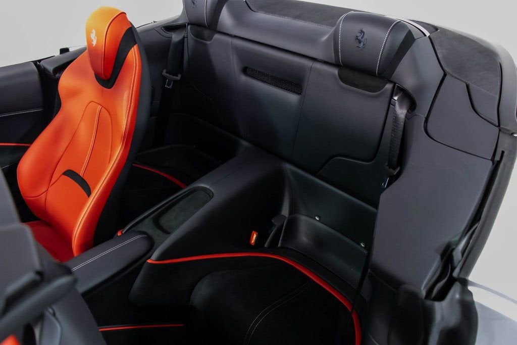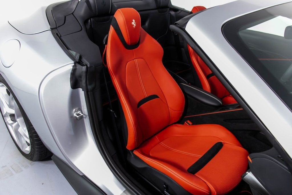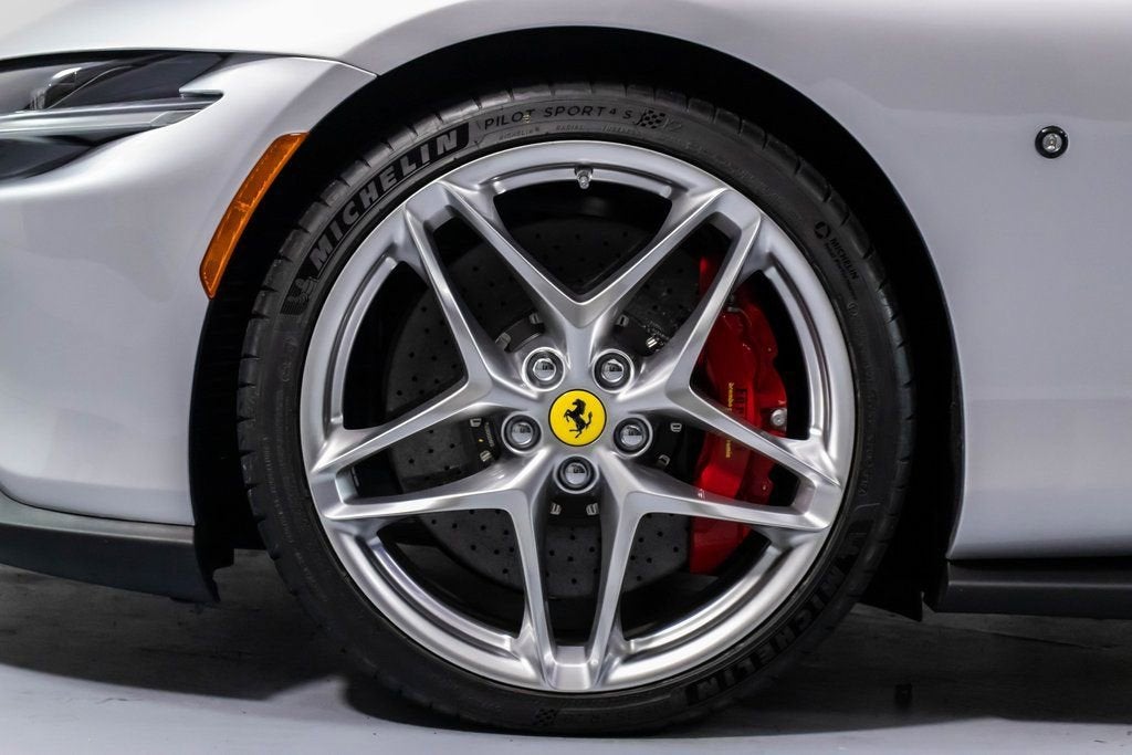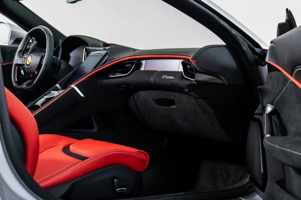 317039 Exterior: Argento Nurburgring Interior: Rosso Ferrari Mats: Nero 2025 Ferrari Roma Spider Options: Back Radar Red Brake Calipers MyFerrari Connect Activated Tonneau Cover in Fabric Cavallino Stitched on Headrest in Grigio Chiaro Black Tailpipe Tips Advanced Front Driving Camera Additional Colored Mats with Logo Home Link MyFerrari Connect Readiness HW Carb. Fib. Steering Wheel + LEDS Central Part of Seats in INTC Leather 'Scuderia Ferrari' Shields Magneride Dual Mode Suspension Electrochromic Rear-View Mirror Passenger Display Classic Colors Argento Nurburgring STD Chrome Wheels Ventilated Full Electric Seats Smartphone Interface Soft Top Color Black Tailoring Fabric Colored Special Stitching O.R. in Grigio Chiaro Surround View Michelin Tires Wireless Smartphone Charger The 2025 Ferrari Roma Spider in Argento Nurburgring blends classic Ferrari elegance with cutting-edge open-top performance. Its Rosso Ferrari interior and Nero mats create a bold, timeless cockpit enhanced by ventilated full electric seats, INTC leather seat centers, and Grigio Chiaro special stitching that matches the Cavallino embroidered on the headrests. A black tailoring fabric soft top pairs perfectly with the iconic silver exterior, while red brake calipers, chrome wheels, and 'Scuderia Ferrari' shields complete the signature Ferrari look. Advanced features such as Surround View, Advanced Front Driving Camera, Back Radar, Electrochromic rear-view mirror, and Magneride Dual Mode Suspension elevate both safety and driving precision. The cabin is enriched with a Passenger Display, Carb. Fib. Steering Wheel with LEDs, wireless smartphone charger, Home Link, and full MyFerrari Connect integration. Finished with black tailpipe tips, Michelin tires, and additional colored mats, this Roma Spider captures pure grand-touring spirit with open-air sophistication.