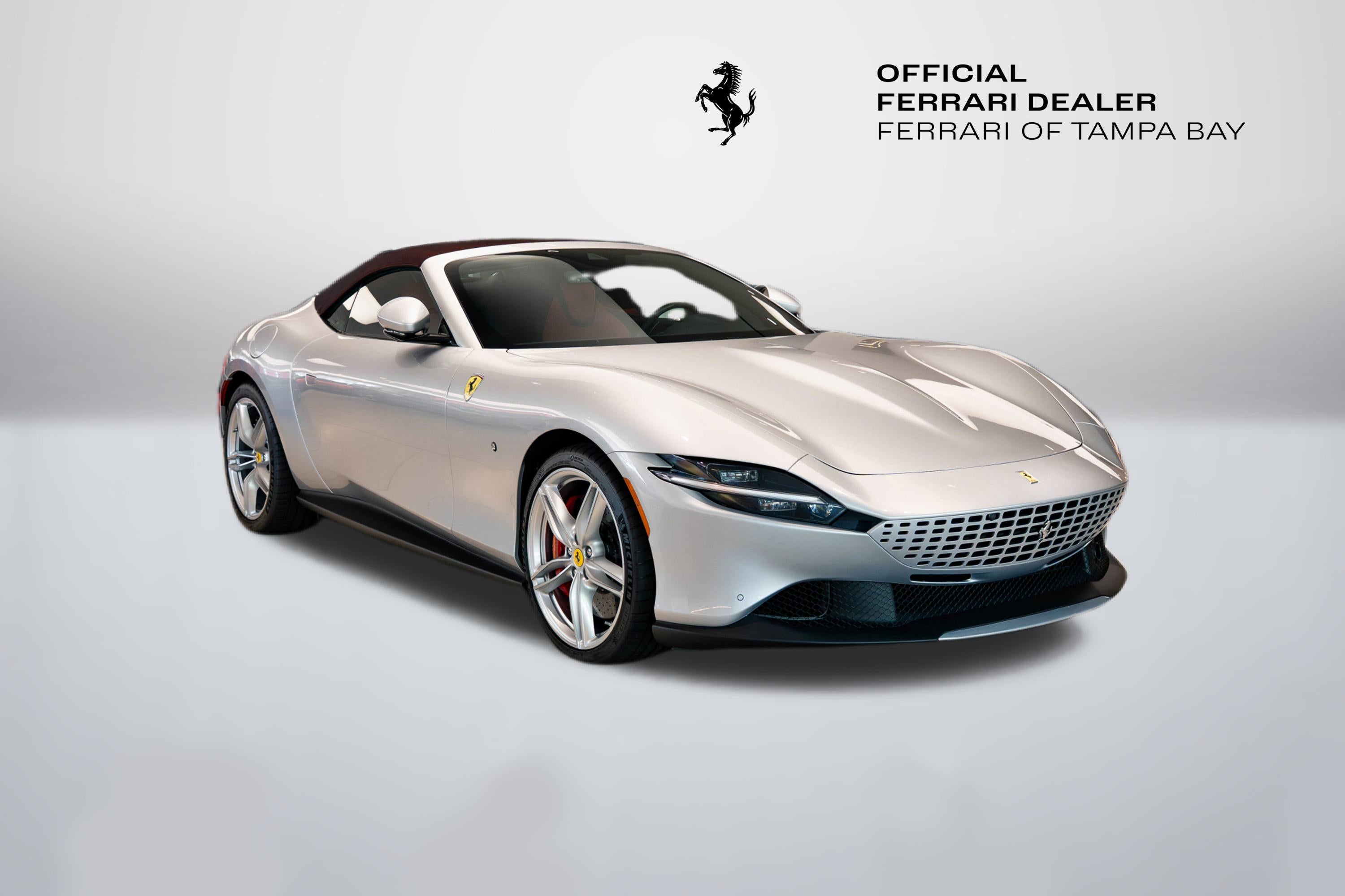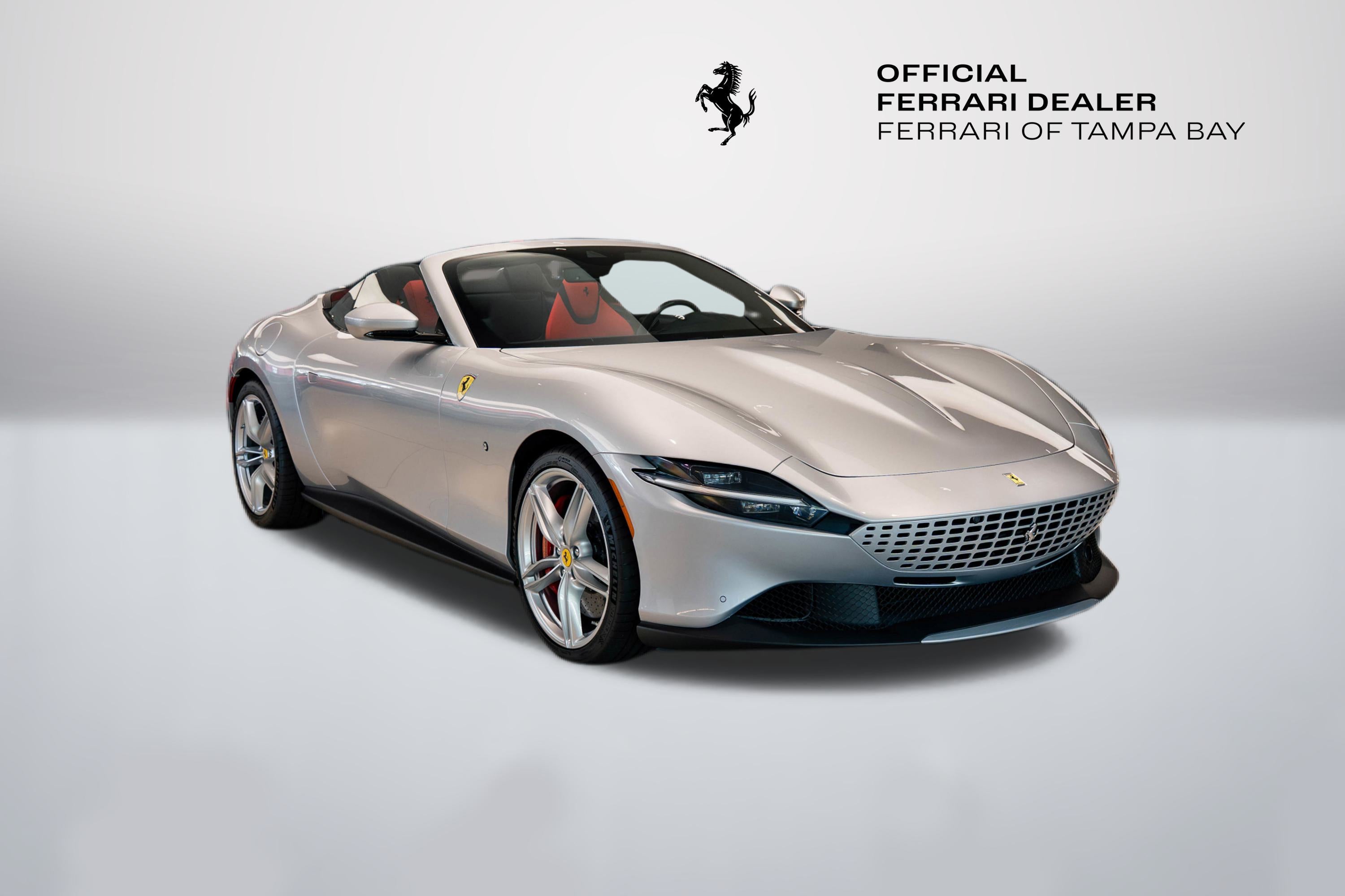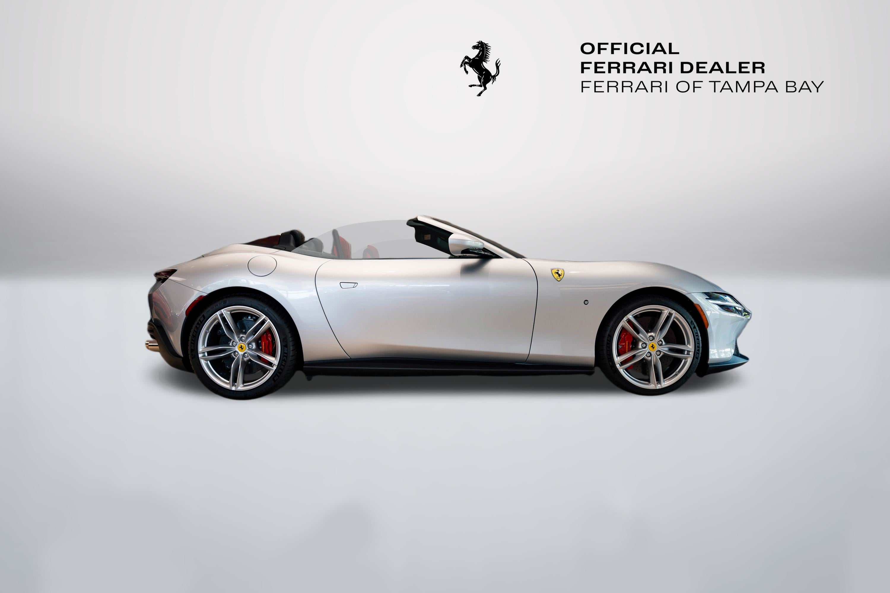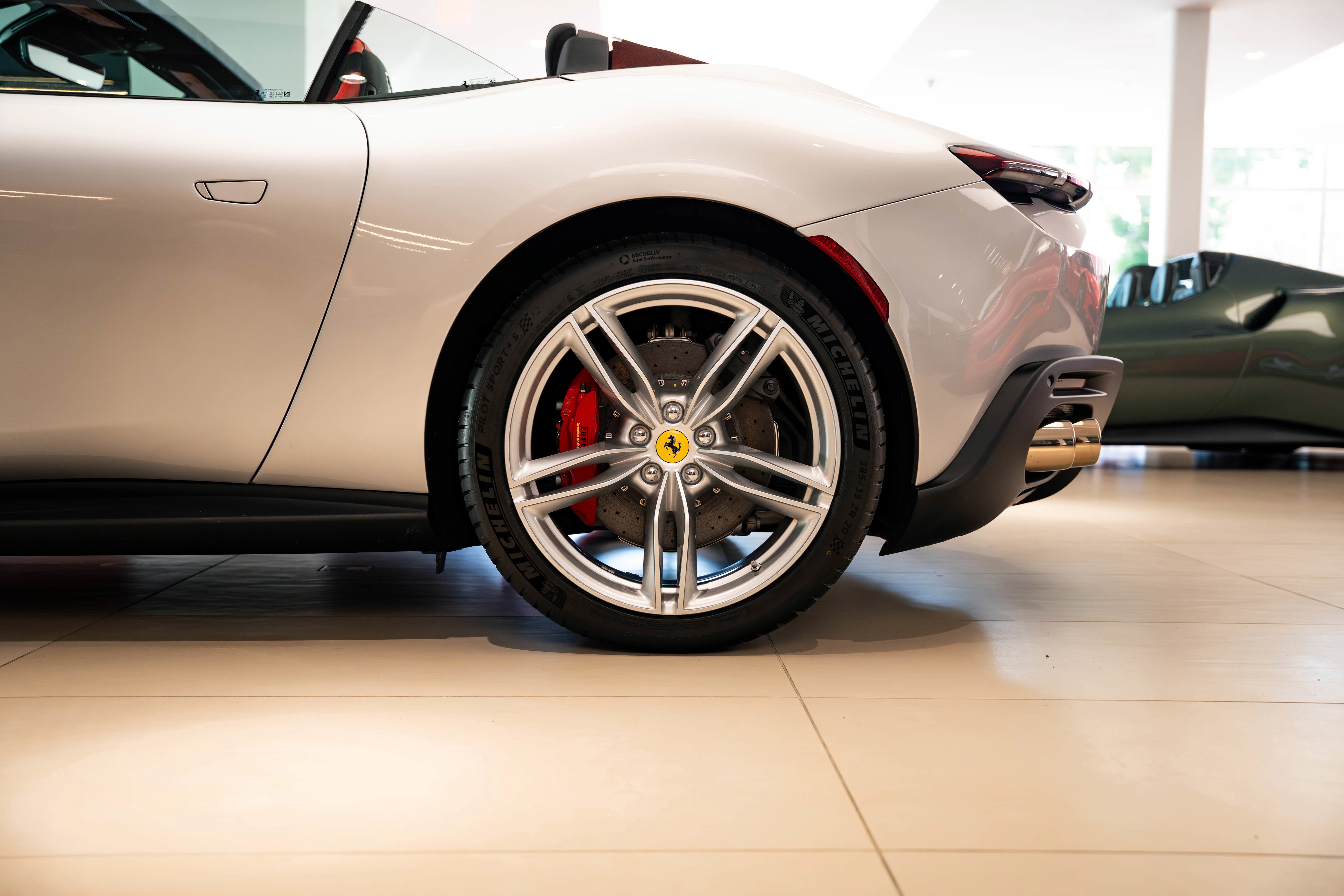 2024 Ferrari Roma Spider finished in the classic color of Argento Nurburgring (Silver Gray) with Rosso Ferrari (Red) interior and only 57 delivery miles on the odometer! Options include Rosso Brake Calipers, Scuderia Shields on the Fenders, 20" Forged Liquid Silver Wheels, Rosso Ferrari Leather Passenger Compartment Bands, Nero (Black) Cavallino Embroidered on the Headrests, Alcantara Seat Inserts, Aluminum Footrests, Carbon Fibre Steering Wheel with L.E.D.