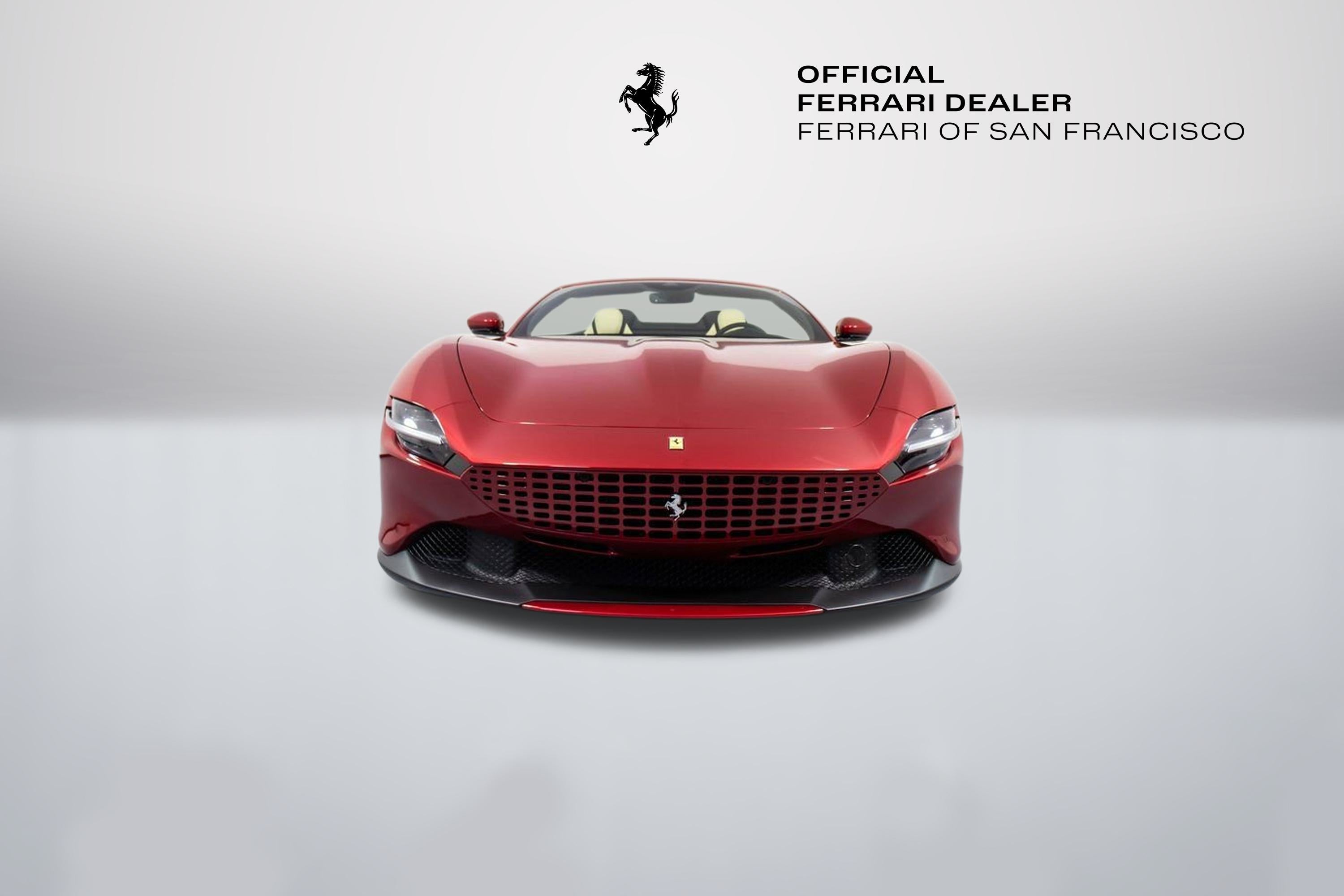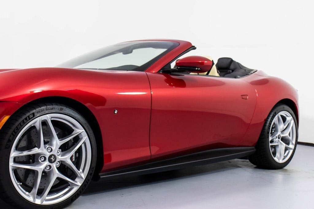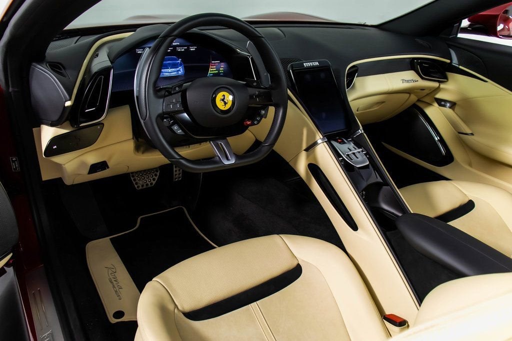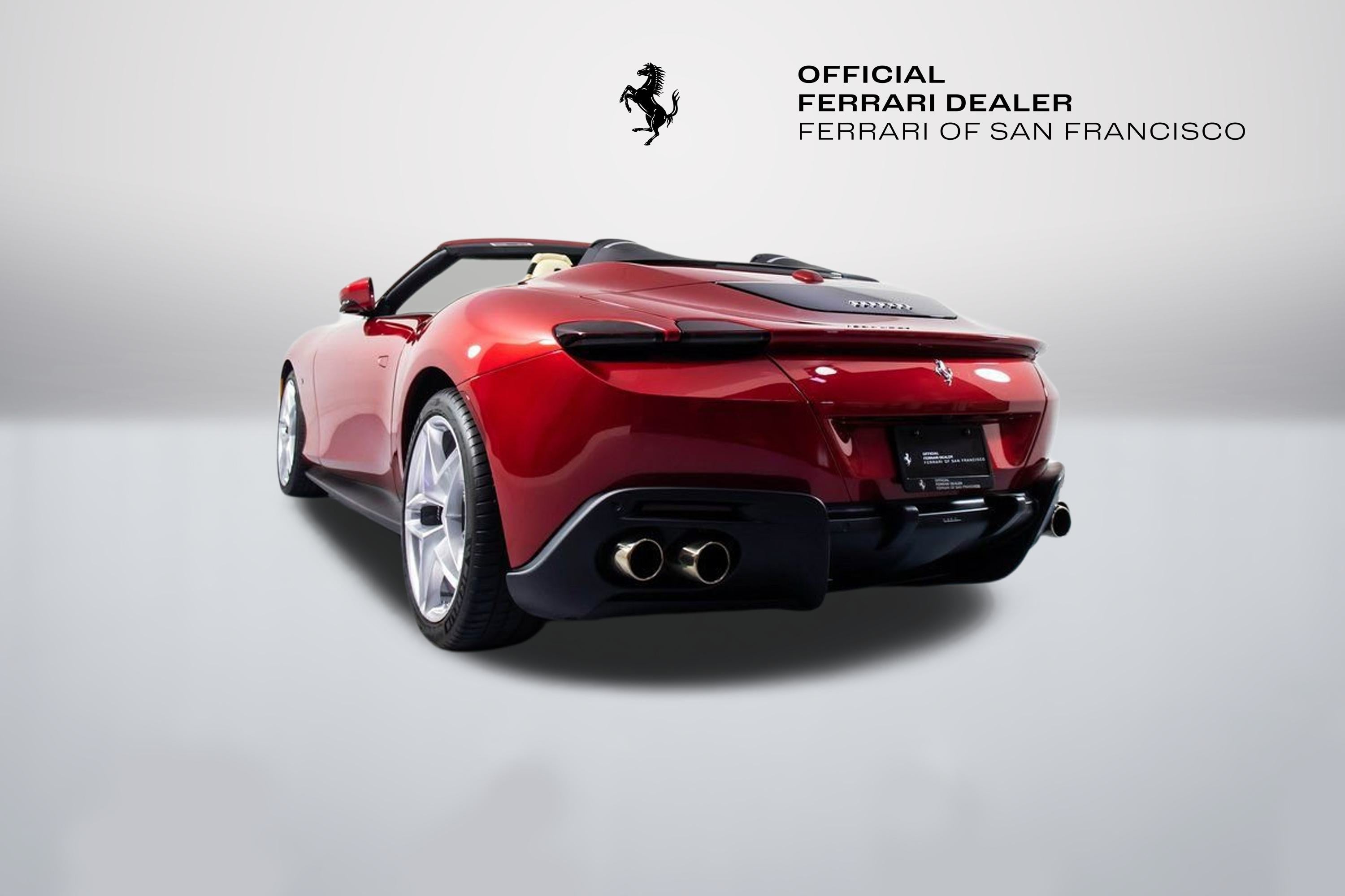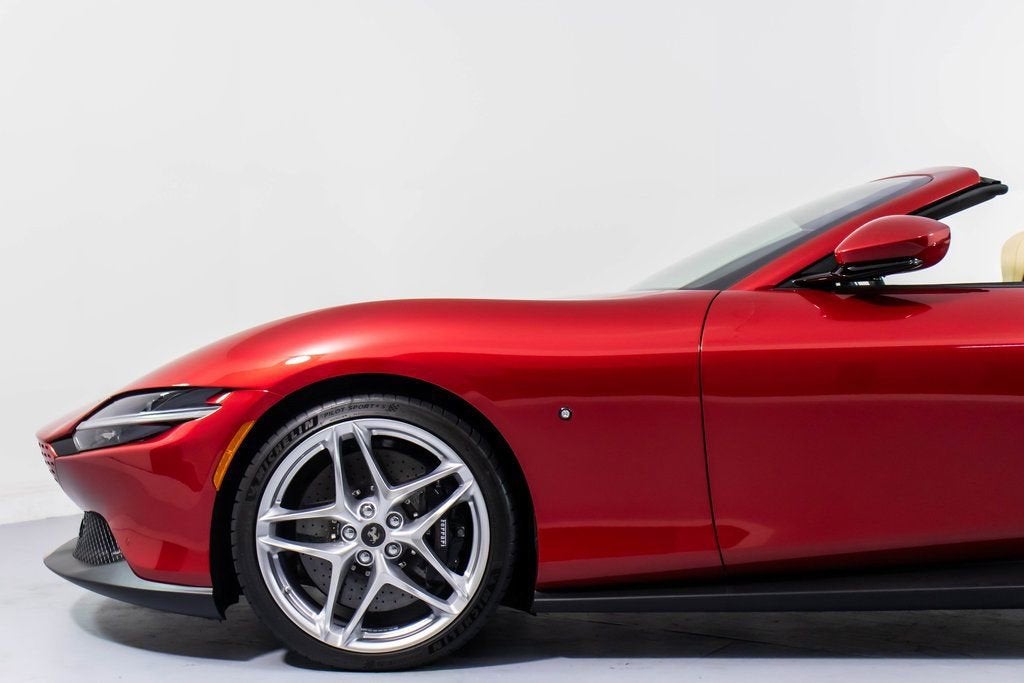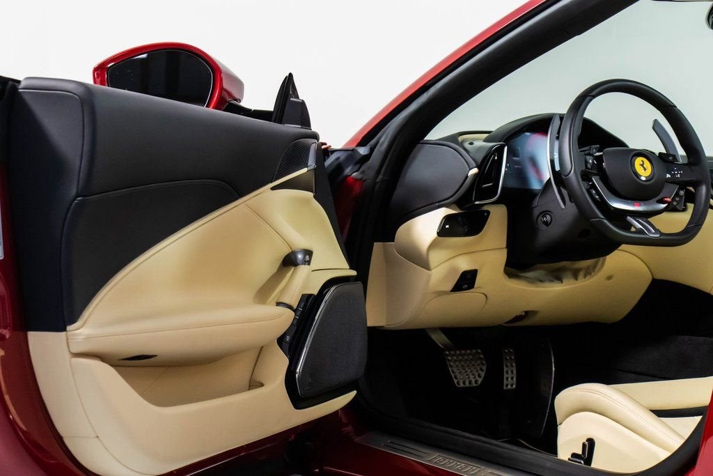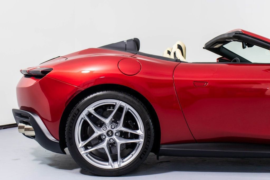 309668 Exterior: Rosso Imola Interior: Crema Mats: Nero 2024 Ferrari Roma Spider Options: Backrest in Colored Leather in Crema Back Radar Glossy Black Brake Calipers Carbon Fiber Wheel Cups Advanced Front Driving Camera Additional Colored Mats with Logo MyFerrari Connect Readiness HW Magneride Dual Mode Suspension Electrochromic Rear-View Mirror Leather Passenger Compartment Inserts in Crema Classic Colors in Rosso Imola STD Chrome Wheels Full Electric Seats Smartphone Interface High Power Hi-Fi System Soft Top Color in Black Tailoring Fabric Top Contrast Stitching in Rosso Michelin Tires Wireless Smartphone Charger The 2024 Ferrari Roma Spider in Rosso Imola is a breathtaking open-top grand tourer that blends refined luxury with unmistakable Ferrari performance. Its bold exterior is paired with a sophisticated Crema interior, enhanced by matching leather passenger compartment inserts and a backrest finished in colored Crema leather for a warm, elegant cabin atmosphere. Glossy Black brake calipers, carbon fiber wheel cups, and classic Rosso Imola paint elevate its visual presence, while the black tailoring-fabric soft top adds a sleek contrast. Comfort and technology come together with full electric seats, Magneride Dual Mode Suspension, an electrochromic rear-view mirror, a high-power Hi-Fi system, and seamless connectivity through the smartphone interface and wireless charger. Advanced features such as Back Radar, the Advanced Front Driving Camera, and MyFerrari Connect Readiness enhance confidence on every drive. Riding on chrome wheels and Michelin tires, this Roma Spider delivers a perfect fusion of open-air elegance and modern Ferrari craftsmanship.