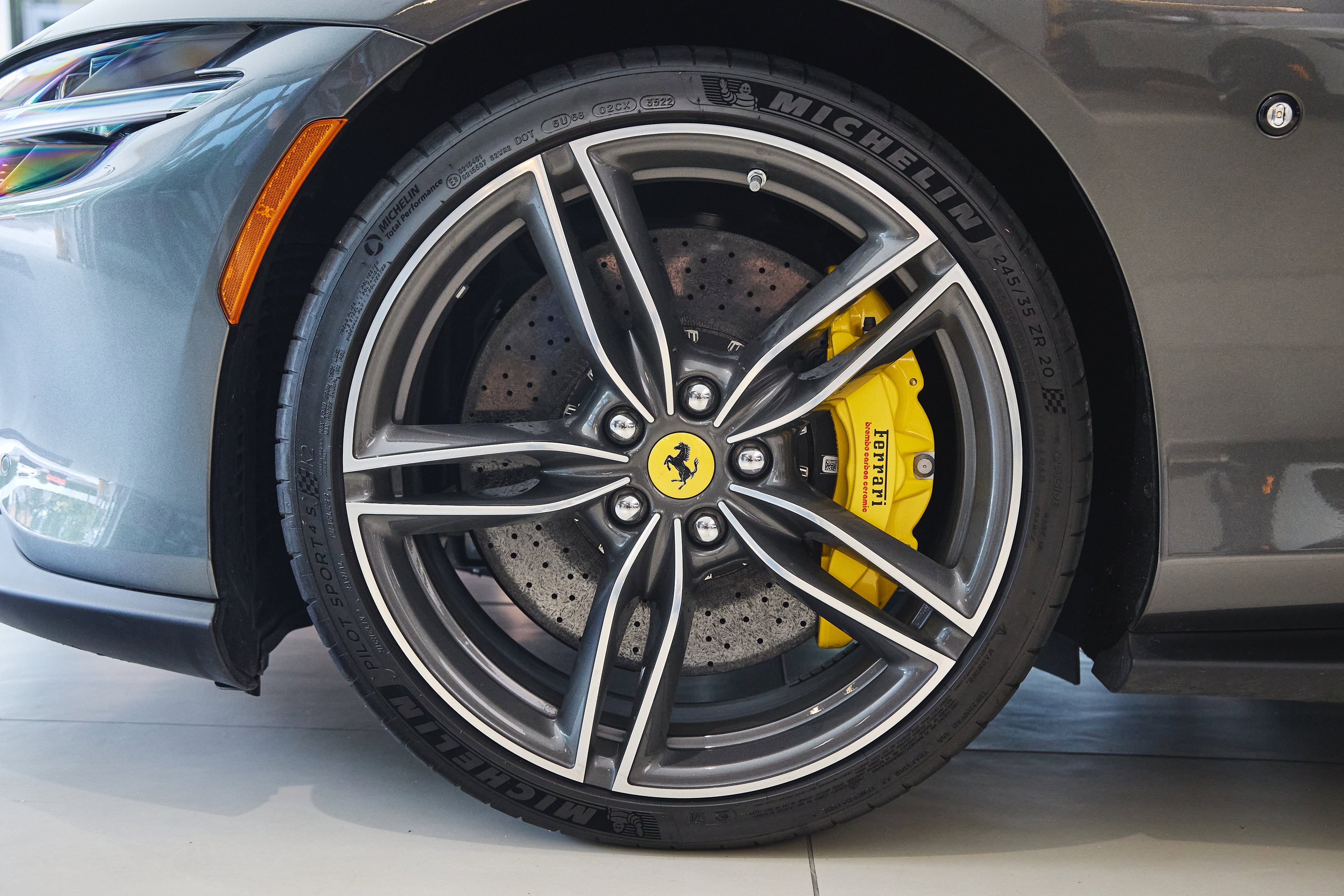 2023 Ferrari Roma finished in Grigio Silverstone and Extracampionario Grigio Chiaro Interior - a stunning combination of Ferrari Gray Palettes. Options on this special configuration include the following: 20" Forged Diamond Rims, Yellow Brake Calipers, Michelin Tires, Scuderia Ferrari Shields, MagneRide Dual Mode Suspension, Advanced Front Driving Camera, Wireless Smartphone Charging System, Semi-Aniline Grigo Leather Interior, Front and Rear Square Pattern Ventilated Full-Electric Seats, Colored Stitching in Bianco (White), Cavallino Stitched upon the Headrest in Nero (Black), Colored Ferrari Mats with Logo, Aluminum Driver's and Passenger Footrest, High Power Ferrari Sound System, Foldable Rear Seat Backrest, HomeLink Garage Door Opening System, Carbon Fibre Upper Tunnel Trim and Carbon Fibre Steering Wheel with L.E.D. Display. Complimentary Maintenance until January 2030. La Dolce Vita!