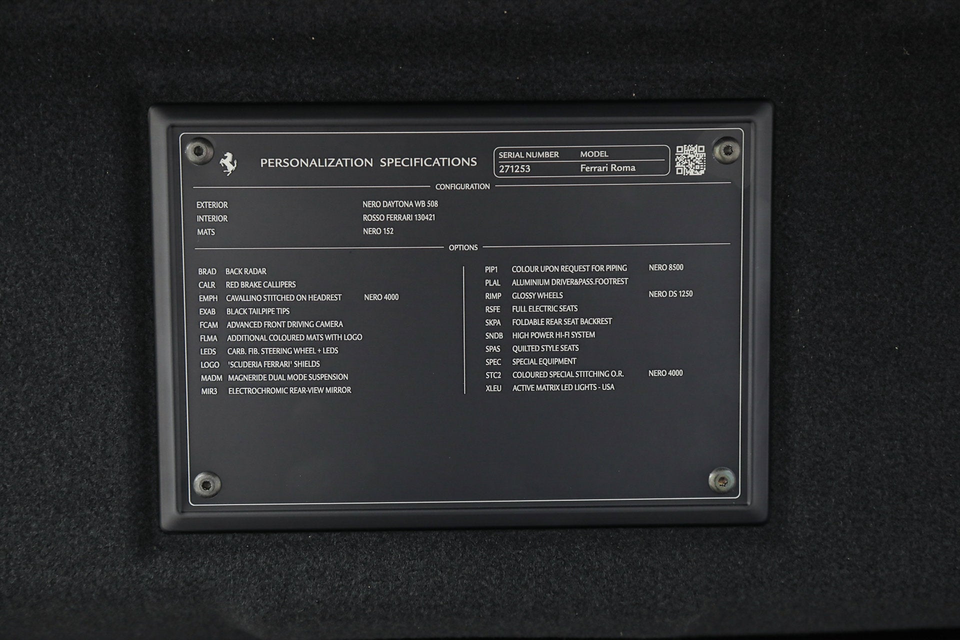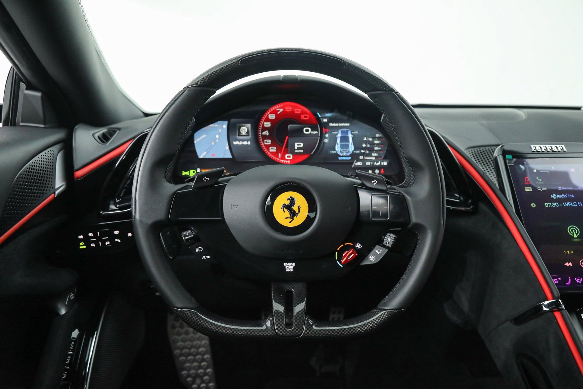 Ferrari Roma - FERRARI CERTIFIED PRE-OWNED - AVAILABLE EXTENDED FERRARI WARRANTY - - Nero Daytona over Rosso Ferrari - One Owner - Pristine Condition - Many Fine Options - Sold as New by Our Dealership - Expertly Maintained by Our Factory Trained Technicians - Extended Ferrari Warranty to 12/30/26 - Complimentary Ferrari Genuine Maintenance Service to 12/30/28 - Factory Options: - Magneride Dual Mode Suspension - Carbon Fiber LED Steering Wheel - Gloss Black Wheels - Red Brake Calipers - Scuderia Ferrari Shields - Full Electric Seats - Quilted Style Seats - Cavallino Stitched to Headrests in Nero - Special Stitching in Nero - Seat Piping in Nero - Carpets in Nero - Embroidered Mats with Logo - High Power HiFi Sound System - Active Matrix LED Lights - Advanced Front Driving Camera - Rear Radar - Electrochromic Rearview Mirror - Black Tailpipe Tips - Aluminum Driver and Passenger Footrests - Foldable Rear Seat Backrests If you are in the market for a Ferrari Roma, please call or email us today. This Ferrari has passed a multi-point inspection performed by our factory trained technicians, and has been enrolled in the Ferrari Approved Certified Pre-Owned Program. The Certified program makes available up to two years of additional Ferrari Approved Warranty coverage. Please see dealer for more details.