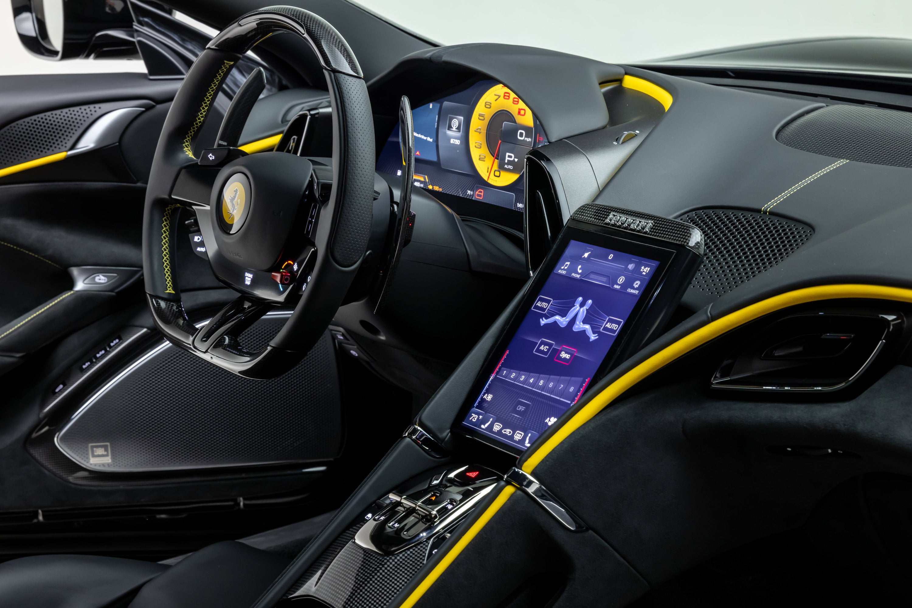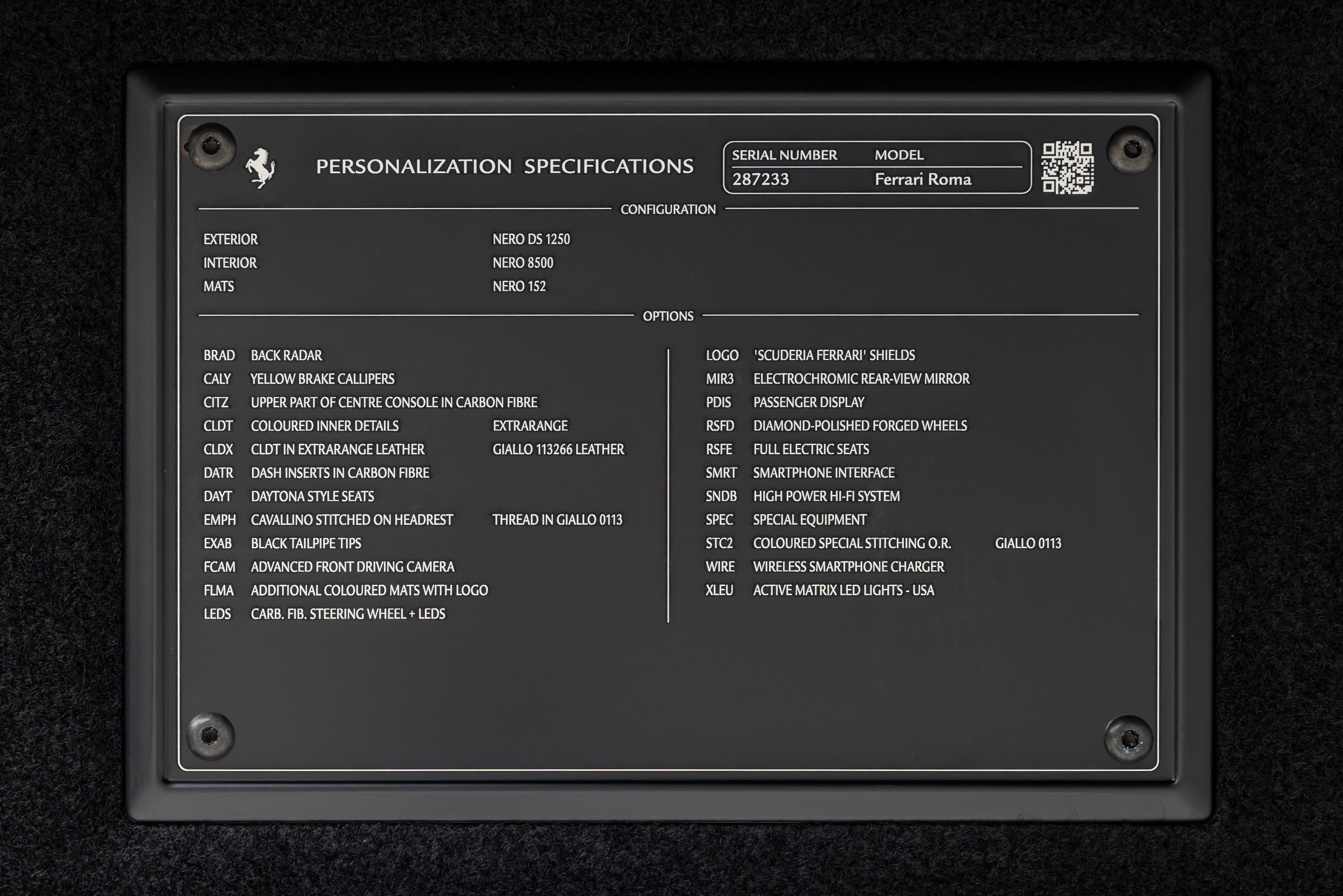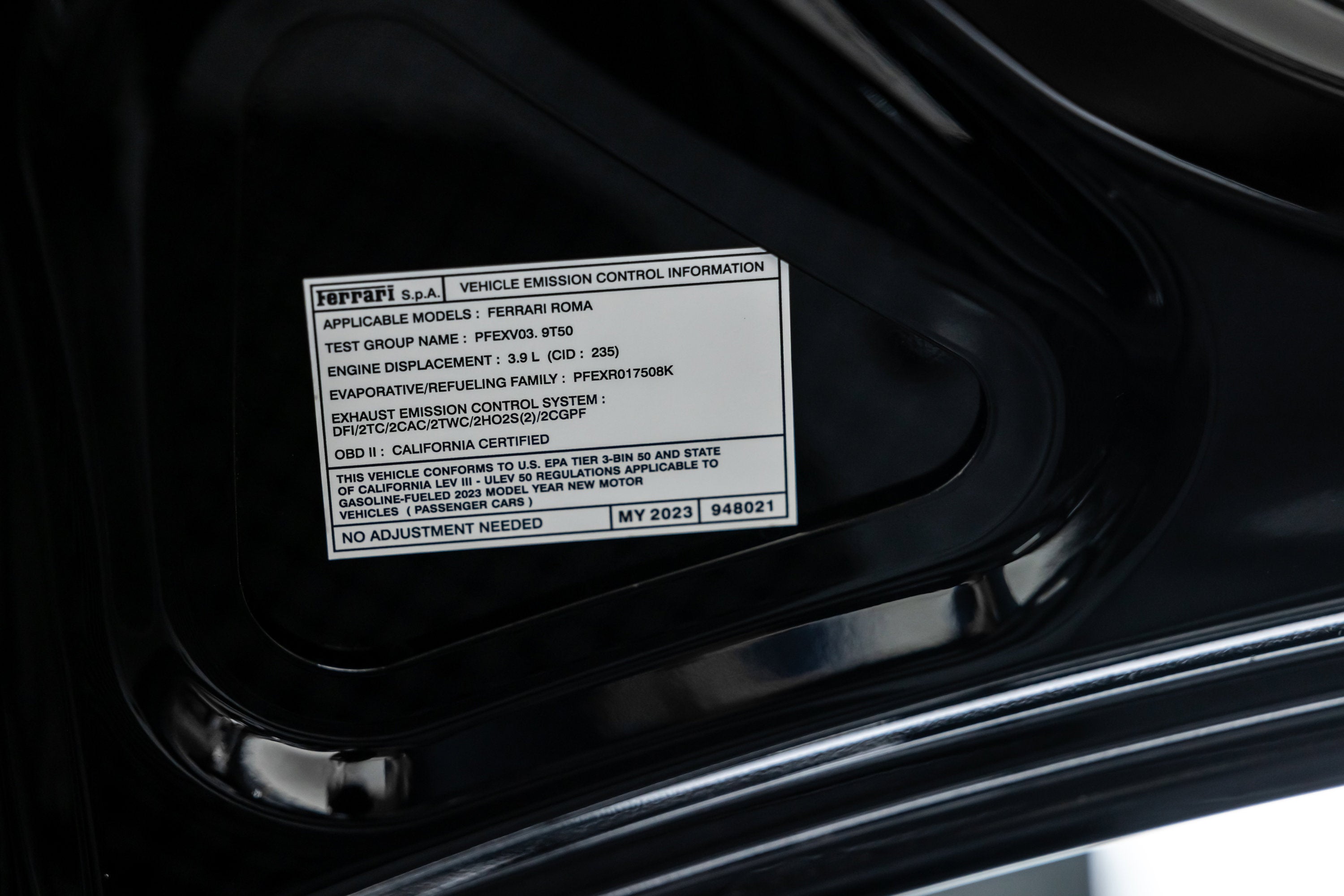 ===== 2023 Ferrari Roma ===== Nero over Nero with Giallo Accents 464 Miles | VIN: ZFF98RNA6P0287233 Finished in Nero, this 2023 Ferrari Roma presents an exceptionally clean and well-optioned example with just 464 miles. The deep black exterior highlights the Roma's elegant, minimalist design, while Giallo accents throughout provide subtle contrast and a classic Ferrari touch. The interior is trimmed in Nero leather with Giallo stitching, Cavallino embroidery, and matching details, creating a cohesive and driver-focused cabin. ==== Factory Options & Highlights (from window sticker) ==== * Carbon Fiber Steering Wheel with LEDs * Carbon Fiber Dashboard Inserts * Carbon Fiber Upper Tunnel Trim * Daytona Style Seats * Passenger Display Additional features include: