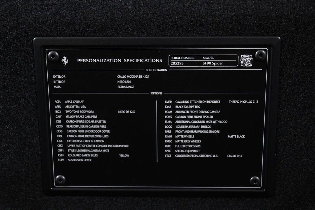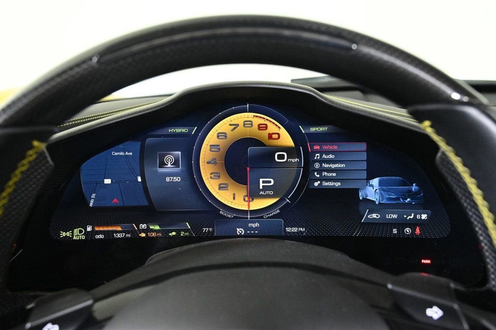 Recent Arrival! Yellow 2022 Ferrari SF90 Spider Base AWD 8-Speed Manual 4.0L V8 Difference From the moment you drive into our one-of-a-kind facility, you will feel a difference in the energy here. Simply put: we are not your ordinary car dealership. What truly differentiates us is the professional level of service we provide. When you acquire a new or pre-owned automobile from us, both you and your automobile are treated with the utmost care and attentiveness like a member of our own family. That is why so many of our clients return to THE COLLECTION time and again, and refer us time and time again. We have also amassed an extraordinary team of employees. Plus, we have created all-new positions with your needs in mind. Including a Client Delight Manager which oversees our concierge team and whose sole purpose is to surprise and delight our guests; and on-staff technologists available to assist and educate you on all the latest features available on your vehicle. THE COLLECTION family will exceed your expectations, making this an uniquely gratifying experience that you will want to revisit time and time again. CARFAX One-Owner. Air Conditioning, Climate Control, Cruise Control, Power Steering, Power Windows, Power Mirrors, Leather Steering Wheel, Leather Shifter, Power Passenger Seat, Memory Seat Position, Clock, Tachometer, Digital Info Center, Tilt Steering Wheel, Telescoping Steering Wheel, Steering Wheel Radio Controls, Driver Airbag, Passenger Airbag, Side Airbags, Keyless Entry, Security System, ABS Brakes, Traction Control, Dynamic Stability, Rear Defogger, Fog Lights, Intermittent Wipers, AM/FM, Alloy Wheels, Leather Interior Surface, Navigation System, Convertible HardTop, 6 Speakers, Radio data system, Automatic temperature control, Heads-Up Display, Power driver seat, Adaptive suspension, Four wheel independent suspension, 4-Wheel Disc Brakes, Ceramic disc brakes: front and rear, Dual front impact airbags, Dual front side impact airbags, Front anti-roll bar, Integrated roll-over protection, Low tire pressure warning, Passenger cancellable airbag, Rear anti-roll bar, Brake assist, Exterior Parking Camera Rear, Rear Parking Sensors, Delay-off headlights, Fully automatic headlights, Bumpers: body-color, Convertible roof wind blocker, Heated door mirrors, Power door mirrors, Spoiler, Apple CarPlay, Compass, Convertible roof lining, Driver door bin, Front reading lights, Illuminated entry, Outside temperature display, Overhead console, Power convertible roof, Sport steering wheel, Standard Seats, Telescoping steering wheel, Voltmeter, Front Center Armrest, Leather Seat Trim, Sport Plus Seats, Passenger door bin, Wheels: 20 x 9.5 Fr & 20 x 11.5 Rr, Glass rear window, Rain sensing wipers Adaptive headlights, Bluetooth, Carpeted Floor Mats, Center Arm Rest, Cup Holders, Daytime Running Lights, Heads Up Display, Heated Mirrors, Navigation System, Overhead Console, Parking Sensors, Premium Sound, Rear Fog Lamps, Rear Spoiler, Rear Spoiler, Remote Fuel Door, Remote Trunk Lid, Reverse Camera, Roll Stability Control, Tire Pressure Monitor - Contact Alvaro Uribe at 786-628-7606 or auribe@ferrariofmiami.com for more information. -