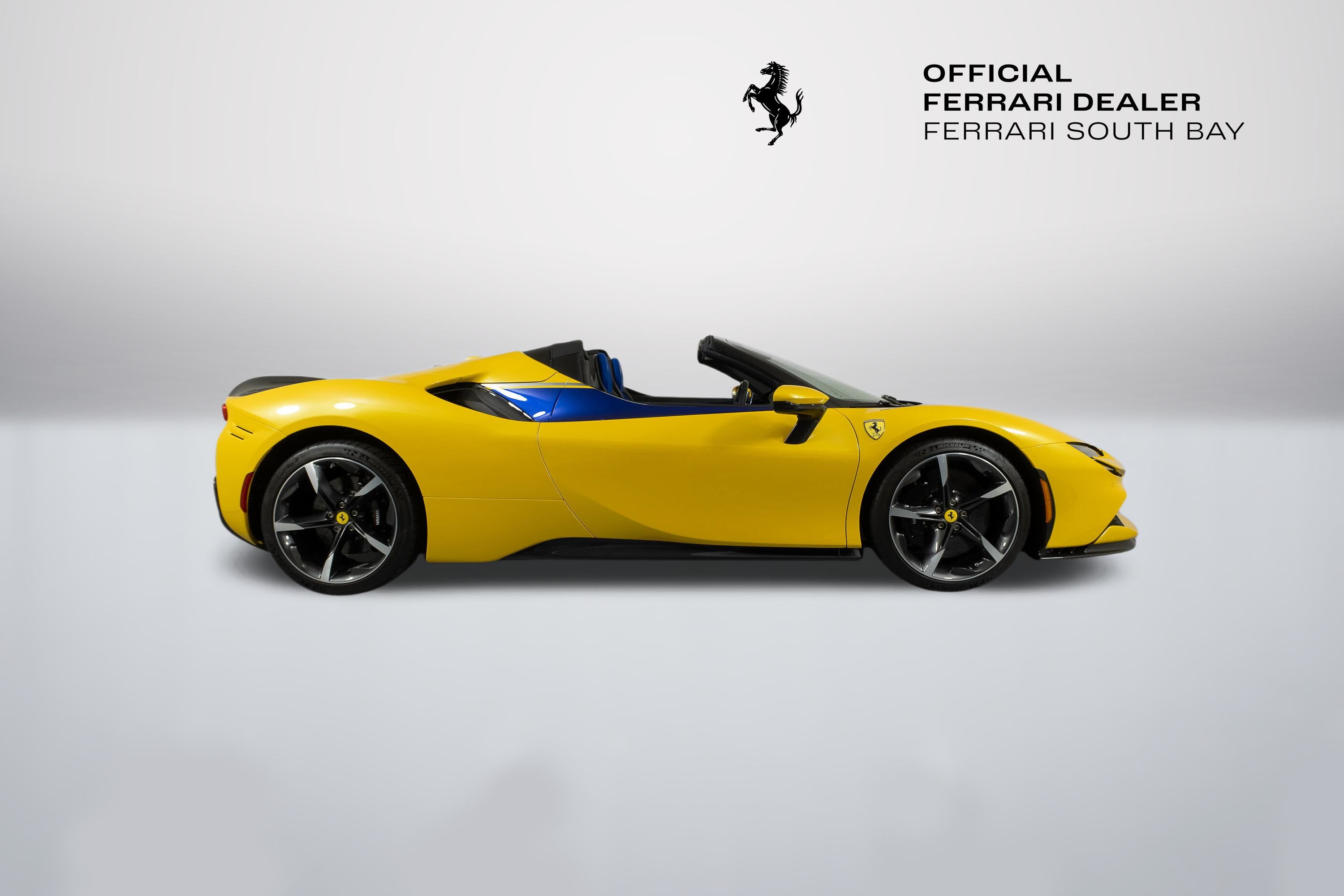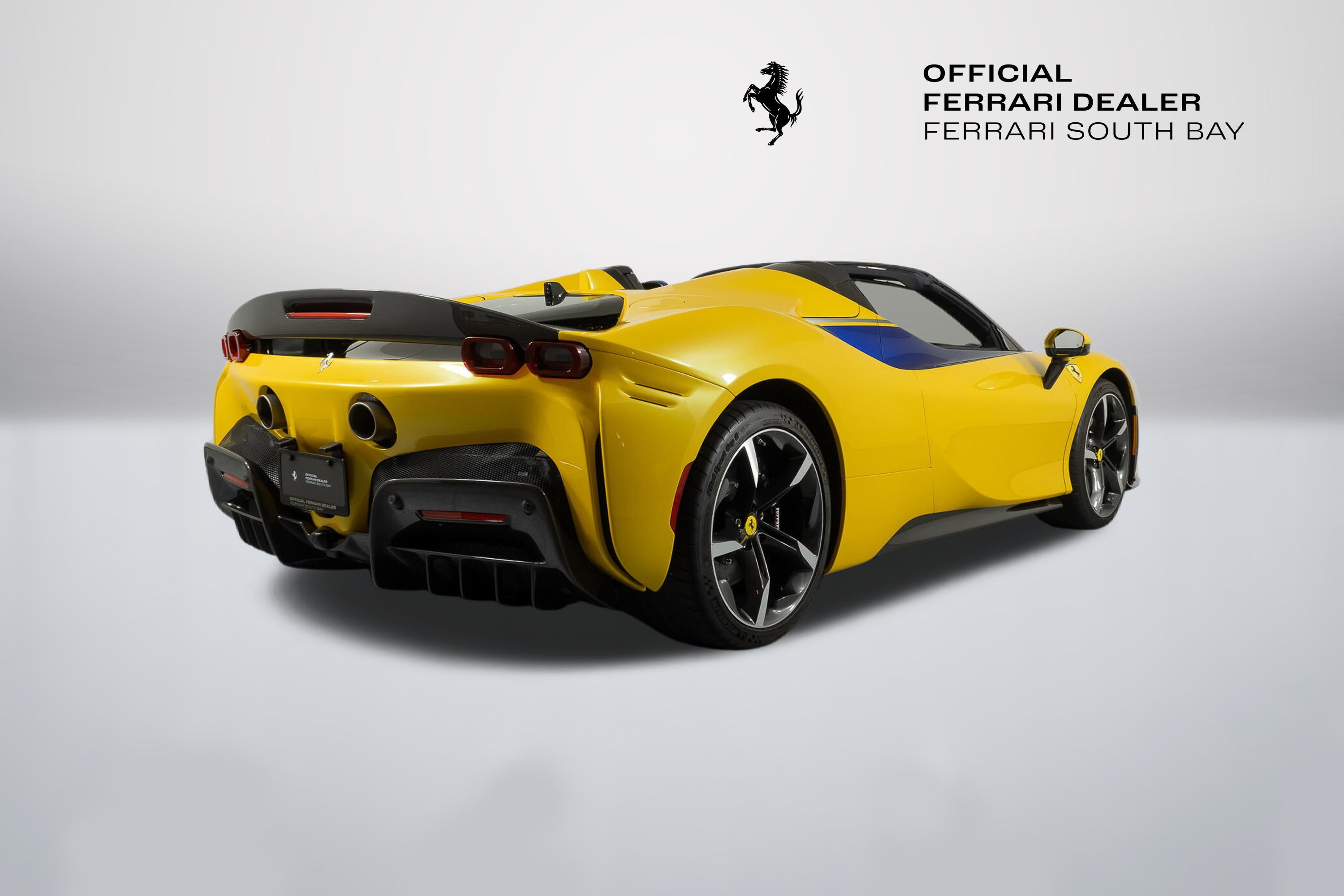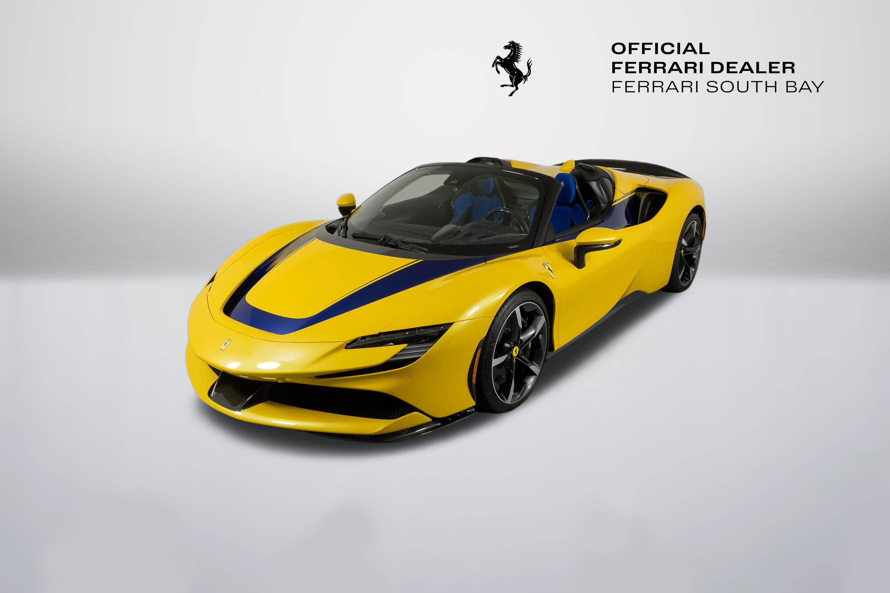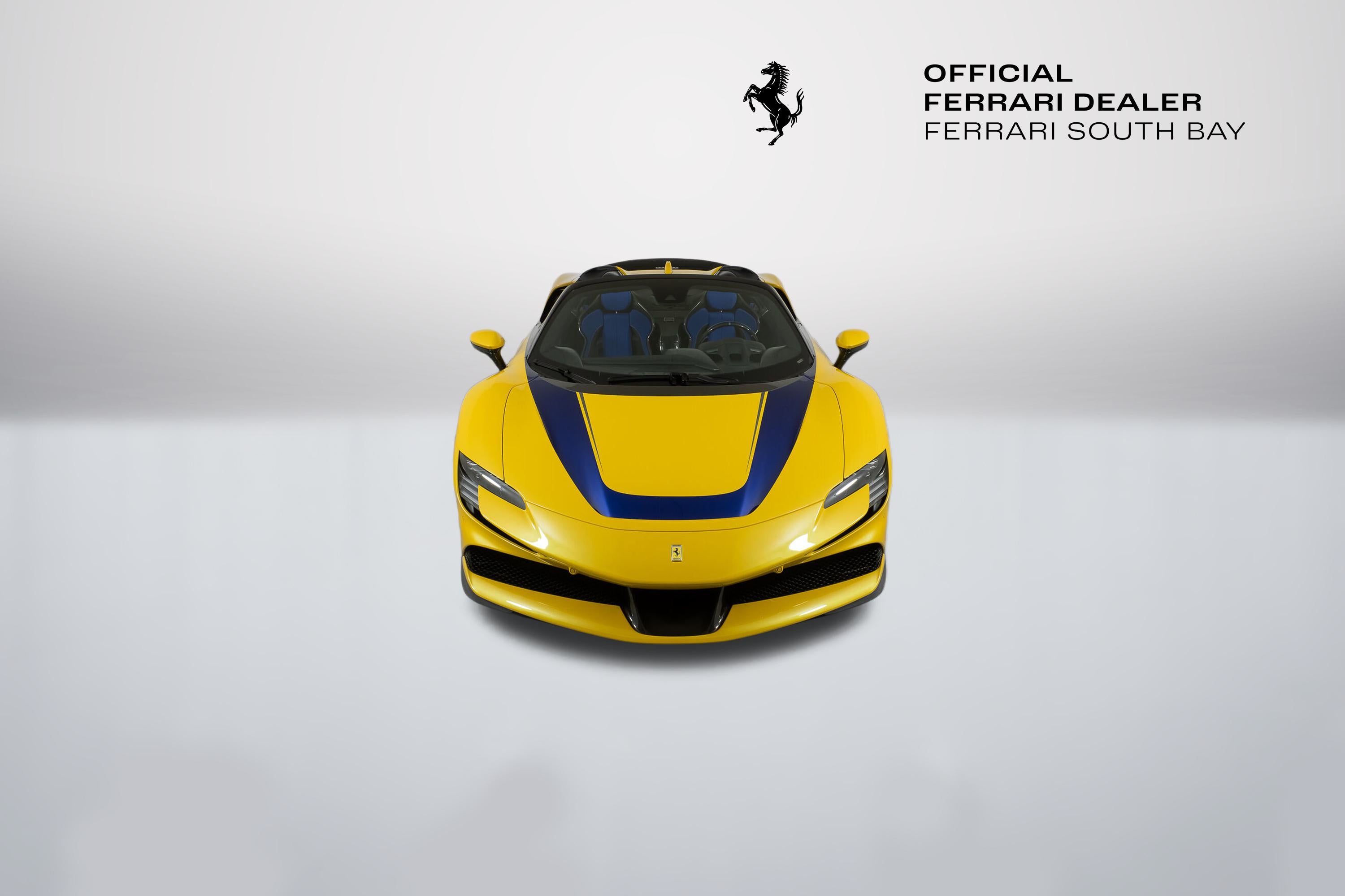 Ferrari South Bay is thrilled to offer this absolutely sensational Tailor Made SF90 Spider finished in stunning Two-Tone Giallo Sirius with Nero Roof and Blu Jeans Aunde Technical Fabric Interior. Packed with bespoke, one-of-a-kind details, this Spider is a total knockout, showcasing Ferrari's amazing personalization capabilities at the very top echelon of their Tailor Made program. There are so many unique aspects to this vehicle that no description can do the car justice - you have to see it to appreciate it! The exterior of this SF90 is finished in Special Four-Layer Giallo Sirius, and is accented with two-tone Dreamlines in Blu Torrice and Grigio Competizione. The body is two-tone, with a Nero roof to accentuate the feeling of a jet fighter cockpit, a design detail that harkens back to the legendary LaFerrari. 20 Forged Diamond Polished Wheels Ceramic Brakes with Black Calipers. Glossy Carbon Fiber is everywhere, covering the Side Air Splitters, Engine Covers, Rear Diffuser, Underdoor Covers and Central and Side Front Spoilers. Scuderia Ferrari Shields adorn the front fenders. Paint Protection Film covers the entire car, ensuring your investment will look terrific for years to come. The car is also fitted with Ferrari's Extended Fiorano Package which adds many pieces of Carbon Fiber which are unique to the package, including the Upper Shelf and the Rear Console. The Sill Kick, in Glossy Carbon Fiber, is adorned with the Assetto Fiorano logo in chrome. Special GT racing-derived Multimatic shock absorbers with Titanium Suspension Springs with track-optimized calibration ensure maximum capabilities on Road or Track. Weight is reduced by 8 kg from the standard version. The Assetto Fiorano package involves much more than simply replacing elements. Some components required that the standard basic structure of the car itself be redesigned to take advantage of the upgrades to the suspension. As bespoke as the exterior of this SF90 Spider is, the interior is a riot of custom touches. Nearly every interior finish has been individually specified. Blu Jeans Aunde Fabric with contrasting Silver Stitching throughout, including the Cavallinos embroidered on the headrests of the Carbon Fiber Racing Seats (which feature the Electric Lifter). Carbon Fiber finishes the Upper Part of the Center Console, Dashboard Air Vents and Inserts, Instrument Cover, Rear Shelf, Luggage Compartment, and the Steering Wheel (which is fitted with Ferrari's now-signature LED Shift Lights and features a Tricolore Dreamline on the Upper Arch). The F1 Shift Paddles are finished in Glossy Blu Torrice with Grigio Competizione Dreamlines (to match the exterior Dreamlines). Front and Rear Parking Sensors, Back Radar with Blind Spot Assist, and the Advanced Front Driving Camera assist with tight maneuvers. Apple CarPlay provides entertainment when traffic won't permit you to let the car's performance out of the bag. This Certified Pre-Owned SF90 Spider is offered with both original keys, books, tools, battery tender and car cover. The car covered by the Original Ferrari Factory Warranty through September 22, 2026 (and can easily be extended by up to two years at time of purchase). Ferrari Genuine Maintenance covers annual services through September 22, 2031. If you'd like to know more about this SF90 or set up a viewing, please reach out to one of our knowledgeable sales staff. Ferrari South Bay is proudly part of Holand Automotive Group, one of North America’s leading luxury automotive retailers. We offer nationwide shipping, trade-in opportunities, financing, client consignments, and world-class delivery service. Contact us today to explore ownership of this remarkable SF90 Spider. Please visit us at 23305 Hawthorne Blvd, Torrance, CA 90505, or call us at (888) 578-8767.
