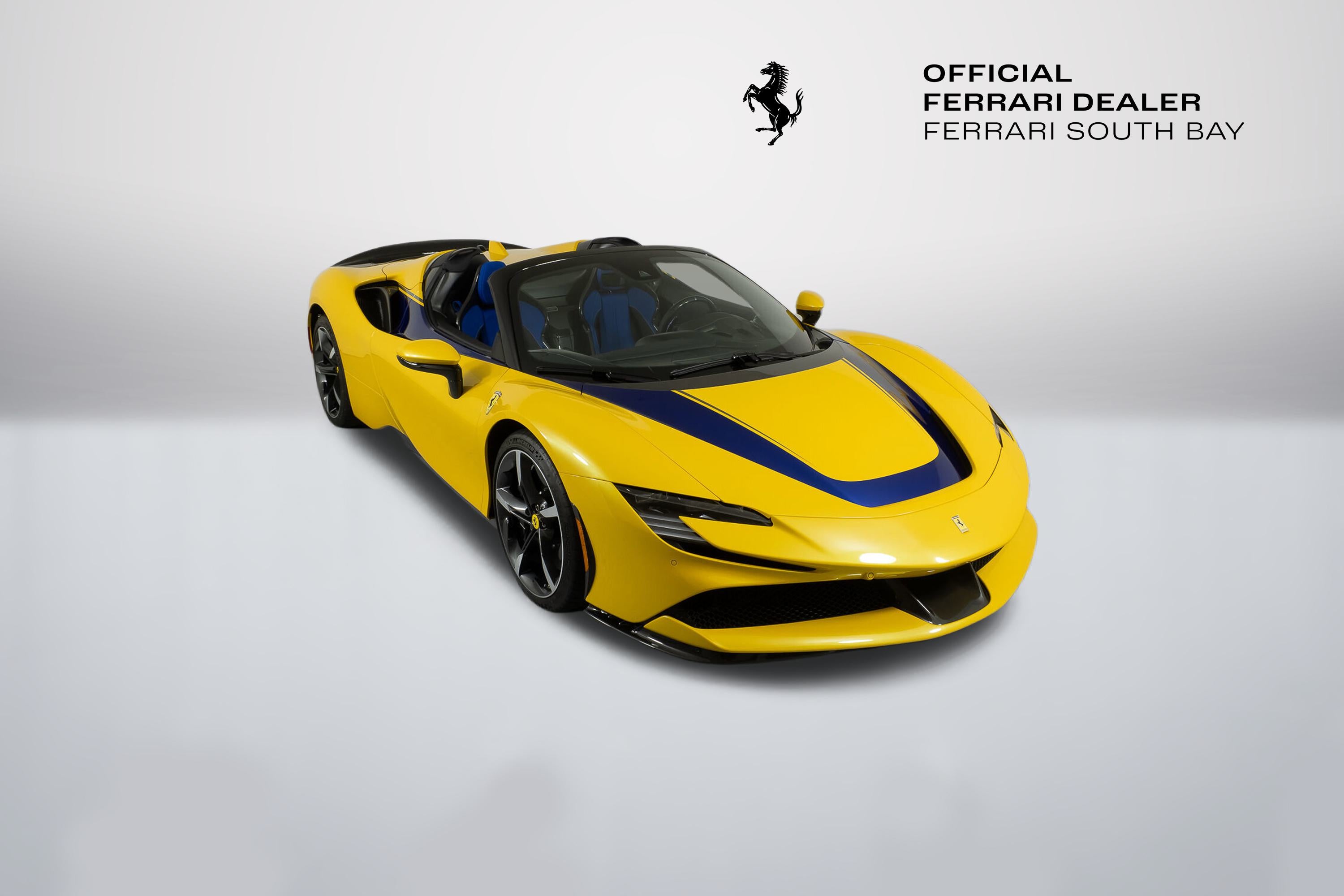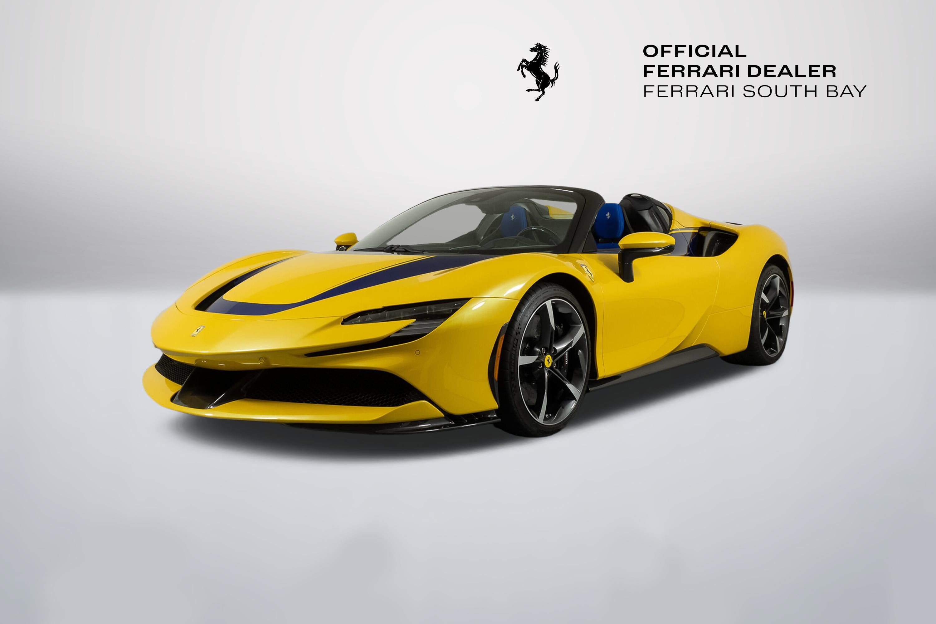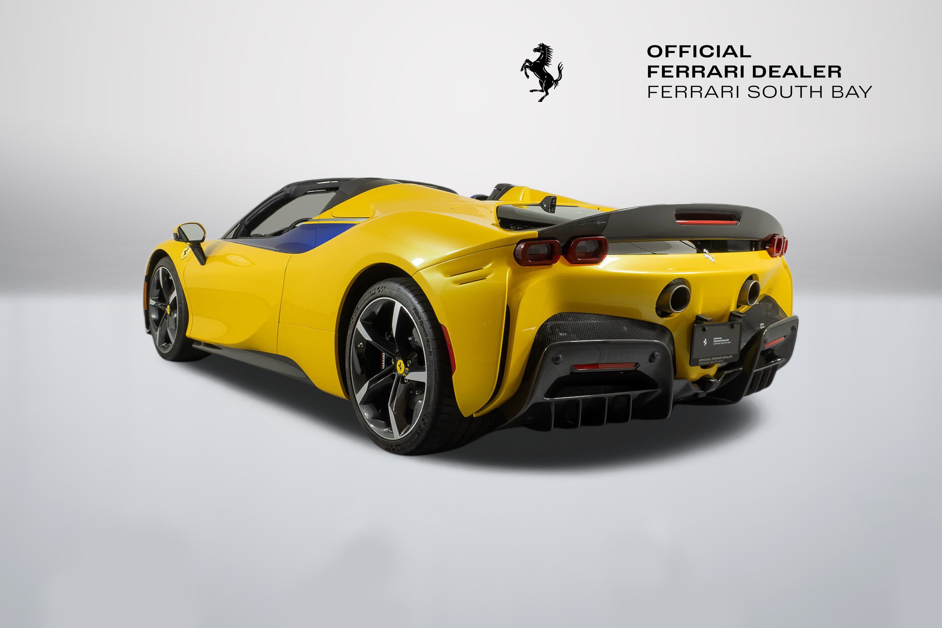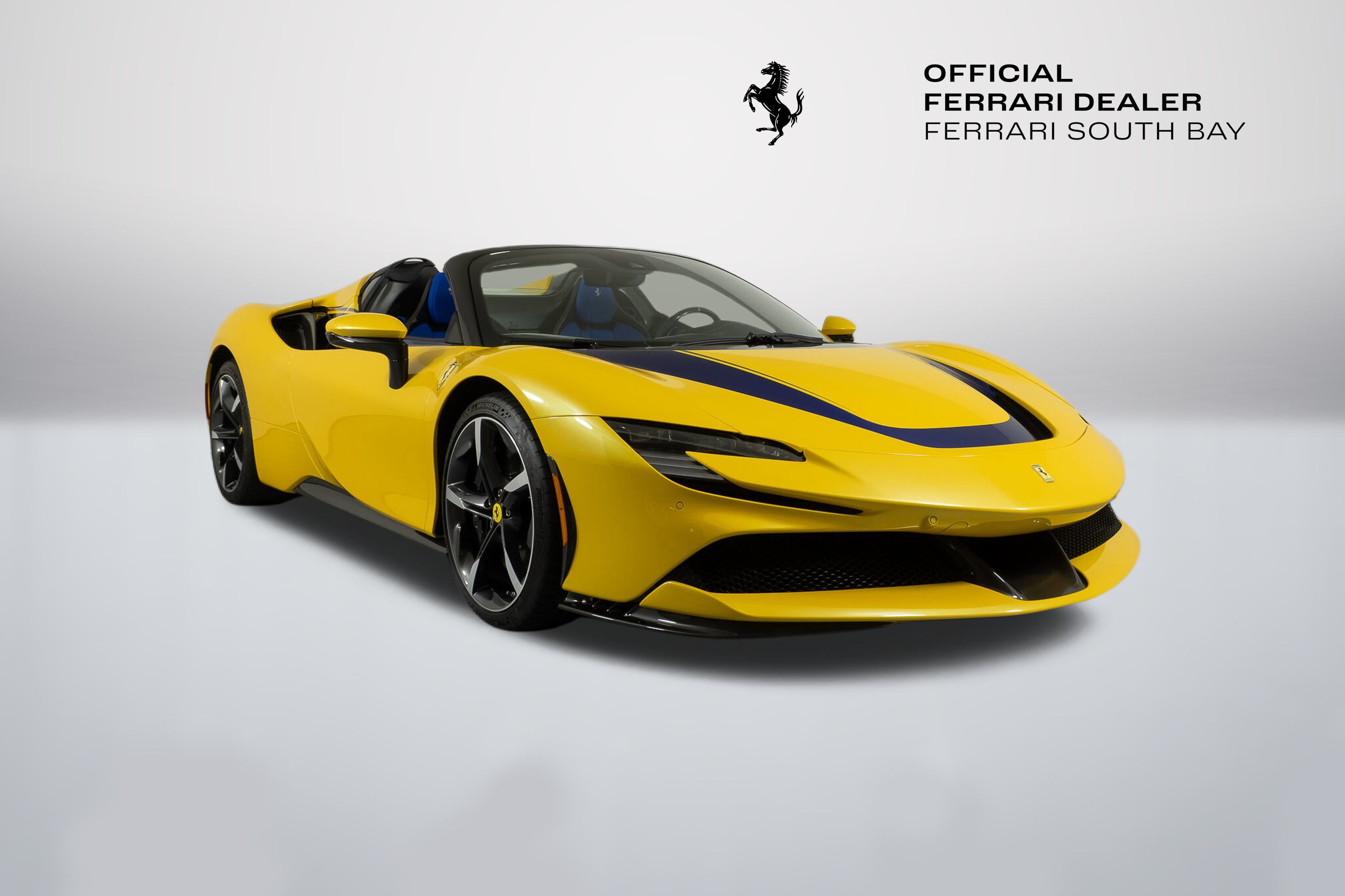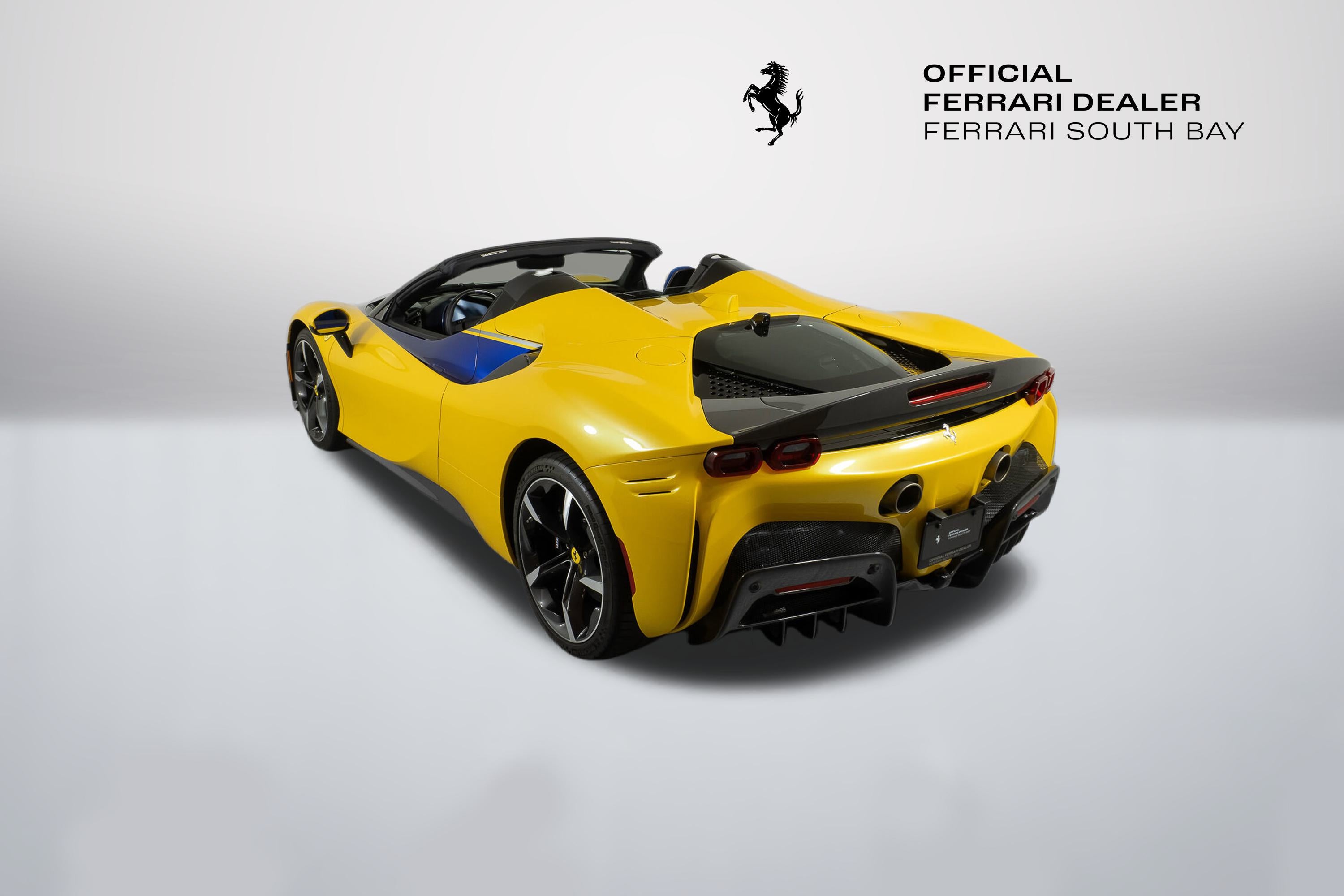Ferrari South Bay is thrilled to offer this absolutely sensational Tailor Made SF90 Spider finished in stunning Two-Tone Giallo Sirius with Nero Roof and Blu Jeans Aunde Technical Fabric Interior. Packed with bespoke, one-of-a-kind details, this Spider is a total knockout, showcasing Ferrari's amazing personalization capabilities at the very top echelon of their Tailor Made program. There are so many unique aspects to this vehicle that no description can do the car justice - you have to see it to appreciate it! The exterior of this SF90 is finished in Special Four-Layer Giallo Sirius, and is accented with two-tone Dreamlines in Blu Torrice and Grigio Competizione. The body is two-tone, with a Nero roof to accentuate the feeling of a jet fighter cockpit, a design detail that harkens back to the legendary LaFerrari. 20 Forged Diamond Polished Wheels Ceramic Brakes with Black Calipers. Glossy Carbon Fiber is everywhere, covering the Side Air Splitters, Engine Covers, Rear Diffuser, Underdoor Covers and Central and Side Front Spoilers. Scuderia Ferrari Shields adorn the front fenders. Paint Protection Film covers the entire car, ensuring your investment will look terrific for years to come. The car is also fitted with Ferrari's Extended Fiorano Package which adds many pieces of Carbon Fiber which are unique to the package, including the Upper Shelf and the Rear Console. The Sill Kick, in Glossy Carbon Fiber, is adorned with the Assetto Fiorano logo in chrome. Special GT racing-derived Multimatic shock absorbers with Titanium Suspension Springs with track-optimized calibration ensure maximum capabilities on Road or Track. Weight is reduced by 8 kg from the standard version. The Assetto Fiorano package involves much more than simply replacing elements. Some components required that the standard basic structure of the car itself be redesigned to take advantage of the upgrades to the suspension. As bespoke as the exterior of this SF90 Spider is, the interior is a riot of custom touches. Nearly every interior finish has been individually specified. Blu Jeans Aunde Fabric with contrasting Silver Stitching throughout, including the Cavallinos embroidered on the headrests of the Carbon Fiber Racing Seats (which feature the Electric Lifter). Carbon Fiber finishes the Upper Part of the Center Console, Dashboard Air Vents and Inserts, Instrument Cover, Rear Shelf, Luggage Compartment, and the Steering Wheel (which is fitted with Ferrari's now-signature LED Shift Lights and features a Tricolore Dreamline on the Upper Arch). The F1 Shift Paddles are finished in Glossy Blu Torrice with Grigio Competizione Dreamlines (to match the exterior Dreamlines). Front and Rear Parking Sensors, Back Radar with Blind Spot Assist, and the Advanced Front Driving Camera assist with tight maneuvers. Apple CarPlay provides entertainment when traffic won't permit you to let the car's performance out of the bag. This Certified Pre-Owned SF90 Spider is offered with both original keys, books, tools, battery tender and car cover. The car covered by the Original Ferrari Factory Warranty through September 22, 2026 (and can easily be extended by up to two years at time of purchase). Ferrari Genuine Maintenance covers annual services through September 22, 2031. If you'd like to know more about this SF90 or set up a viewing, please reach out to one of our knowledgeable sales staff. Ferrari South Bay is proudly part of Holand Automotive Group, one of North America’s leading luxury automotive retailers. We offer nationwide shipping, trade-in opportunities, financing, client consignments, and world-class delivery service. Contact us today to explore ownership of this remarkable SF90 Spider. Please visit us at 23305 Hawthorne Blvd, Torrance, CA 90505, or call us at (888) 578-8767.