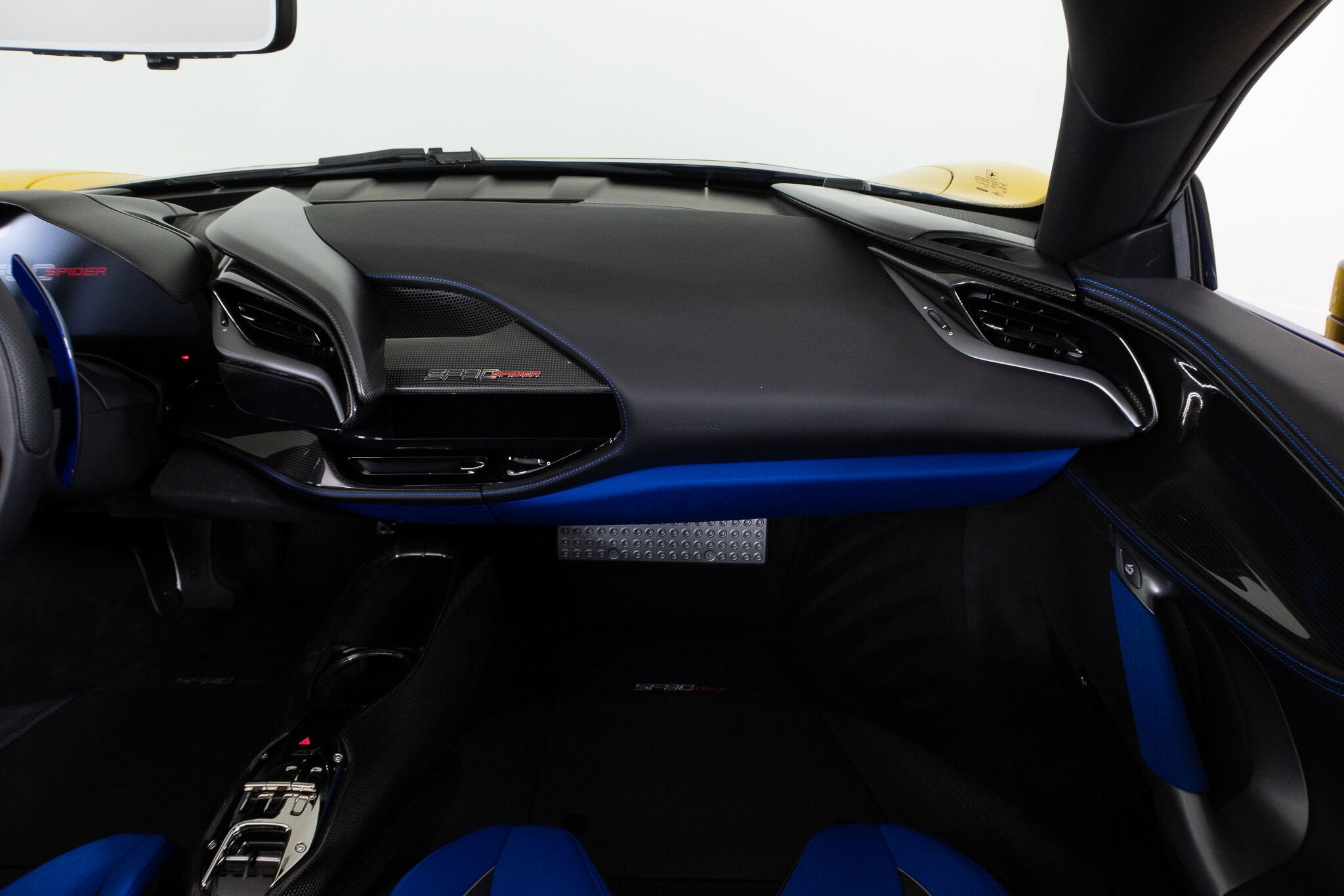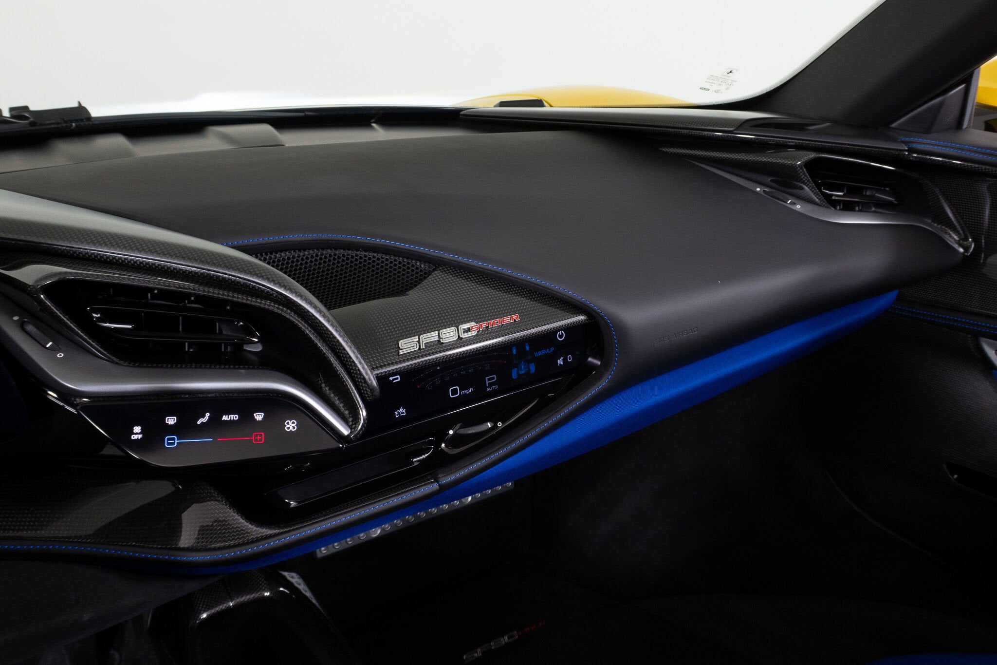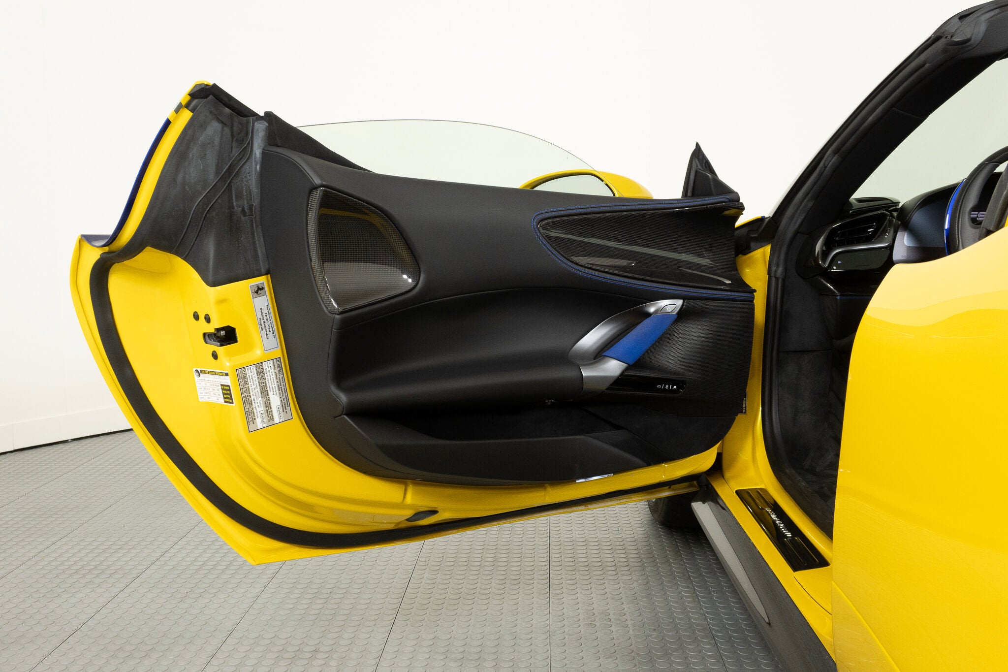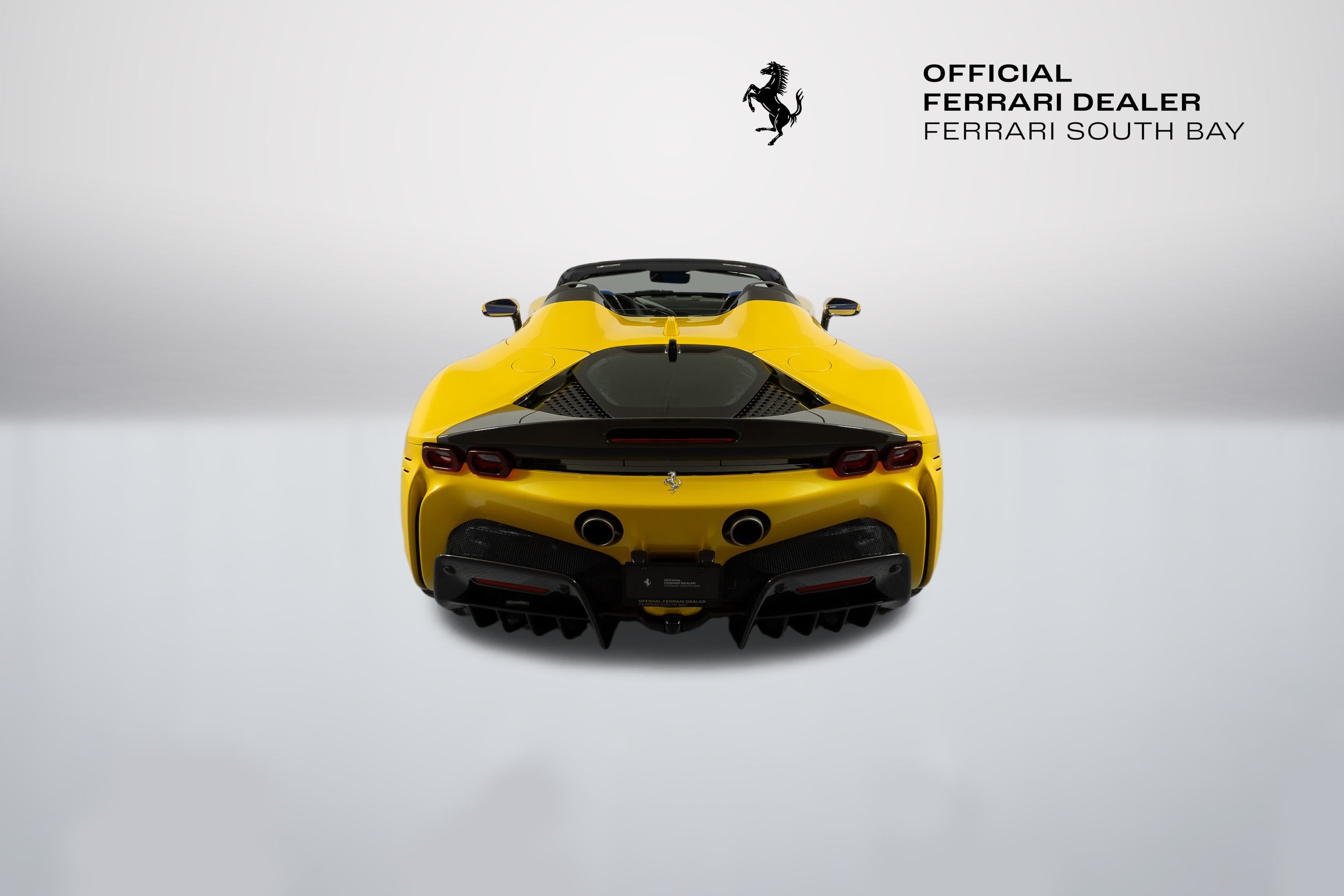 Ferrari South Bay is thrilled to offer this absolutely sensational Tailor Made SF90 Spider finished in stunning Two-Tone Giallo Sirius with Nero Roof and Blu Jeans Aunde Technical Fabric Interior. Packed with bespoke, one-of-a-kind details, this Spider is a total knockout, showcasing Ferrari's amazing personalization capabilities at the very top echelon of their Tailor Made program. There are so many unique aspects to this vehicle that no description can do the car justice - you have to see it to appreciate it! The exterior of this SF90 is finished in Special Four-Layer Giallo Sirius, and is accented with two-tone Dreamlines in Blu Torrice and Grigio Competizione. The body is two-tone, with a Nero roof to accentuate the feeling of a jet fighter cockpit, a design detail that harkens back to the legendary LaFerrari. 20 Forged Diamond Polished Wheels Ceramic Brakes with Black Calipers. Glossy Carbon Fiber is everywhere, covering the Side Air Splitters, Engine Covers, Rear Diffuser, Underdoor Covers and Central and Side Front Spoilers. Scuderia Ferrari Shields adorn the front fenders. Paint Protection Film covers the entire car, ensuring your investment will look terrific for years to come. The car is also fitted with Ferrari's Extended Fiorano Package which adds many pieces of Carbon Fiber which are unique to the package, including the Upper Shelf and the Rear Console. The Sill Kick, in Glossy Carbon Fiber, is adorned with the Assetto Fiorano logo in chrome. Special GT racing-derived Multimatic shock absorbers with Titanium Suspension Springs with track-optimized calibration ensure maximum capabilities on Road or Track. Weight is reduced by 8 kg from the standard version. The Assetto Fiorano package involves much more than simply replacing elements. Some components required that the standard basic structure of the car itself be redesigned to take advantage of the upgrades to the suspension. As bespoke as the exterior of this SF90 Spider is, the interior is a riot of custom touches. Nearly every interior finish has been individually specified. Blu Jeans Aunde Fabric with contrasting Silver Stitching throughout, including the Cavallinos embroidered on the headrests of the Carbon Fiber Racing Seats (which feature the Electric Lifter). Carbon Fiber finishes the Upper Part of the Center Console, Dashboard Air Vents and Inserts, Instrument Cover, Rear Shelf, Luggage Compartment, and the Steering Wheel (which is fitted with Ferrari's now-signature LED Shift Lights and features a Tricolore Dreamline on the Upper Arch). The F1 Shift Paddles are finished in Glossy Blu Torrice with Grigio Competizione Dreamlines (to match the exterior Dreamlines). Front and Rear Parking Sensors, Back Radar with Blind Spot Assist, and the Advanced Front Driving Camera assist with tight maneuvers. Apple CarPlay provides entertainment when traffic won't permit you to let the car's performance out of the bag. This Certified Pre-Owned SF90 Spider is offered with both original keys, books, tools, battery tender and car cover. The car covered by the Original Ferrari Factory Warranty through September 22, 2026 (and can easily be extended by up to two years at time of purchase). Ferrari Genuine Maintenance covers annual services through September 22, 2031. If you'd like to know more about this SF90 or set up a viewing, please reach out to one of our knowledgeable sales staff. Ferrari South Bay is proudly part of Holand Automotive Group, one of North America’s leading luxury automotive retailers. We offer nationwide shipping, trade-in opportunities, financing, client consignments, and world-class delivery service. Contact us today to explore ownership of this remarkable SF90 Spider. Please visit us at 23305 Hawthorne Blvd, Torrance, CA 90505, or call us at (888) 578-8767.