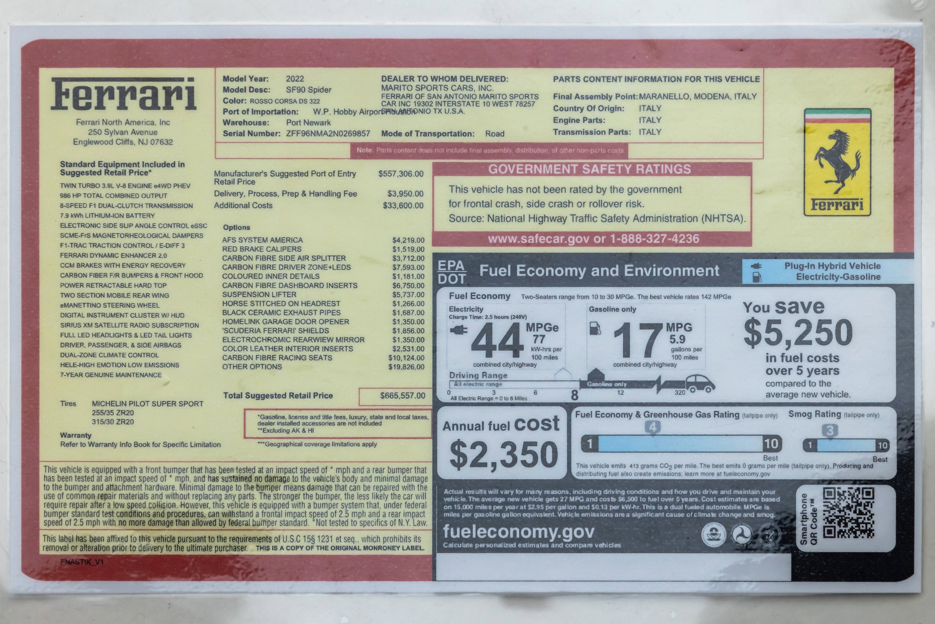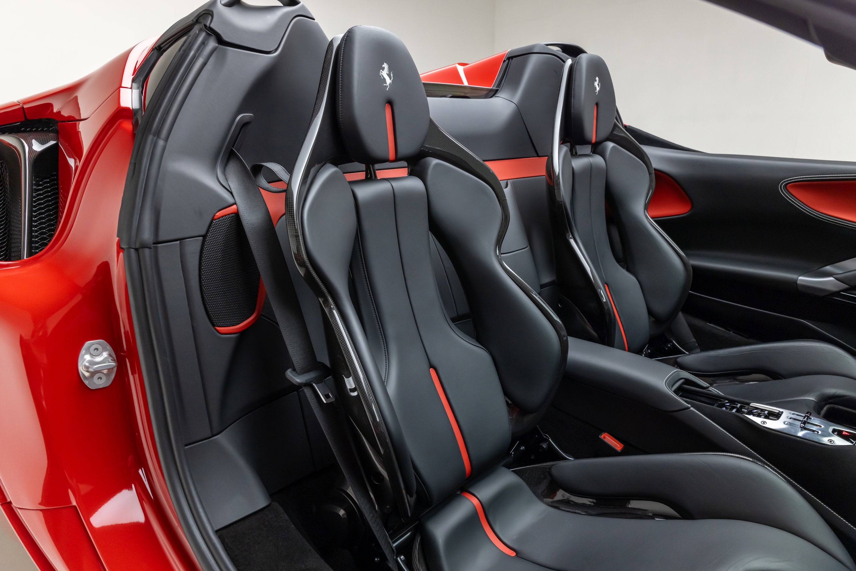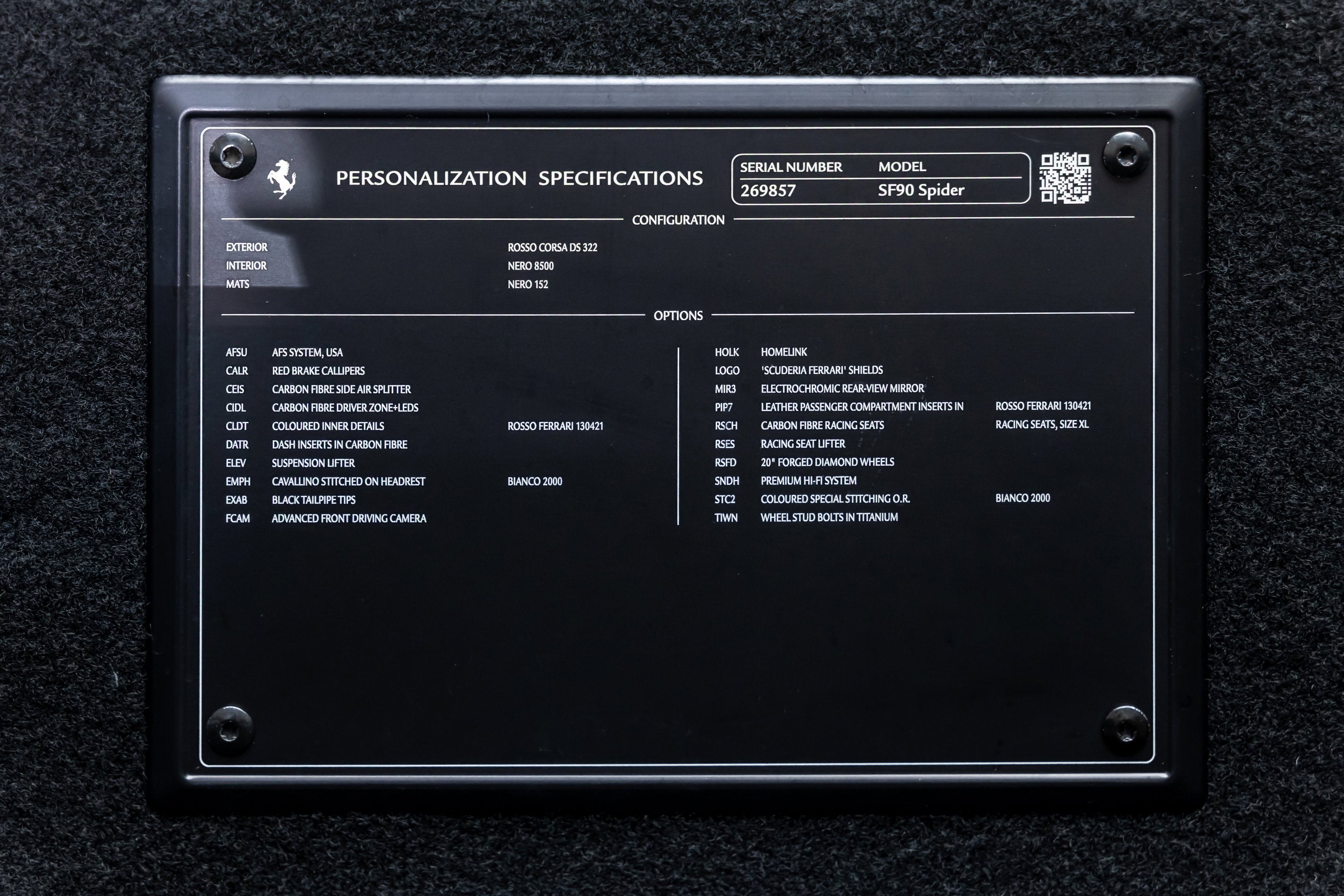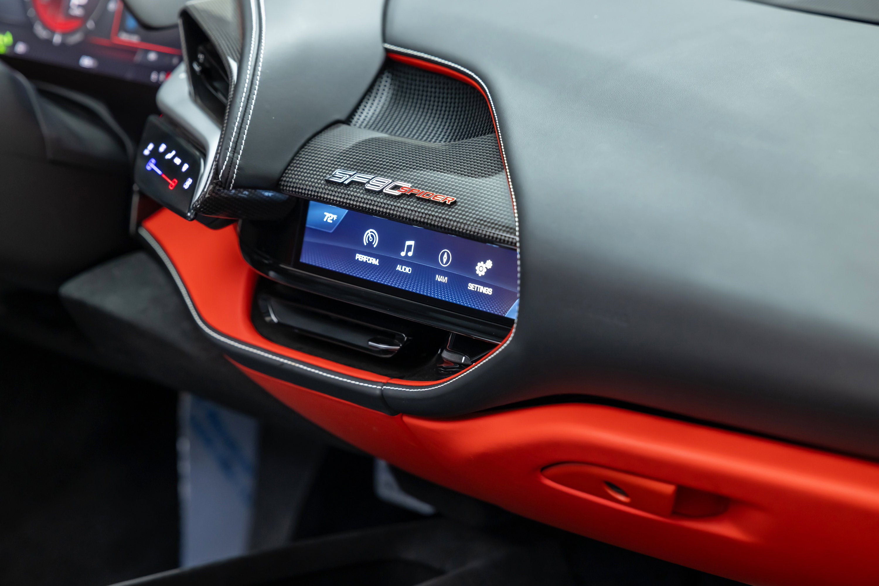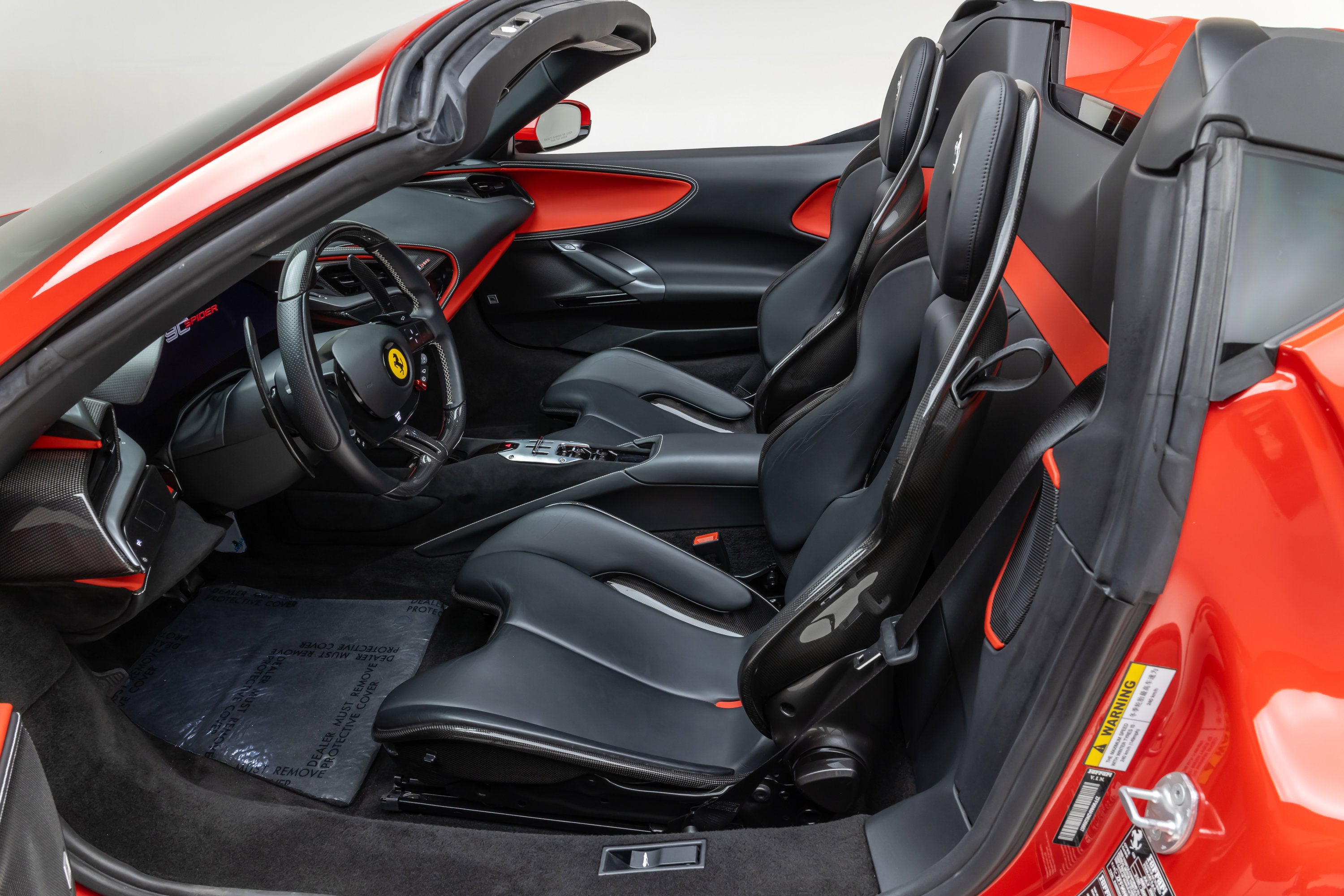 ===== 2022 Ferrari SF90 Spider ===== Rosso Corsa over Nero 2,849 Miles | VIN: ZFF96NMA2N0269857 Finished in Rosso Corsa over Nero, this 2022 Ferrari SF90 Spider presents a highly desirable and performance-focused specification with just 2,849 miles. Combining Ferrari's flagship hybrid technology with open-top driving, this example is equipped with extensive carbon fiber options and key driver-focused features that enhance both performance and visual presence. The cabin is trimmed in Nero leather, complemented by carbon fiber driver zone elements and racing seats, creating a purposeful and driver-centric interior environment. ==== Factory Options & Highlights (from window sticker) ==== * Carbon Fiber Racing Seats * Carbon Fiber Driver Zone with LEDs * Carbon Fiber Dashboard Inserts * Suspension Lifter Additional features include: