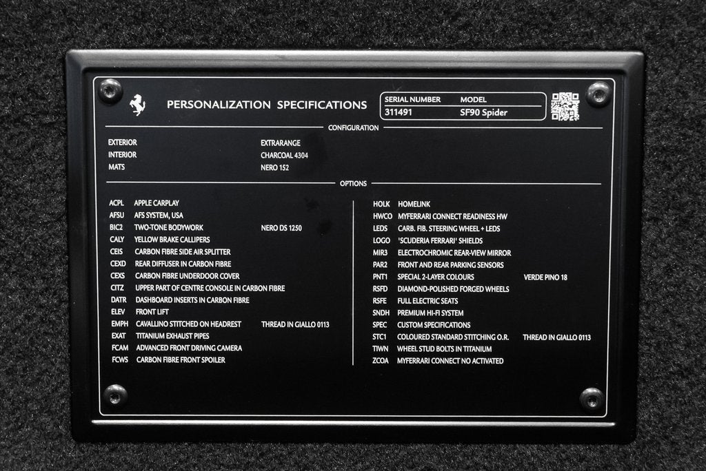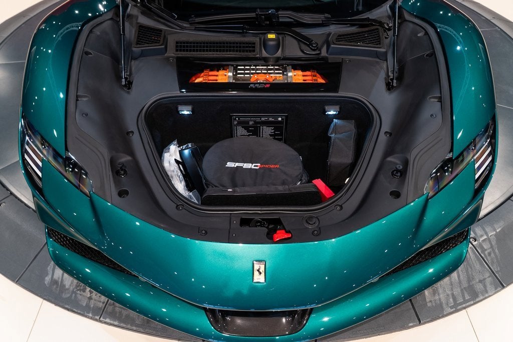 Ferrari of Lake Forest is Proud to Present this 2024 Ferrari SF90 Spider Finished in Special 2 Layer Verde Pino over Charcoal Leather Interior. This Ferrari SF90 Spider is Optionally Equipped with: AFS System Two Tone Body Work in Nero Yellow Brake Calipers Carbon Fiber Side Air Splitter Rear Diffuser in Carbon Fiber Carbon Fiber Under Door Cover Front Suspension Lifter Titanium Exhaust Pipes Carbon Fiber Front Spoiler Scuderia Ferrari Shields Diamon Polished Forged Wheels Front and Rear Parking Sensors Wheel Stud Bolts in Titanium Apple CarPlay Upper Part of Center Console in Carbon Fiber Dashboard Inserts in Carbon Fiber Cavallino Stitched on Headrests in Giallo Advanced Front Driving Camera Homelink Carbon Fiber Steering Wheel with LEDs Electrochromic Rear View Mirror Full Electric Seats Premium HiFi System Colored Standard Stitching in Giallo The Ferrari SF90 Spider is what happens when Maranello decides physics is optional. With nearly a thousand horsepower from a twin-turbo V8 and three electric motors, it launches like its been fired from an aircraft carrier. Roof down, its part supercar, part sci-fi experiment, all drama. This isnt just a convertible Ferrari. Its a plug-in hypercar that laughs at traction and redefines what fast feels like. For more information on this Ferrari SF90 Spider call one of our Ferrari Specialists today at 847.295.6560