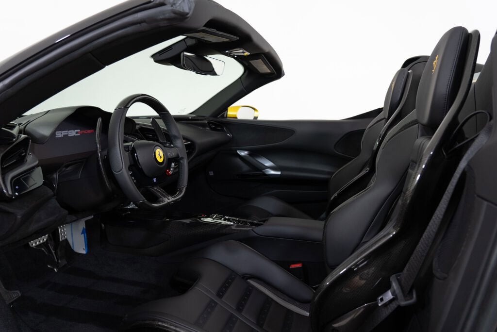 Ferrari Westlake is proud to present the availability of this one-owner, 2022 Ferrari SF90 Spider finished in the launch color for this model Giallo Montecarlo. Sporting a Nero leather interior with brake calipers to match the occasion, the subtle details on this vehicle all work harmoniously to culminate into something truly special. Whether it’s the Daytona Alcantara inserts to contrast the leather on the seats, the gold stitching to compliment the body color, the functional suspension lifter, or the healthy amount of Carbon Fiber additions, this SF90 Spider is a beautiful example of the Prancing Horse’s first production plug-in hybrid spider in all its glory. The SF90 Spider has an internal combustion engine integrated with two electric motors at the front, which comprise the RAC-e (Cornering Angle Regulator, Electric) system, as well as one at the rear derived from and named after a Prancing Horse Formula 1 innovation, the MGUK (Motor Generator Unit, Kinetic). Power is sent to all four wheels, making this the first mid-engine Ferrari with all-wheel drive. The 4.0-liter twin-turbocharged V-8 generates a mighty 769 horsepower on its own, and the trio of electric motors provide an additional 217 horsepower. The synergy between the internal combustion engine and the electric motors unleashes a net output of 986 horsepower and 590 lb-ft of torque for a truly unforgettable experience. Exterior Options 2 Layer Special Paint Giallo Montecarlo Paintwork, Two-Tone Body Work in Nero, Forged Diamond Polished Wheels, Suspension Lifter & AFS System, Nero Brake Calipers, Gloss Finish Carbon Fiber Lateral Engine Air Intakes, Gloss Finish Carbon Fiber Engine Compartment Shields, Carbon Fiber Lateral Rear Screen Accents, Carbon Fiber Diffuser, Carbon Fiber Under-Door Trim, Carbon Fiber Wheel Center Caps, Gloss Finish Carbon Fiber Lateral & Front Spoilers, Black Ceramic Coated Tailpipes, Scuderia Ferrari Shields, Titanium Wheel Studs, Advanced Front Driving Camera, Electrochromatic Rear View Mirrors. Interior Options Nero Leather Interior, Carbon Fiber Trim Driver Zone + LED Shift Indicators on Steering Wheel, Carbon Fiber Daytona Racing Seats, Alcantara Nera Daytona Seat Inserts, Manual Ratchet Adjustment Seat Mechanism, Gloss Finish Carbon Fiber Dashboard Accents, Gloss Finish Carbon Fiber Exterior Kickplate, Gloss Finish Carbon Fiber Front Tunnel, Matte Finish Carbon Fiber Upper Dashboard, Embroidered Cavallino on Headrest in Oro, Premium HIFI System, Homelink, Apple Carplay. This SF90 Spider comes with an active factory warranty until 12/27/2025 as well as annual maintenance until 12/27/2029. Please contact our Ferrari Westlake Sales Team for further information or to schedule your appointment.