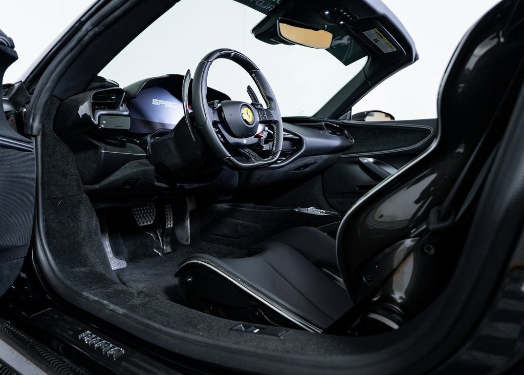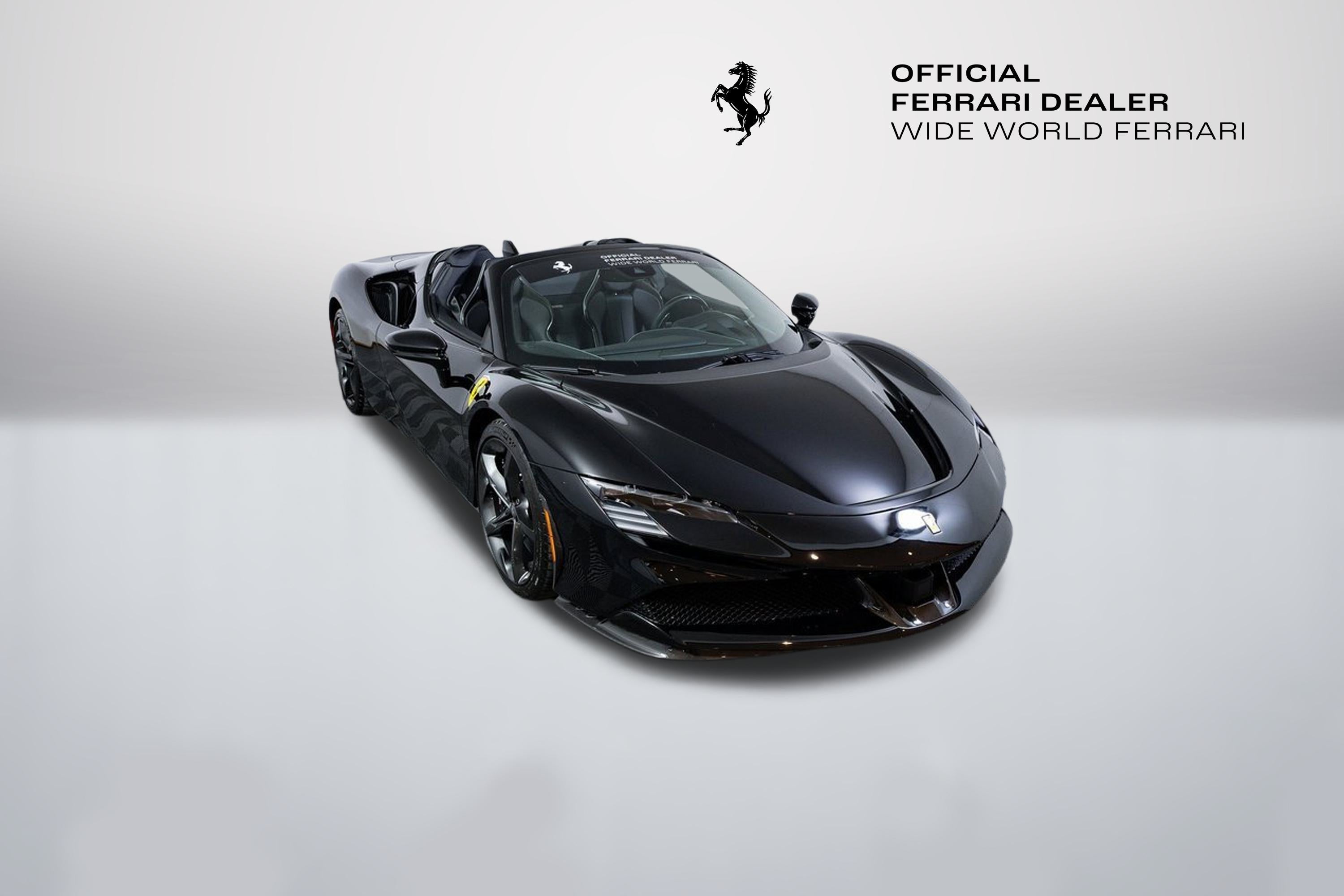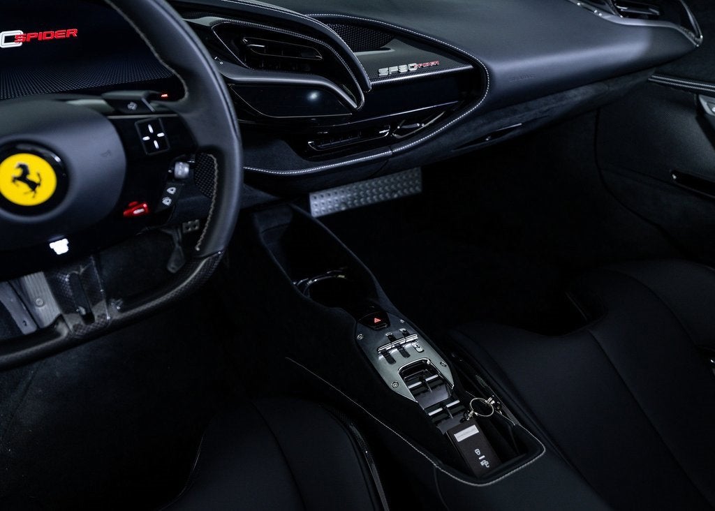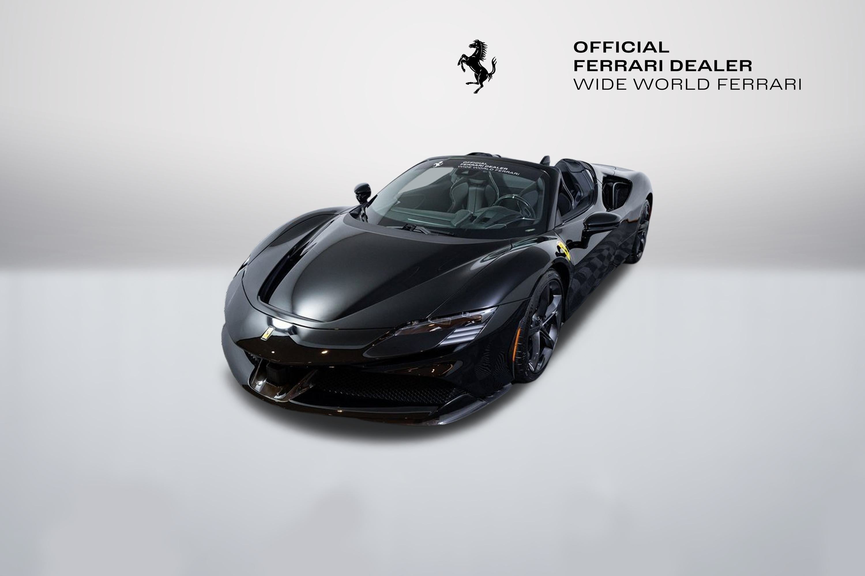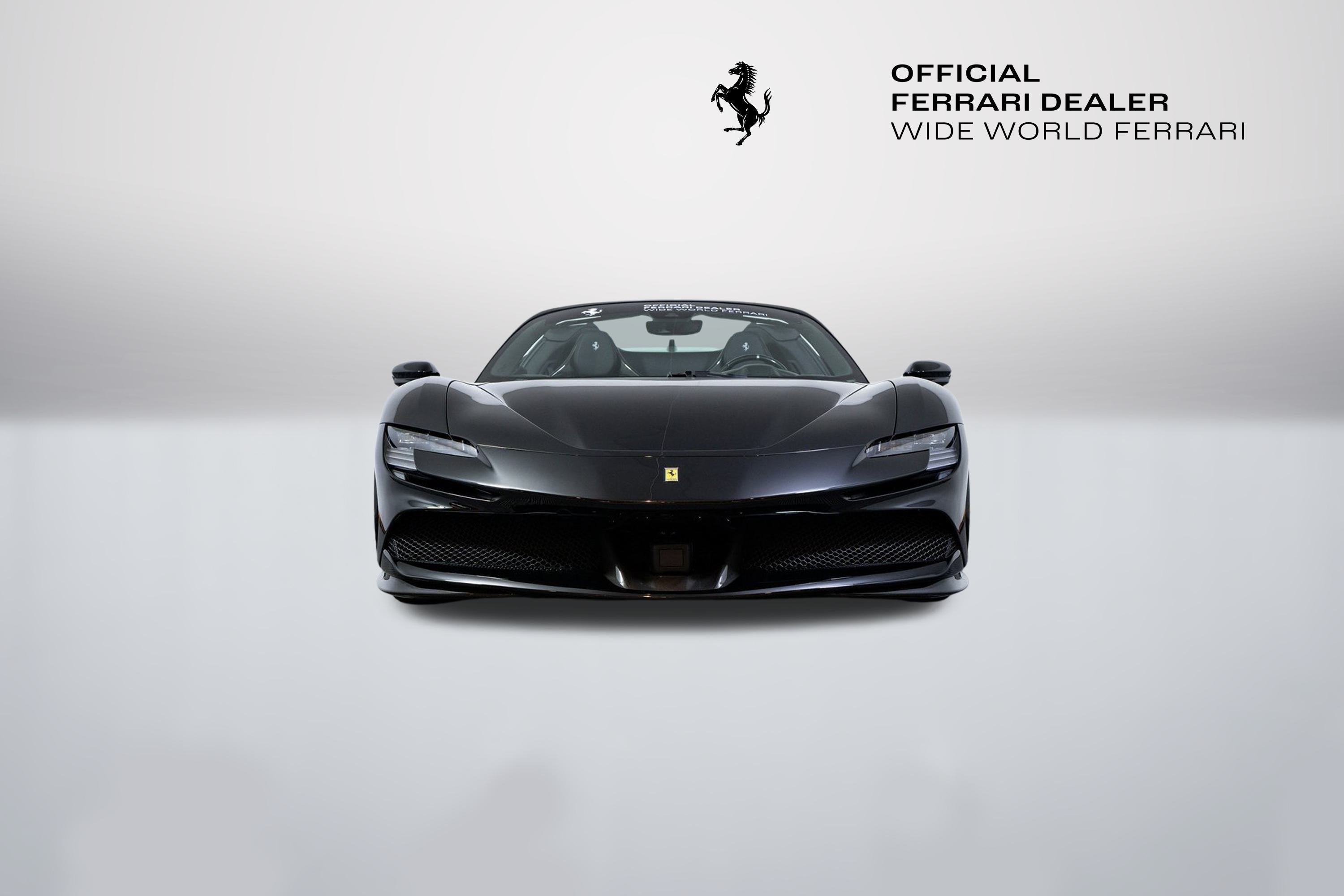 Wide World Ferrari is proud to present this virtually new 2024 Ferrari SF90 Spider, a breathtaking expression of Ferraris flagship open-top hybrid supercar. Showing just 134 miles, this one-owner example features a clean Carfax and an original MSRP of nearly $713,000, reflecting an exceptionally curated factory specification from Ferrari's Atelier studio in NYC. Finished in Nero, the exterior exudes stealth, sophistication, and unmistakable presence. The deep black finish is elevated by an extensive selection of gloss finish carbon fibre elements, including the lateral engine air intakes, front and lateral spoilers, exterior kickplates, under-door trim, and rear carbon fibre diffuser, all enhancing both aerodynamic performance and visual drama. Black ceramic coated tailpipes complement the darkened aesthetic, while 20 forged wheels in Canna di Fucile paired with titanium wheel studs deliver an aggressive, motorsport-inspired stance. Completing the exterior are carbon fibre wheel center caps and the iconic Scuderia Ferrari airbrushed shields, adding a bespoke Atelier-level touch. The cabin is a striking fusion of modern luxury and advanced performance design. Upholstered in Metallic Extrarange Leather Pelle Argento Metallizzato, the interior is contrasted beautifully by a Nero leather headliner, Argento Scuro special contrast stitching, and refined detailing throughout. Carbon fibre racing seats with seat height adjustment provide exceptional support while reinforcing the SF90s Formula 1inspired character. The driver-focused cockpit is finished with extensive carbon fibre, including gloss carbon dashboard accents and the carbon fibre steering wheel with integrated LED shift lights, placing race-bred technology directly at the drivers fingertips. This SF90 Spider is equipped with an impressive suite of advanced technology and driver-assistance features, including Adaptive Cruise Control with front radar, Blind Spot Detection with rear radar, Advanced Front Driving Camera, suspension lifter, electrochromic exterior mirrors, and Apple CarPlay, delivering everyday usability without compromising the cars extraordinary performance capabilities. Additionally, the car is Ferrari Approved and eligible for up to a 2-year Ferrari Certification warranty (available at an additional charge). This car benefits from an active warranty until Oct 2027 and complimentary maintenance until Oct 2031. As the only 4-Time Cavallino Winning Ferrari Center in the tri-state area and one of the first Ferrari Centers in North America, we pride ourselves on exceptional service. We assist with all aspects of your purchase, including trade-ins, shipping, registration, non-reported financing, and customizations. Conveniently located in Rockland County, just under 30 miles from Manhattan. For more information, email us at ferrarivip@newcountry.com or call 845-682-0129.
