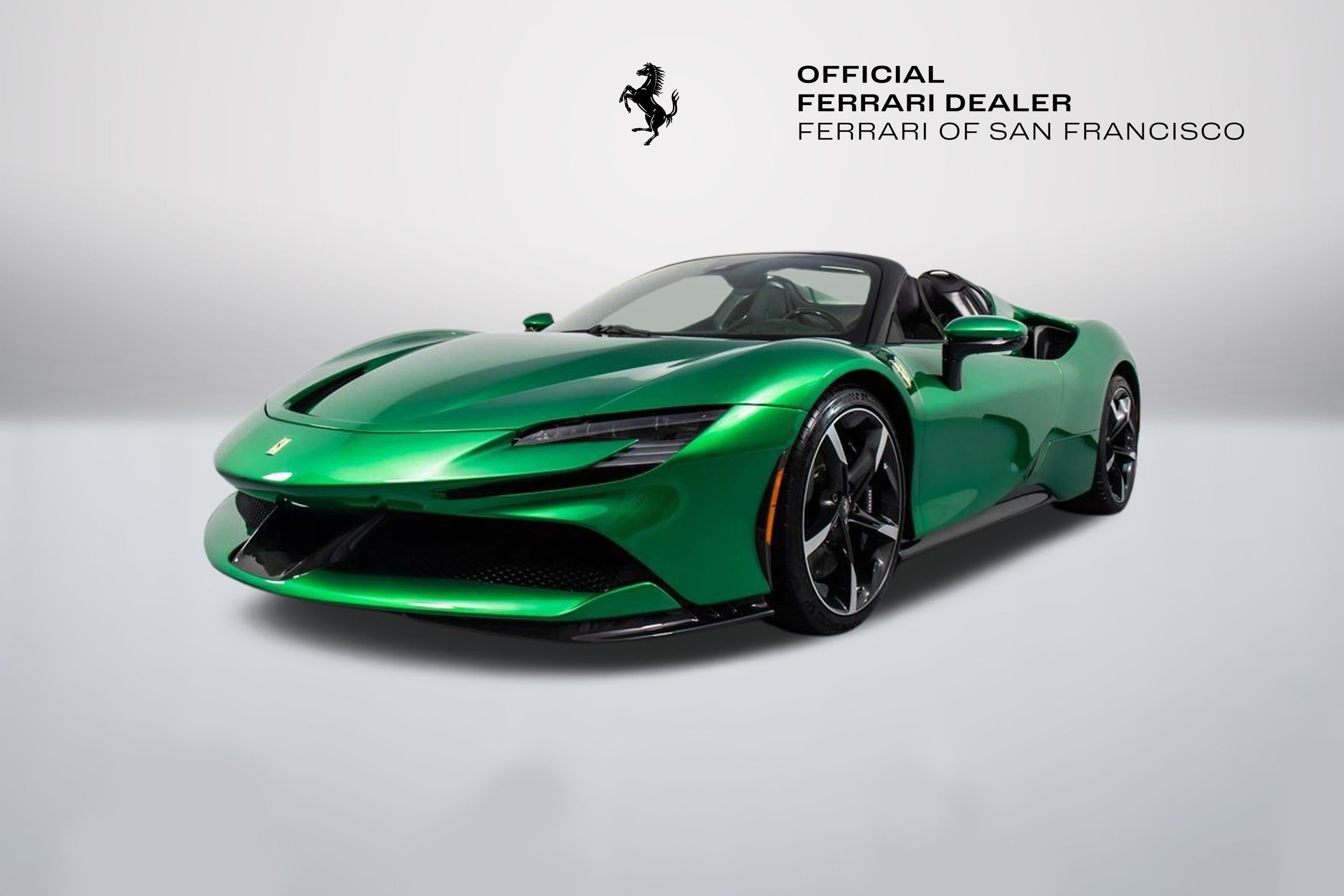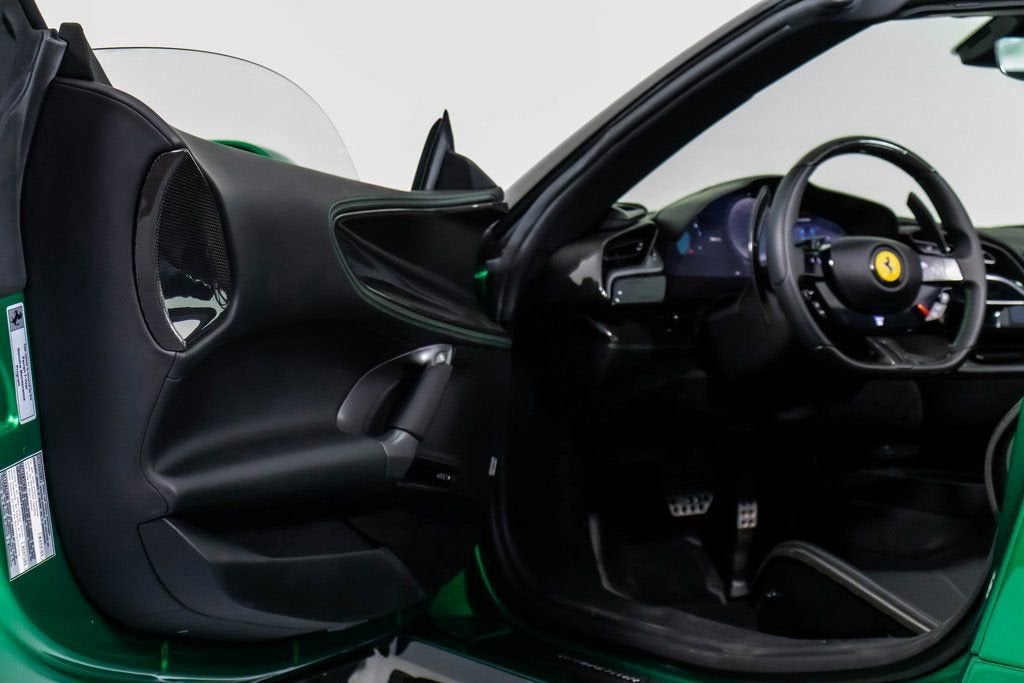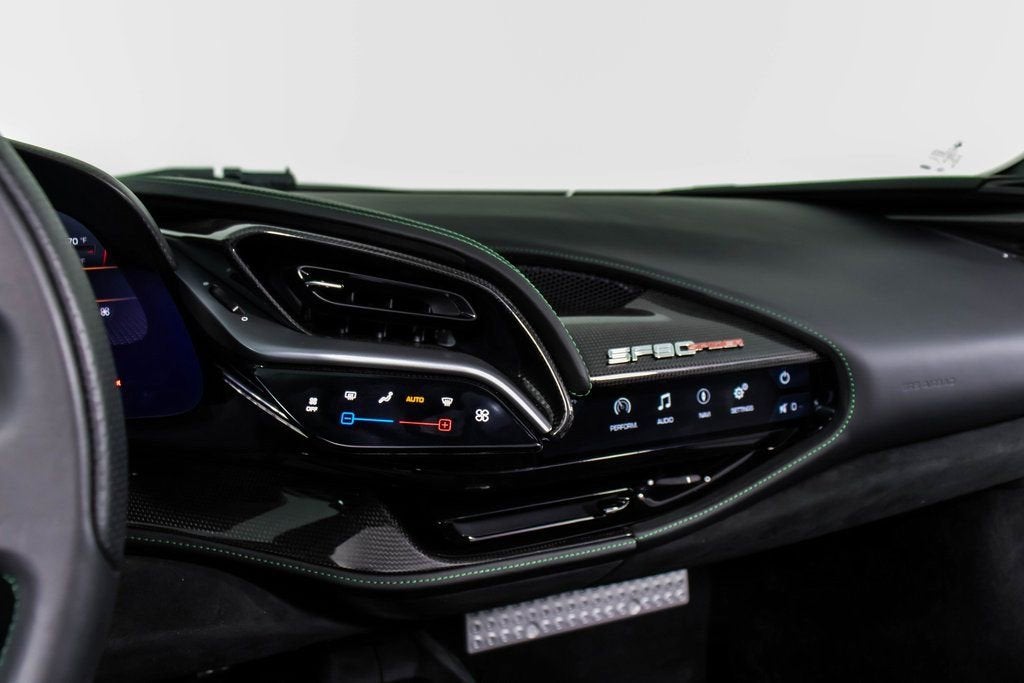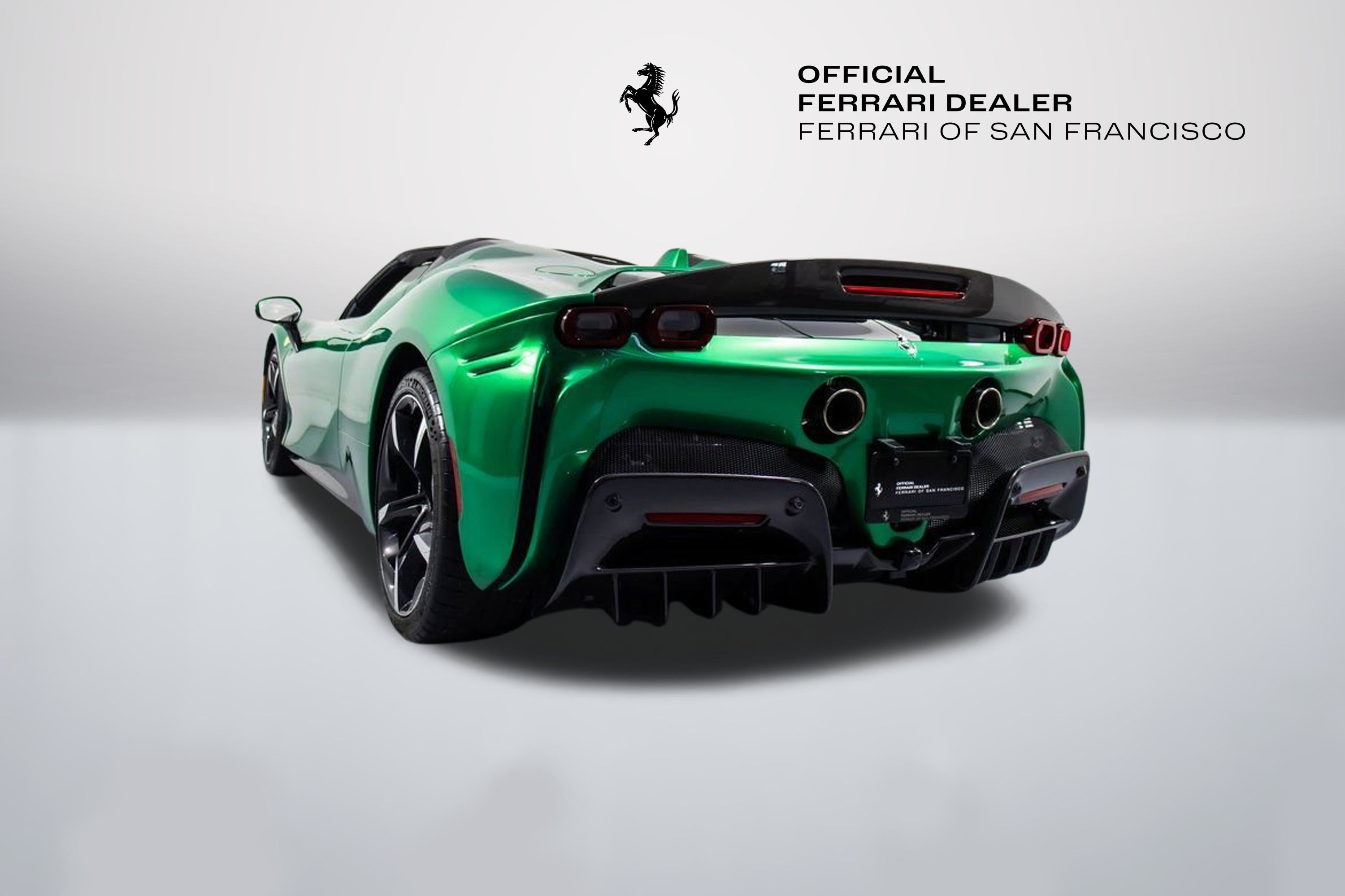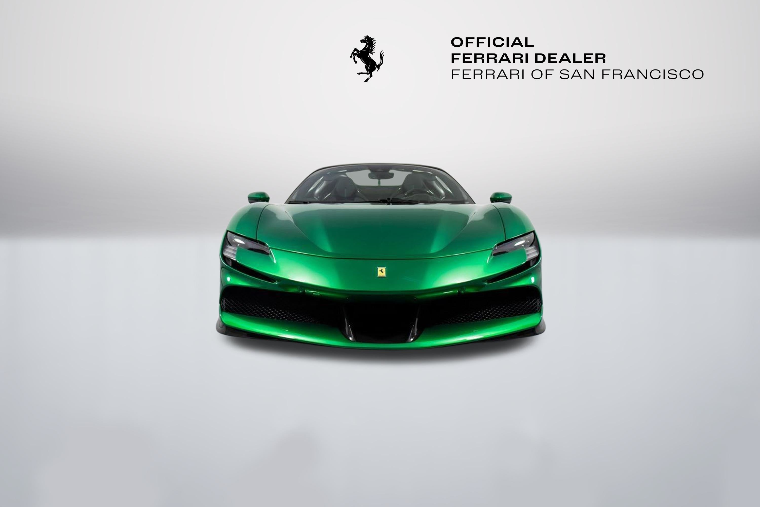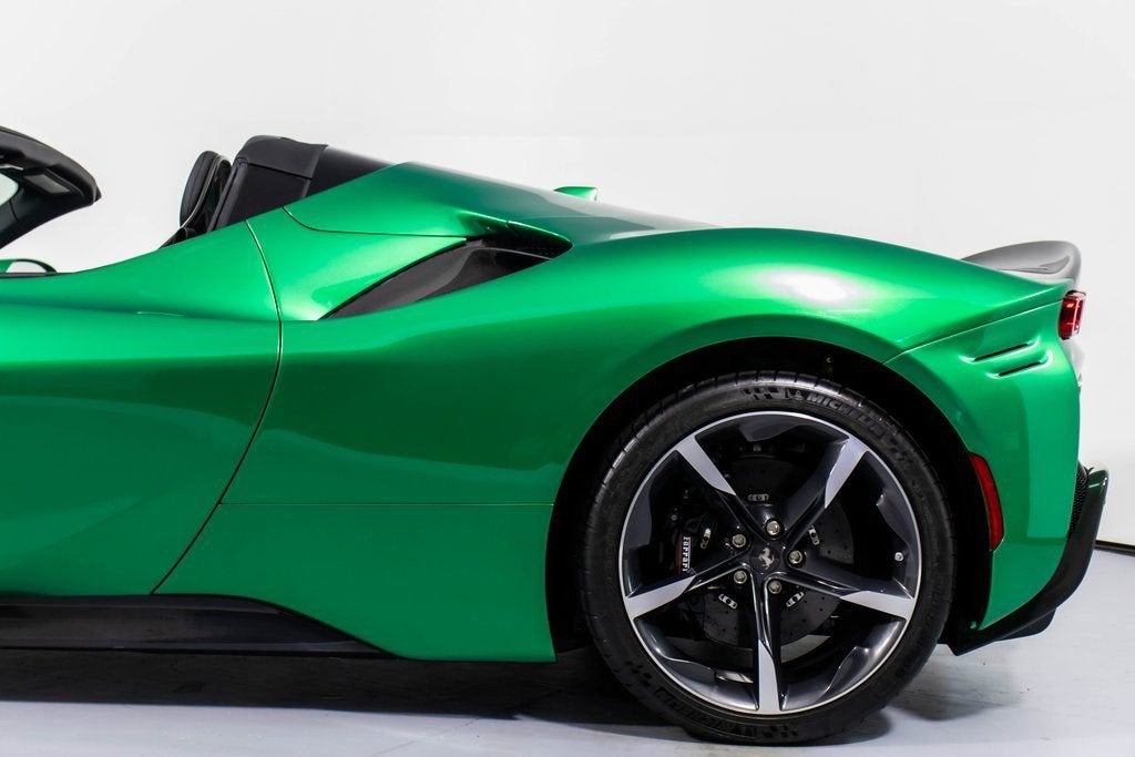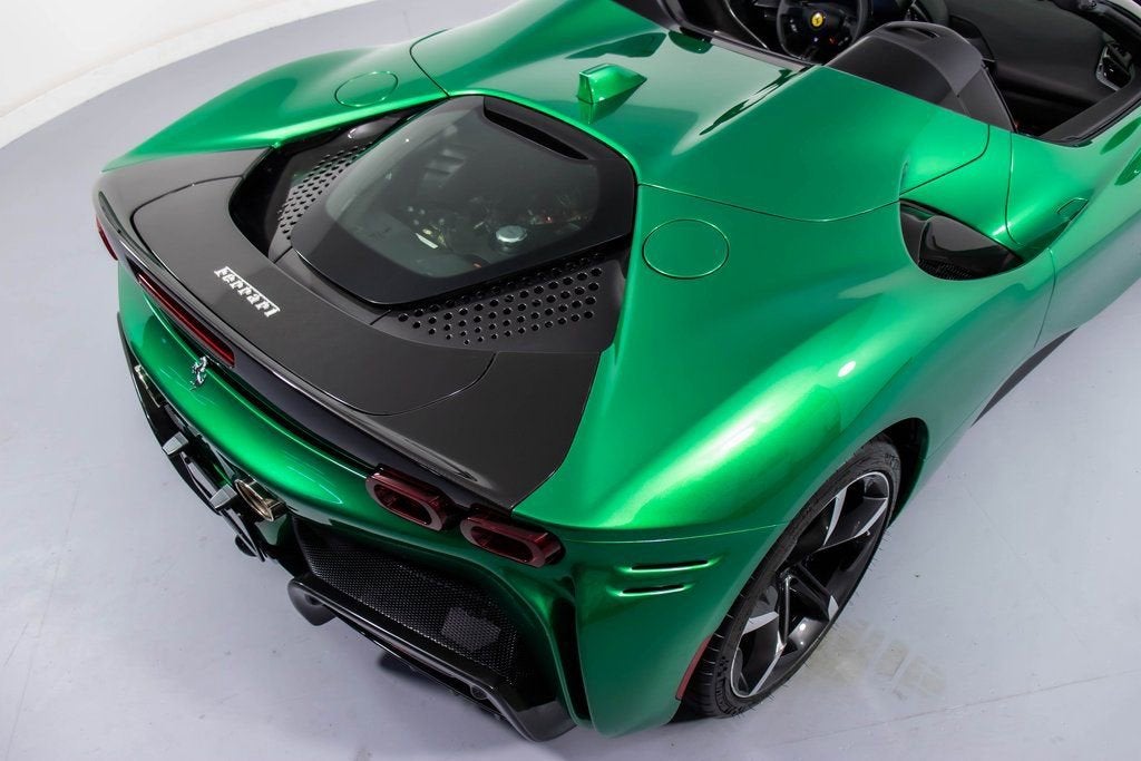 290026 Exterior: Green Jewel Interior: Nero Mats: Nero 2023 Ferrari SF90 Spider Options: Apple CarPlay Sistema AFS America Carrozzeria Bicolore in Nero Back Radar Caliper Freni Nero Lucido Splitter Aria Lat.In Carbonio Parte Cofano Post. In Carbonio Estrattore Post. in Carbonio Rivest.Sottoporta in Carbonio Carbon Fiber Wheel Cups Zona Guida in Carbonio + LEDS Dettagli Abitacolo Colorati CLDT in Pelle Extracampionario in Verde Inesrti Plancia in Carbonio Advanced Front Driving Camera Spoiler Anteriore in Carbonio Pacchetto Fiorano Pacchetto Fiorano Esteso Home Link HW Readiness MyFerrari Connect Scudetti 'Scuderia Ferrari' Specchi Elettrocromici Esterni Sensori Parcheggio Ant. E Post Colori Speciali 4 Strati Sediu Racing in Carbonio in Sedili Racing Taglia Alzasedile Sportivo Cerchi Forgiati Diamantati Sistema HiFi Premium Allestimenti Speciali Colore Cuciture Spec Su Rich in Verde Colonnette Ruota in Titanio This 2023 Ferrari SF90 Spider is a breathtaking expression of hybrid performance and bespoke craftsmanship, finished in rare four-layer Green Jewel with a striking Nero two-tone bodywork treatment. The exterior is elevated by extensive carbon fiber detailing, including the front splitter, rear deck lid, diffuser, underdoor covers, and diamond-finished forged wheels secured by titanium wheel studs, underscoring its Fiorano and Extended Fiorano performance pedigree. Inside, the Nero cabin is accented with special Verde stitching and exclusive extra-range green leather details, complemented by carbon fiber racing seats, a carbon driver zone with LED steering wheel, and carbon dashboard inserts. Advanced technology features such as Apple CarPlay, surround safety systems, parking sensors, premium HiFi audio, and MyFerrari Connect readiness seamlessly blend luxury with innovation. As Ferraris open-top hybrid flagship, this SF90 Spider delivers extraordinary performance, cutting-edge engineering, and unmistakable presence in a truly one-of-a-kind specification.