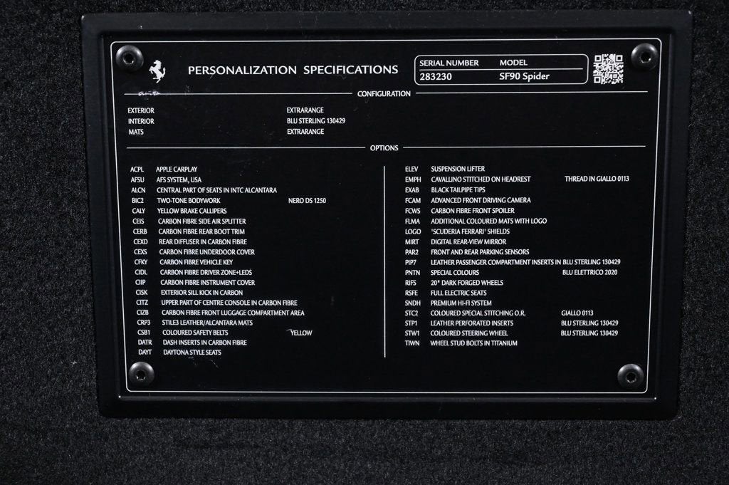 VERY LOW MILES! At just 155 miles, this 2022 Ferrari provides great value. KEY FEATURES AND OPTIONS Comes equipped with: Air Conditioning, Bluetooth, Navigation System. This Ferrari SF90 Spider also includes Clock, Climate Control, Power Passenger Seat, Tachometer, Memory Seat Position, Digital Info Center, Cruise Control, Tilt Steering Wheel, Power Steering, Telescoping Steering Wheel, Power Windows, Steering Radio Controls, Power Mirrors, Leather Steering Wheel, Leather Shifter, Driver Airbag, ABS Brakes, Fog Lights, Passenger Airbag, Traction Control, Intermittent Wipers, Side Airbags, Dynamic Stability, Keyless Entry, Rear Defogger, Security System, AM/FM, Rear Spoiler, Center Arm Rest, Cup Holders, Remote Fuel Door, Remote Trunk Lid, Heated Mirrors, Rear Fog Lamps, Daytime Running Lights, Parking Sensors, Reverse Camera, Roll Stability Control, Adaptive headlights, Heads Up Display, Tire Pressure Monitor, Premium Sound, Carpeted Floor Mats, Overhead Console, HD Radio, Voice Control. Air Conditioning, Climate Control, Cruise Control, Power Steering, Power Windows, Power Mirrors, Leather Steering Wheel, Leather Shifter, Power Passenger Seat, Memory Seat Position, Clock, Tachometer, Digital Info Center, Tilt Steering Wheel, Telescoping Steering Wheel, Steering Wheel Radio Controls, Driver Airbag, Passenger Airbag, Side Airbags, Keyless Entry, Security System, ABS Brakes, Traction Control, Dynamic Stability, Rear Defogger, Fog Lights, Intermittent Wipers, AM/FM, Alloy Wheels, Leather Interior Surface, , Convertible HardTop, 6 Speakers, Radio data system, Automatic temperature control, Heads-Up Display, Power driver seat, Adaptive suspension, Four wheel independent suspension, 4-Wheel Disc Brakes, Ceramic disc brakes: front and rear, Dual front impact airbags, Dual front side impact airbags, Front anti-roll bar, Integrated roll-over protection, Low tire pressure warning, Passenger cancellable airbag, Rear anti-roll bar, Brake assist, Exterior Parking Camera Rear, Rear Parking Sensors, Delay-off headlights, Fully automatic headlights, Bumpers: body-color, Convertible roof wind blocker, Heated door mirrors, Power door mirrors, Spoiler, Apple CarPlay, Compass, Convertible roof lining, Driver door bin, Front reading lights, Illuminated entry, Outside temperature display, Overhead console, Power convertible roof, Sport steering wheel, Standard Seats, Telescoping steering wheel, Voltmeter, Front Center Armrest, Leather Seat Trim, Sport Plus Seats, Passenger door bin, Wheels: 20 x 9.5 Fr & 20 x 11.5 Rr, Glass rear window, Rain sensing wipers Adaptive headlights, Bluetooth, Carpeted Floor Mats, Center Arm Rest, Cup Holders, Daytime Running Lights, Heads Up Display, Heated Mirrors, Navigation System, Overhead Console, Parking Sensors, Premium Sound, Rear Fog Lamps, Rear Spoiler, Rear Spoiler, Remote Fuel Door, Remote Trunk Lid, Reverse Camera, Roll Stability Control, Tire Pressure Monitor - Contact Alvaro Uribe at 786-628-7606 or auribe@ferrariofmiami.com for more information. -