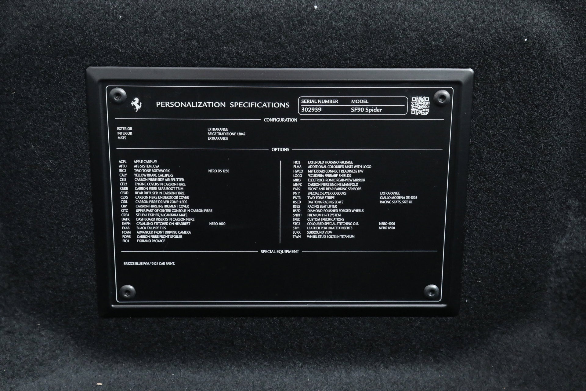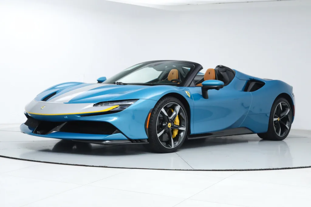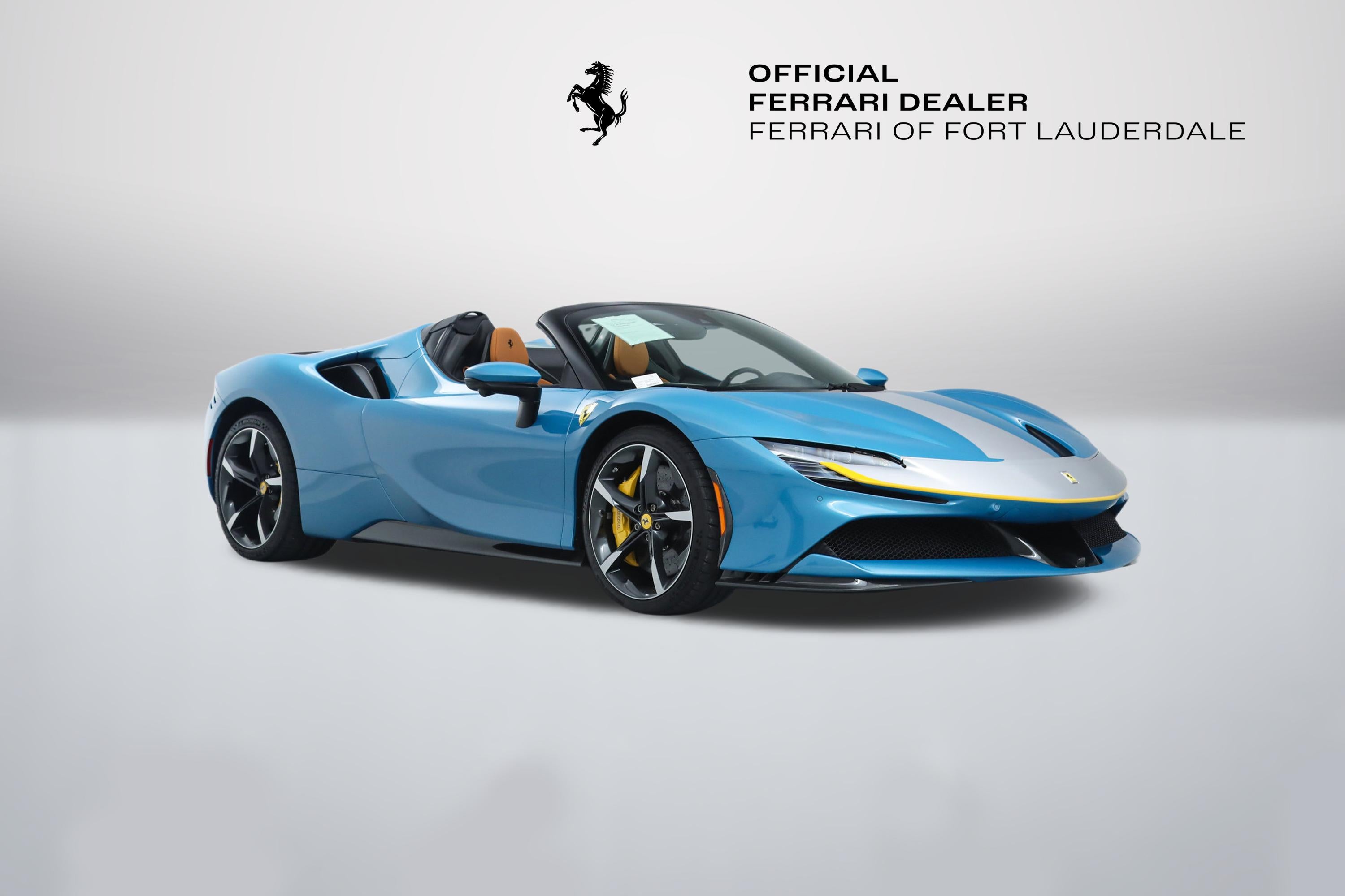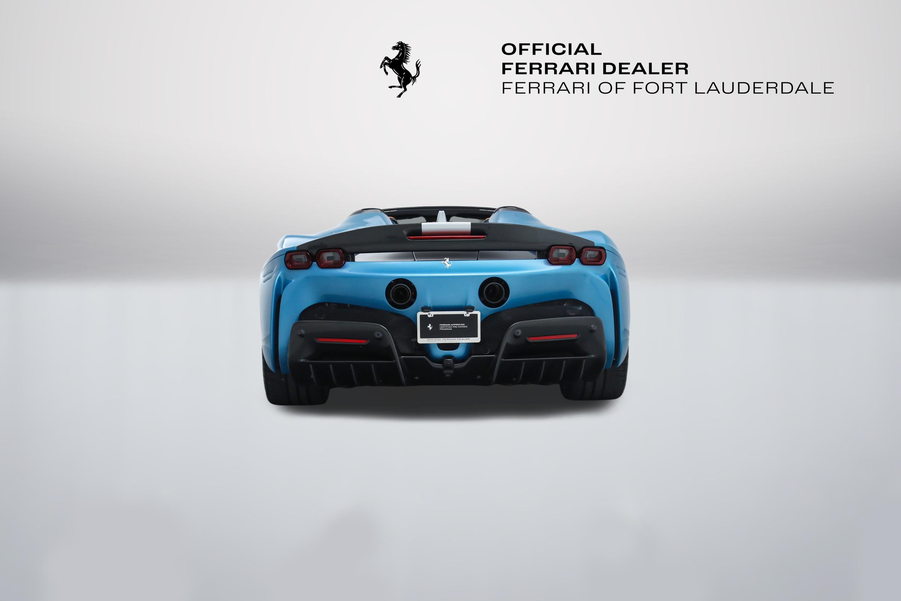 Ferrari SF90 Spider Assetto Fiorano - $843,273 MSRP - NEARLY $267,000 IN OPTIONAL EQUIPMENT - - FERRARI CERTIFIED PRE-OWNED - AVAILABLE EXTENDED FERRARI WARRANTY - - Blu Brezze over Beige - ONE OWNER - Very Low Miles - Pristine Condition - Many Fine Options - Sold as New by Our Dealership - Expertly Maintained by Our Factory Trained Technicians - Ferrari Factory Warranty to 3/7/27 - Complimentary Ferrari Genuine Maintenance Service to 3/7/31 - Factory Options: - Fiorano Package - Special 2-Layer Paint Color - Two-Tone Bodywork - Two-Tone Racing Stripe in Giallo Modena and Argento Nurburgring - Carbon Fiber Front Spoiler - Carbon Fiber Side Air Splitters - Carbon Fiber Engine Manifold - Carbon Fiber Engine Covers - Carbon Fiber Rear Boot Trim - Carbon Fiber Rear Diffuser - Carbon Fiber Underdoor Covers - Carbon Fiber Driver Zone with LED Steering Wheel - Carbon Fiber Dashboard Inserts - Carbon Fiber Instrument Cover - Carbon Fiber Upper Center Console - Carbon Fiber Daytona Racing Seats - Diamond-Polished Forged Wheels - Titanium Wheel Bolts - Yellow Brake Calipers - Scuderia Ferrari Shields - Racing Seat Lifter - Daytona Seat Perforated Inserts in Nero - Cavallino Stitched to Headrests in Nero - Special Stitching in Nero - Leather and Alcantara Floor Mats in Nero - Premium HiFi Sound System - Apple CarPlay - Surround View - Advanced Frontlight System (AFS) - Advanced Front Driving Camera - Electrochromic Rearview Mirror - Front and Rear Parking Sensors - Black Tailpipe Tips This Ferrari has passed a multi-point inspection performed by our factory trained technicians, and has been enrolled in the Ferrari Approved Certified Pre-Owned Program. The Certified program makes available up to two years of additional Ferrari Power Approved Warranty coverage. Please see dealer for more details.