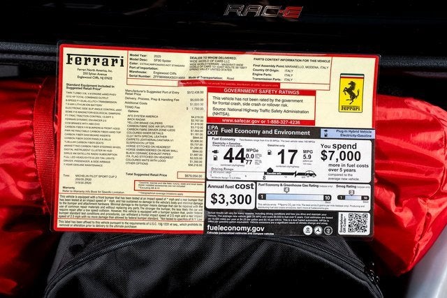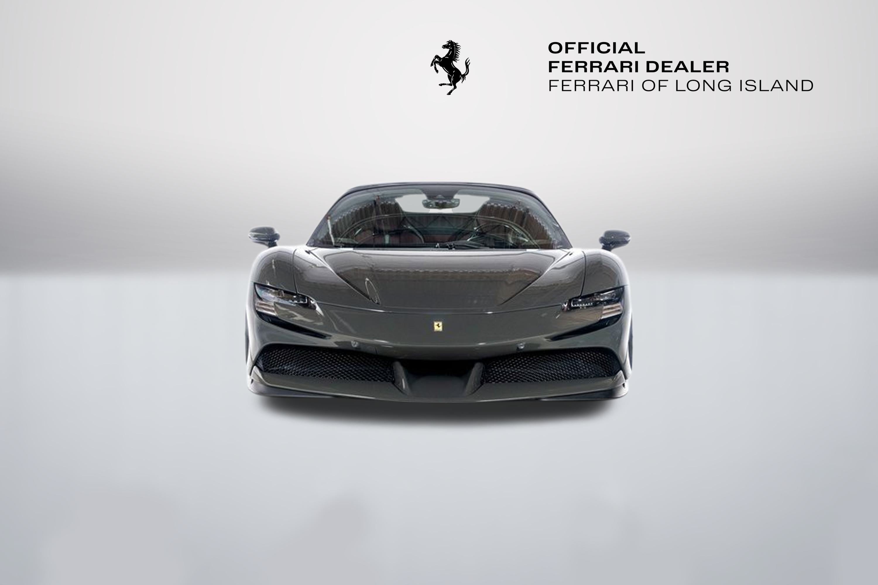 Ferrari of Long Island is excited to present to you the beautiful Ferrari SF90 Spider. Finished in Grigio Scuro over Rosso Ducale interior with Grigio Scuro contrasting stitching. This highly optioned model has the following options. -GIALLO MODENA BRAKE CALIPERS -SCUDERIA FERRARI FENDER SHIELDS -BLACK CERAMIC COATED TAILPIPES -TITANIUM WHEEL STUDS -FORGED/DIAMOND-POLISHED WHEELS WITH GLOSS TECHNICAL GREY FINISH -EMROIDERED CAVALLINO ON HEADREST IN GRIGIO SCURO -ALUMINIUM TACHOMETER DIAL FACE -LONG AND THIN ITALIAN FLAG STITCHED ON HEADREST -STEERING WHEEL WITH ITALIAN STYLE STITCHING -DAYTONA RACING SEATS IN CARBON FIBER -PROTECTIVE FILM FOR FRONT BUMPER -ADVANCED FRONT DRIVING CAMERA -FRONT AND REAR SUSPENSION LIFT -BLIND SPOT DETECTION AND REAR RADAR -PREMIUM HI-FI SYSTEM -APPLE CARPLAY -FRONT PARKING SENSORS This Ferrari has passed a multi-point inspection performed by our factory trained technicians, and has been enrolled in the Ferrari Approved Certified Pre-Owned Program. The Certified program makes available up to two years of additional Ferrari Power Approved Warranty coverage. Please see dealer for more details.
