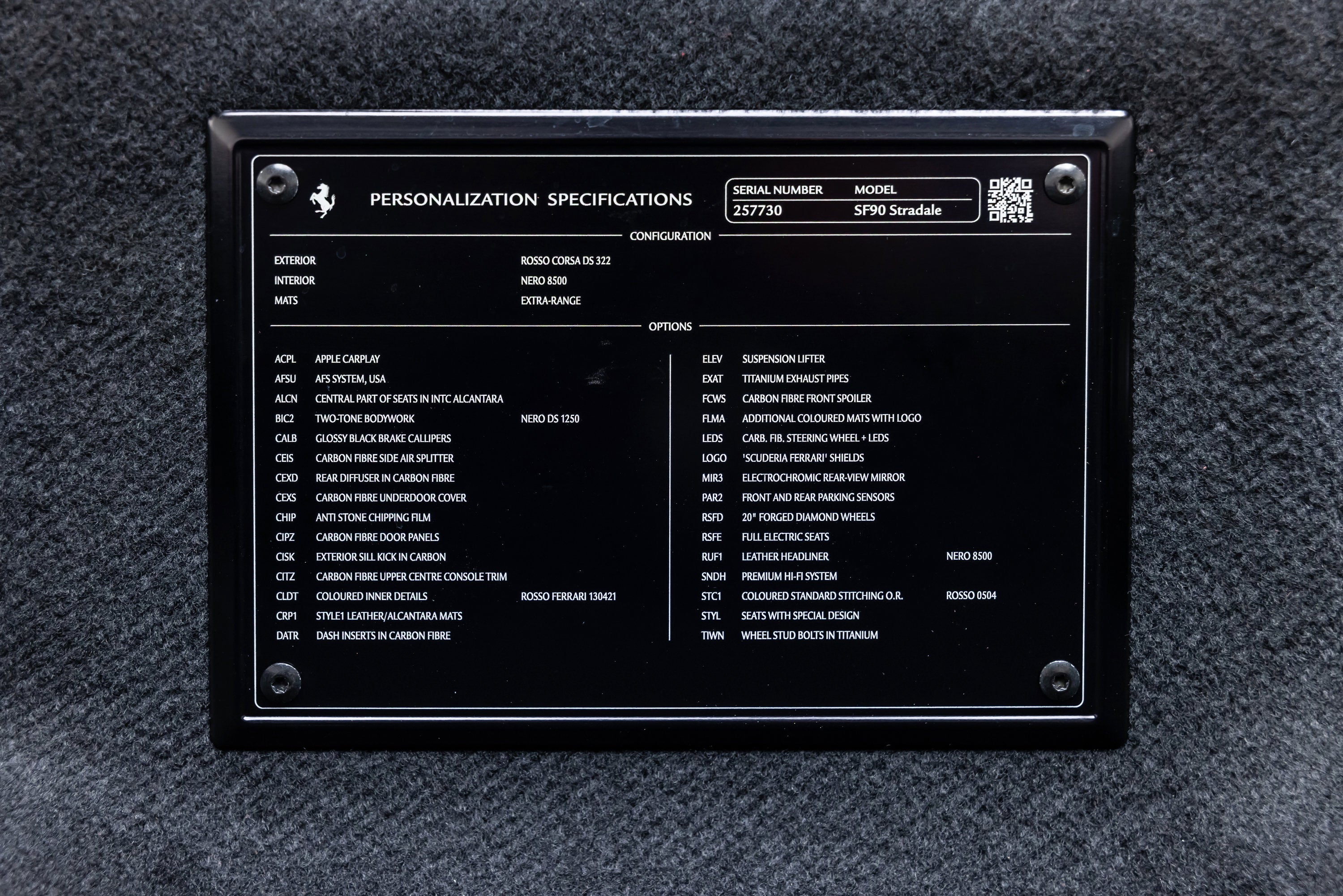 ====== 2021 FERRARI SF90 STRADALE --- ROSSO CORSA OVER NERO --- 4,162 MILES ====== Ferrari of Newport Beach proudly presents this exceptional 2021 Ferrari SF90 Stradale finished in the iconic Rosso Corsa DS 322 exterior over Nero 8500 interior with Extra-Range mats. With just 4,162 miles, this plug-in hybrid hypercar delivers an astonishing 986 combined horsepower from its twin-turbocharged V8 and three electric motors, representing the pinnacle of Ferrari performance and innovation. This SF90 Stradale features an extensive carbon fiber package, two-tone Nero DS 1250 bodywork accents, and stunning 20" Forged Diamond Wheels, making it one of the most visually striking examples available.