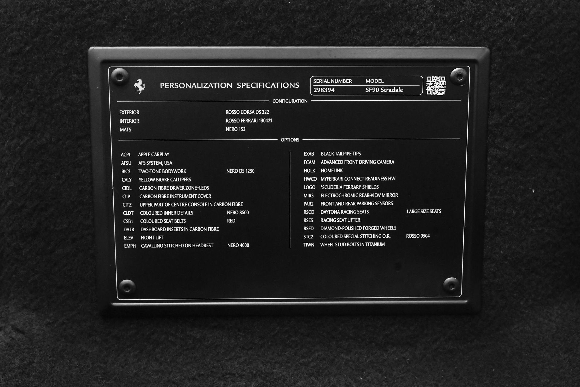 FERRARI OF CENTRAL NEW JERSEY IS PROUD TO PRESENT THIS BEAUTIFUL 2023 Ferrari SF90 Stradale SF90 Stradale, Rosso Corsa WITH Rosso Ferrari Leather. Factory warranty is good till 02/19/2027. External colors : ROSSO CORSA Internal colors : ROSSO FERRARI Carpets colors : NERO TWO TONE BODY PAINTING FORGED WHEELS GR.CORSA DIAMOND YELLOW BRAKE CALIPERS TITANIUM WHEEL BOLTS SUSPENSION LIFTER AFS SYSTEM AMERICA FRONT PARKING SENSORS 'SCUDERIA FERRARI' SHIELDS BLACK CERAMIC EXHAUST PIPES ELECTROCHROM. EXTERIOR MIRRORS ADVANCED FRONT DRIVING CAMERA COLOURED SPECIAL STITCHING COLOR LEATHER SEATS STRIPES DAYTONA RACING SEATS HORSE STITCHED ON HEADREST RACING SEAT LIFTER COLOURED SAFETY BELTS APPLE CARPLAY GARAGE DOOR OPENERS DASHB. STRIPES INSERTS CARBON CARBON FIBRE DASHBOARD INSERTS CARBON FIBRE UPPER TUNNEL TRIM HW READINESS MYFERRARI CONNECT CARBON FIBRE DRIVER ZONE+LEDS Ferrari Approved Details: