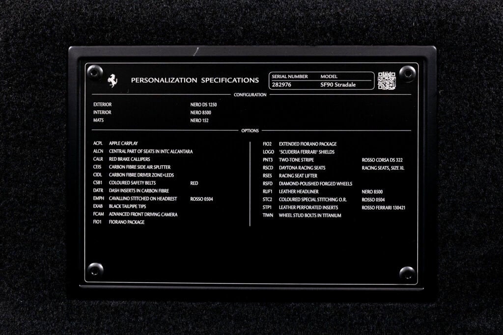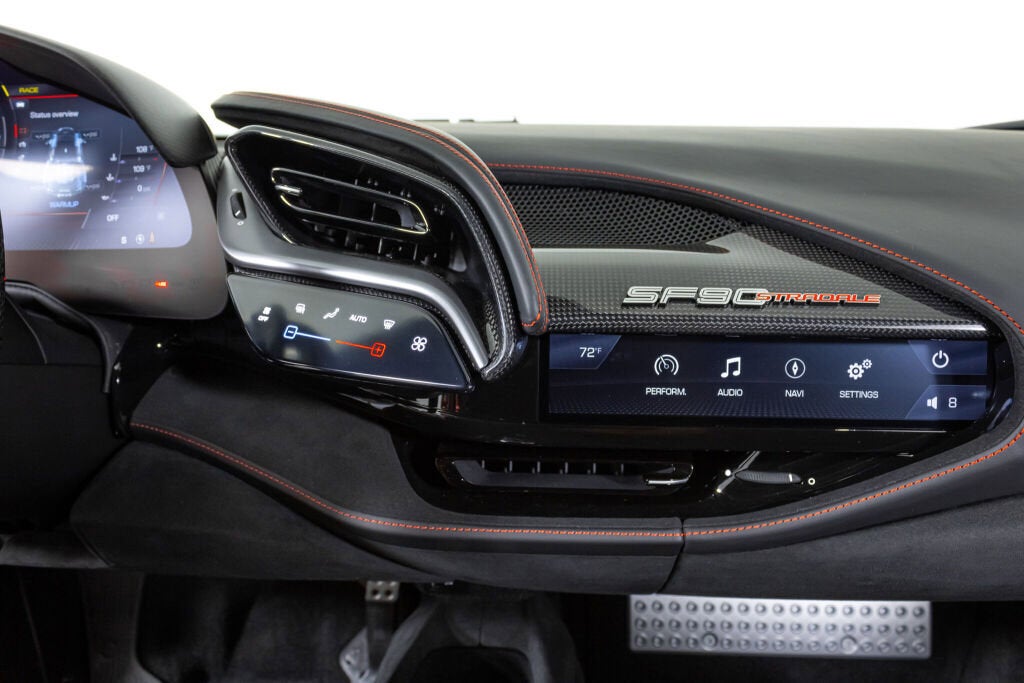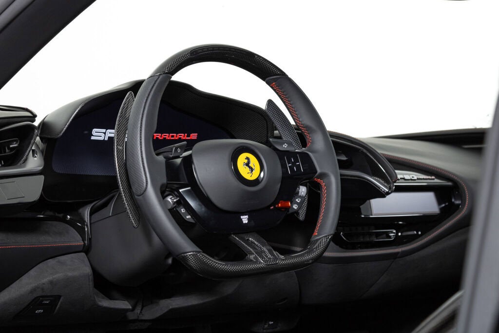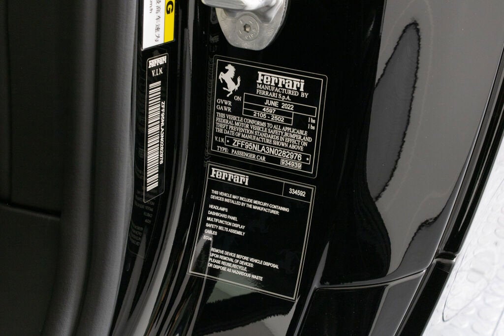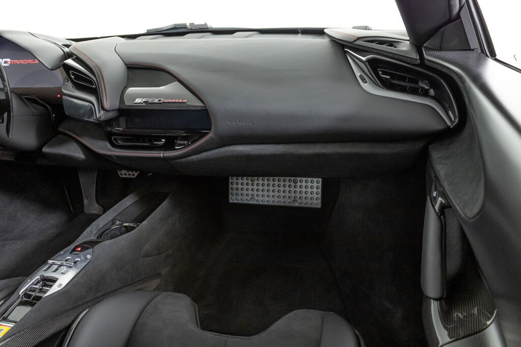 Ferrari Los Angeles proudly presents this stunning 2022 Ferrari SF90 Stradale which was ordered with the very desirable Assetto Fiorano package and is finished in stunning Nero exterior with a complimenting Nero leather interior. The characteristic Assetto Fiorano livery underlines the presence of this powerful Ferrari and is perfectly accentuated with interior leather and stitching details in red. As the fastest car Ferrari has ever produced, and the flagship of the current lineup, the SF90 Stradale represents the best of what Ferrari has to offer. Lapping the Fiorano circuit in just 79 seconds, it is quicker on track than even the infamous LaFerrari and offers a wide range of performance settings that allow the car to be used easily in urban settings as well. Achieving 0-60 mph in a mere 2.5 seconds, the SF90 Stradale topped the charts at both Road and Track and Car and Driver magazines as the fastest car they've ever tested. Completing the standing quarter mile in 9.5 seconds, it is the ultimate expression of automotive performance. Factory Exterior Options: Corsa Diamond Forged Wheels, Red Brake Calipers, Titanium Wheel Bolts, Black Ceramic Exhaust Pipes, 'Scuderia Ferrari' Shields, Carbon Fiber Side Air Splitter, Advanced Front Driving Camera Factory Interior Options: Daytona Racing Seats, Racing Seat Lifter, Coloured Special Stitching (Filo Speciale Rosso), Horse Stitched on Headrest (Rosso), Coloured Safety Belts (Rosso), Alcantara Central Seat Inserts, Coloured Leather Seat Stipes (Rosso Ferrari), Leather Headliner (Nero), Apple Carplay Ferrari Factory Warranty - 08/19/2025 Ferrari Genuine Maintenance Program - 08/19/2029 Please contact our Ferrari Los Angeles sales team for further information or to schedule your appointment.