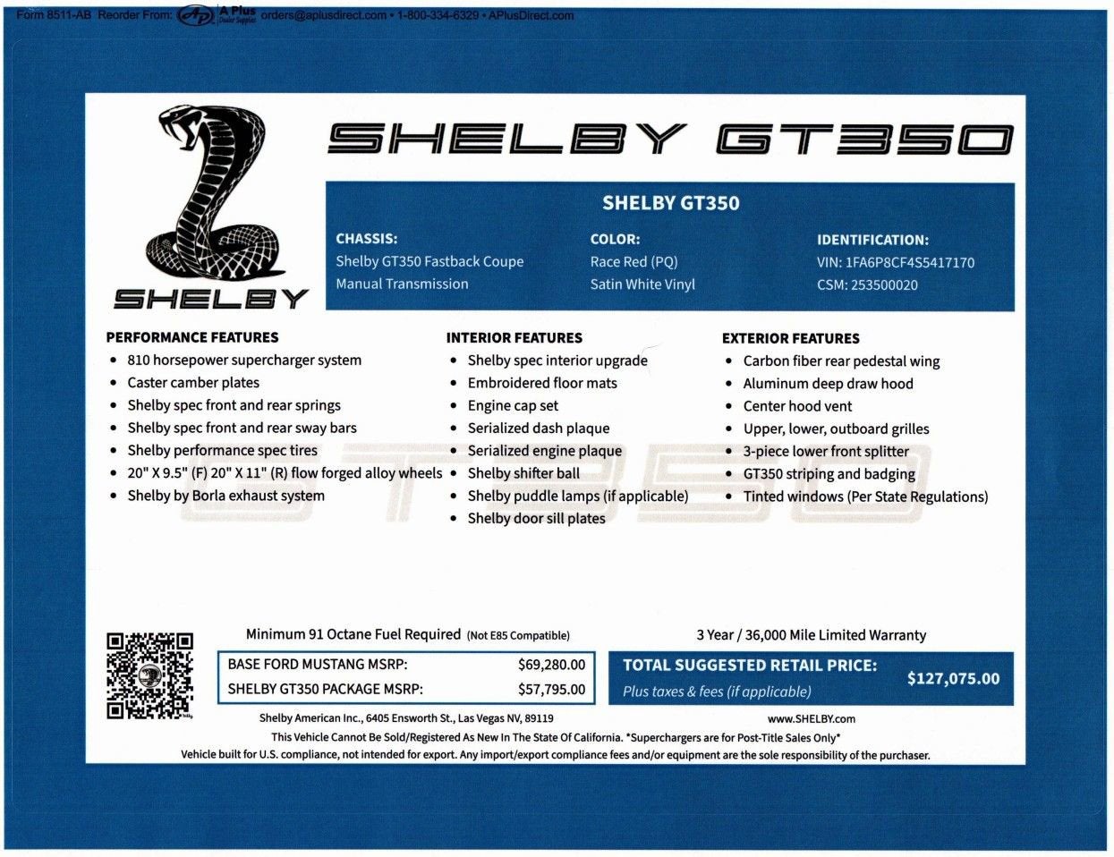 Porsche St. Louis is proud to present this Pre-Owned 2025 Shelby GT350. Finished in head-turning Race Red with Satin White Vinyl striping, this modern muscle car brings together classic Shelby heritage with modern performance enhancements for an unforgettable driving experience. Performance: Under the hood lies a ferocious 5.0L V8 engine equipped with an 810-horsepower supercharger system, mated to a manual transmission for ultimate driver engagement. Upgraded with Shelby-specific front and rear springs, sway bars, caster camber plates, and performance tires, this GT350 is fine-tuned for both everyday excitement and track-level capability. Additional Protection: Xpel Essentials - $549 StarGard Theft Recovery System - $995 Options and Features: Shelby GT350 Fastback Coupe (Manual Transmission) Race Red with Satin White Vinyl Striping Shelby 810 Horsepower Supercharger System Caster Camber Plates Shelby Spec Front and Rear Springs Shelby Spec Front and Rear Sway Bars Shelby Performance Spec Tires 20"" x 9.5"" (Front) / 20"" x 11"" (Rear) Flow Forged Alloy Wheels Shelby by Borla Cat-Back Exhaust System with Tips Carbon Fiber Rear Pedestal Wing Aluminum Deep Draw Hood with Center Vent Upper, Lower, and Outboard Grilles 3-Piece Lower Front Splitter GT350 Striping and Badging Tinted Windows (Per State Regulations) All-Leather Seat Covers Shelby Shifter Ball (Manual Only) Embossed Floor Mats Shelby Door Sill Plates Serialized Dash and Engine Plaques Engine Cap Set Puddle Lamps (If Equipped) This 2025 Shelby GT350 is a limited-production performance machine celebrating 60 years of Shelby legacy, built with unmatched craftsmanship and muscle now available at Porsche St. Louis. Porsche St. Louis, located at 2970 S Hanley Road in St. Louis, Missouri, is your gateway to the world of luxury and high-performance Porsche vehicles. The dealership embodies the essence of Porsche with a commitment to excellence and a deep passion for these iconic sports cars. Porsche St. Louis has the capability to sell and deliver vehicles to customers throughout the United States. As a member of the Indigo Auto Group, Porsche St. Louis embodies the same commitment to excellence and passion for luxury vehicles that define the group as a whole. To get the most accurate and up-to-date information regarding Porsche St. Louis's services and vehicle availability please visit our official website at porschestlouis.com or call us directly at 314-312-1900.