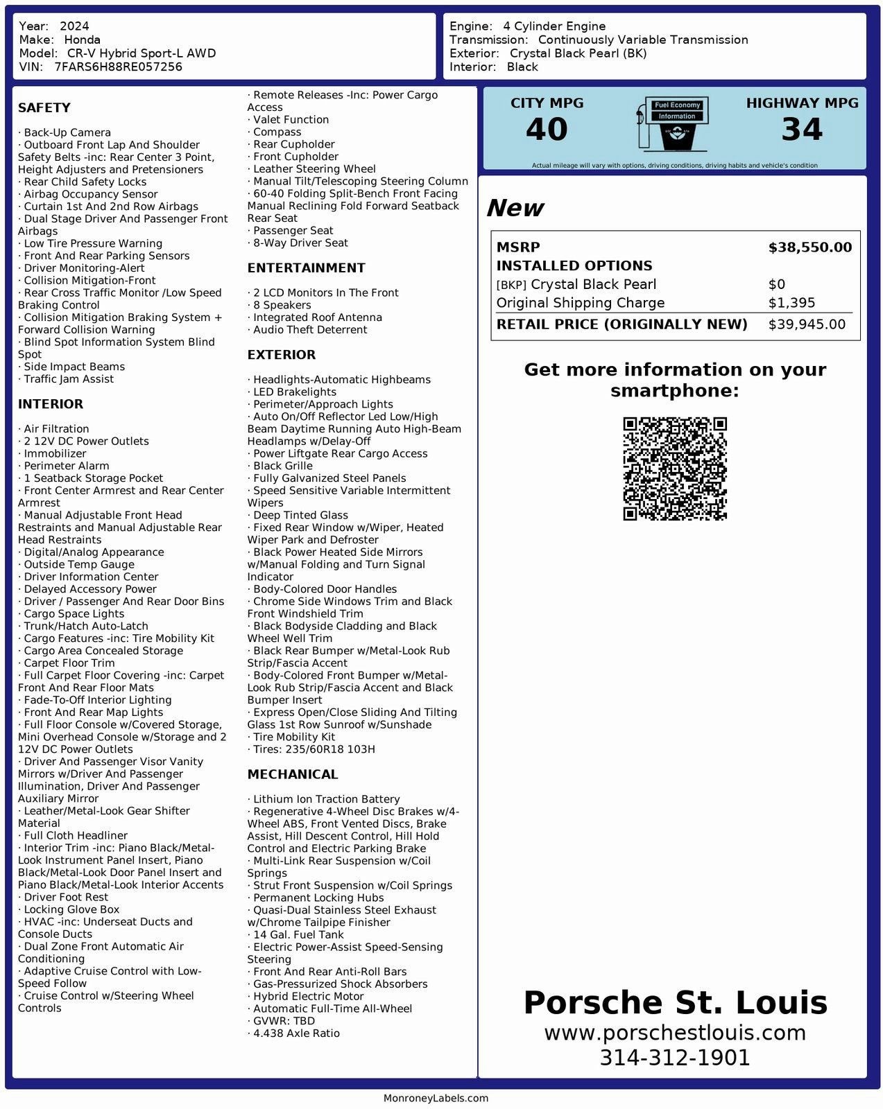 Porsche St. Louis is proud to present this Pre-Owned 2024 Honda CR-V Hybrid Sport-L AWD. Finished in Crystal Black Pearl over a refined Black Interior, this CR-V Hybrid delivers impressive efficiency, modern technology, and confident all-weather capability. Performance: Powered by a 2.0L 4-cylinder engine paired with Hondas advanced hybrid electric motor system, this CR-V Hybrid produces a combined 204 horsepower and 247 lb-ft of torque. The Continuously Variable Transmission (CVT) works seamlessly with the hybrid system to deliver smooth acceleration and outstanding efficiency, achieving up to 40 MPG city and 34 MPG highway. All-Wheel Drive provides added confidence in varying road conditions while maintaining excellent ride comfort. Additional Protection: Xpel Essentials - $549 StarGard Theft Recovery System - $995 CR-V Hybrid Sport-L AWD Black Interior Crystal Black Pearl All-Wheel Drive Hybrid Electric Motor with Lithium-Ion Battery Power Liftgate Glass Sunroof Dual Zone Automatic Climate Control Adaptive Cruise Control with Low-Speed Follow Blind Spot Information System Collision Mitigation Braking System Rear Cross Traffic Monitor Front and Rear Parking Sensors Leather Steering Wheel 8-Speaker Audio System Apple CarPlay & Android Auto Integration This 2024 Honda CR-V Hybrid Sport-L AWD represents a smart blend of efficiency, comfort, and modern safety technology, available now at Porsche St. Louis. This pre-owned vehicle has been carefully inspected to meet our high standards of quality and performance. Porsche St. Louis, located at 2970 S Hanley Road in St. Louis, Missouri, is your gateway to the world of luxury and high-performance Porsche vehicles. The dealership embodies the essence of Porsche with a commitment to excellence and a deep passion for these iconic sports cars. Porsche St. Louis has the capability to sell and deliver vehicles to customers throughout the United States. As a member of the Indigo Auto Group, Porsche St. Louis embodies the same commitment to excellence and passion for luxury vehicles that define the group as a whole. To get the most accurate and up-to-date information regarding Porsche St. Louis's services and vehicle availability please visit our official website at porschestlouis.com or call us directly at 314-312-1900.
