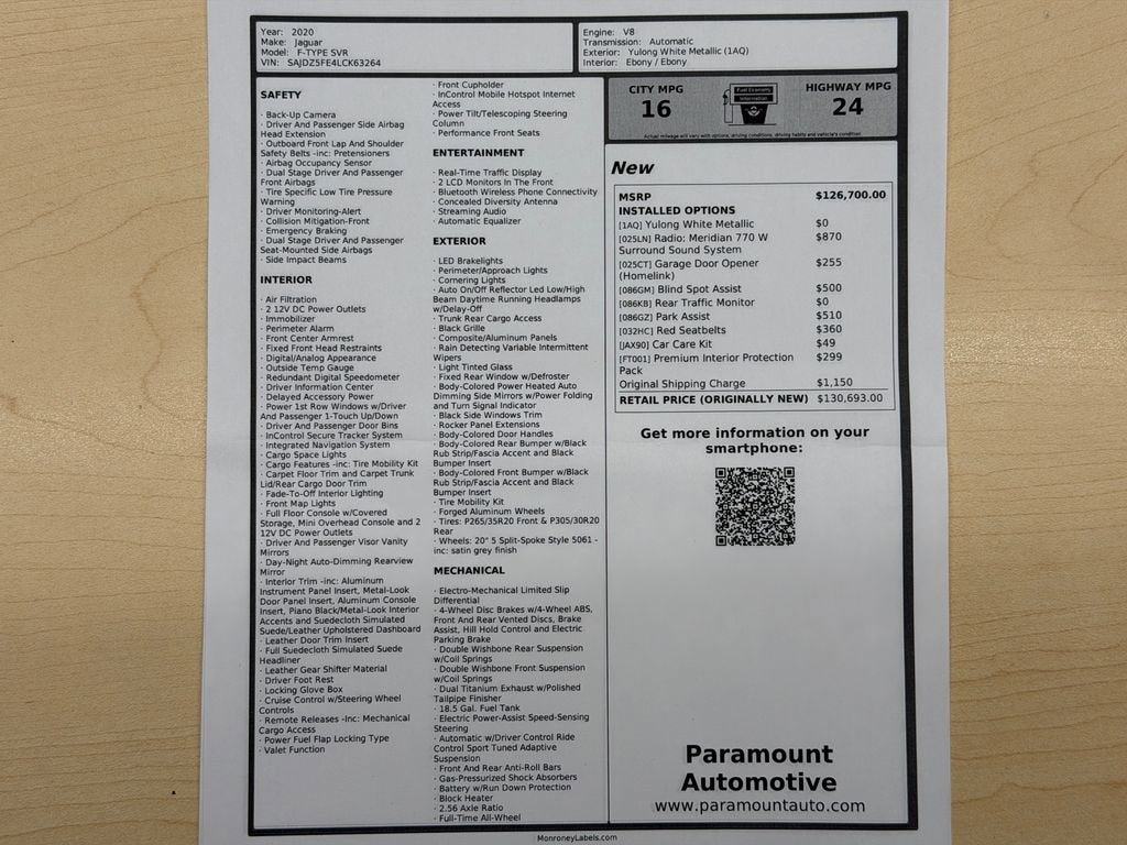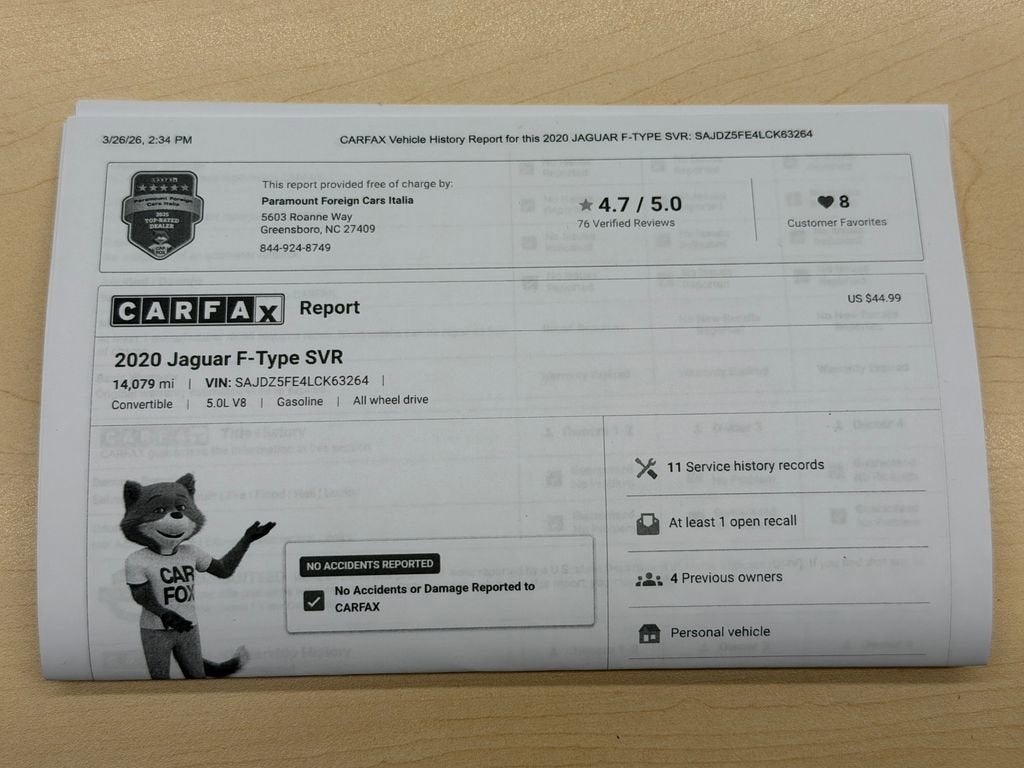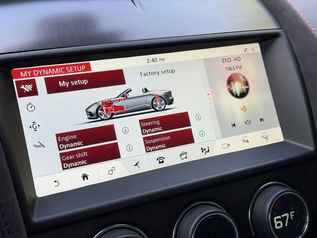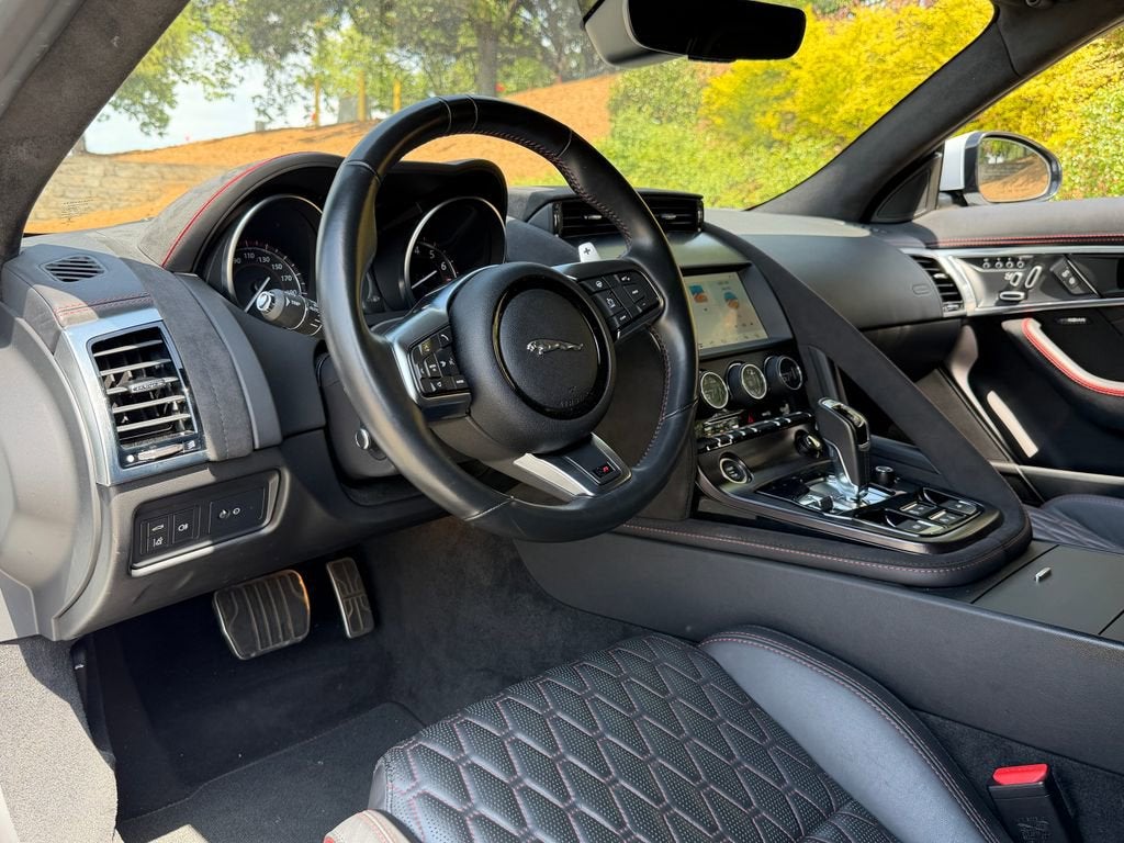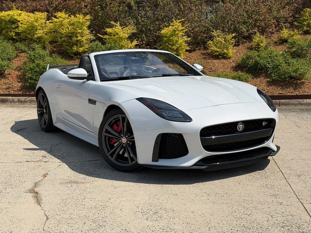 Elevate your driving experience with this exceptional 2020 Jaguar F-TYPE SVR. Boasting a powerful 5.0L V8 Supercharged engine, paired with an 8-Speed Automatic transmission and All-Wheel Drive, this sports car delivers exhilarating performance and unparalleled control on the road. - 10 Speakers - Meridian 380W Audio System - Adaptive Suspension - Fully Automatic Headlights - Apple CarPlay/Android Auto - Heated Steering Wheel - Performance Front Seats - Power Convertible Roof - Navigation System - Exterior Parking Camera Rear Finished in a stunning White exterior, the F-TYPE SVR commands attention with its bold, aerodynamic design and sleek lines. Step inside and you'll be enveloped in a premium cabin, featuring Lozenge Quilted Leather Seating Surfaces and a host of advanced technology features to enhance your driving experience. This Jaguar F-TYPE SVR is the perfect blend of style, power, and sophistication. With its impressive fuel efficiency, delivering 16 MPG in the city and 24 MPG on the highway, you can enjoy thrilling performance without sacrificing practicality. Discover the true essence of driving passion with this exceptional 2020 Jaguar F-TYPE SVR. Schedule a test drive today and experience the unmatched joy of commanding the road.