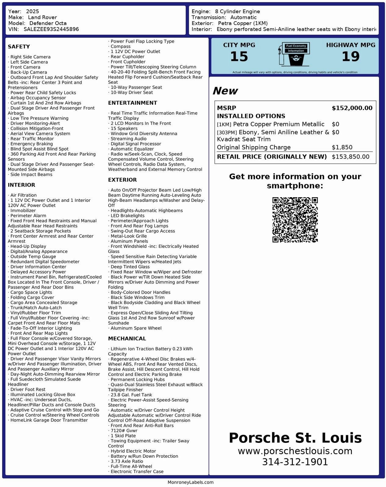 Porsche St. Louis is proud to present this Used 2025 Land Rover Defender OCTA. Finished in stunning Petra Copper Premium Metallic over luxurious Ebony Semi-Aniline Leather with Kvadrat seat trim, this flagship Defender delivers exceptional off-road capability with modern luxury and advanced technology. Performance: Powered by a potent 8-cylinder engine paired with an automatic transmission, the Defender OCTA pushes out 493 horsepower and 461 lb-ft of torque. Full-time all-wheel drive, adaptive suspension with ride-height control, and a 3.73 axle ratio provide the ultimate combination of on-road composure and off-road dominance. Defender OCTA (MY25) Ebony Semi-Aniline Leather & Kvadrat Interior Petra Copper Premium Metallic Additional Protection: Xpel Essentials $549 StarGard Theft Recovery System $995 Express Open/Close Sliding & Tilting Glass 1st and 2nd Row Sunroof w/Power Sunshade Black Power Heated Side Mirrors with Power Folding LED Headlamps with Auto High Beam and Washers Front & Rear Fog Lamps LED Brake lights and Signature Daytime Running Lights Swing-Out Rear Cargo Door Heated Electrically Operated Windshield Aluminum Body Panels with Black Trim Accents 23.8-Gallon Fuel Tank Adaptive Off-Road Suspension with Adjustable Height Control Tow Equipment with Trailer Sway Control 360-Degree Parking Aid with Aerial View Camera Blind Spot Assist Rear Traffic Monitor and Rear Cross Path Detection Emergency Braking and Collision Mitigation Side, Curtain, and Dual Front Airbags Full Simulated Suede Headliner Heated & Ventilated Front Seats Heated Rear Seats with 40/20/40 Split-Fold Power Tilt/Telescoping Steering Column Head-Up Display HomeLink Garage Door Transmitter 15-Speaker Premium Audio System Apple CarPlay / Android Auto 12V and 120V Power Outlets Digital Driver Display and Redundant Speedometer Refrigerated/Cooled Console Storage Bin Trunk Auto-Latch with Concealed Storage Adaptive Cruise Control with Stop & Go Speed-Sensitive Rain-Sensing Wipers This 2025 Land Rover Defender OCTA redefines what a luxury off-roader can be. Now available at Porsche St. Louis, this locally traded used vehicle has been thoroughly inspected and is ready to take on any terrain with style. Porsche St. Louis, located at 2970 S Hanley Road in St. Louis, Missouri, is your gateway to the world of luxury and high-performance Porsche vehicles. The dealership embodies the essence of Porsche with a commitment to excellence and a deep passion for these iconic sports cars. Porsche St. Louis has the capability to sell and deliver vehicles to customers throughout the United States. As a member of the Indigo Auto Group, Porsche St. Louis embodies the same commitment to excellence and passion for luxury vehicles that define the group as a whole. To get the most accurate and up-to-date information regarding Porsche St. Louis's services and vehicle availability please visit our official website at porschestlouis.com or call us directly at 314-312-1900.